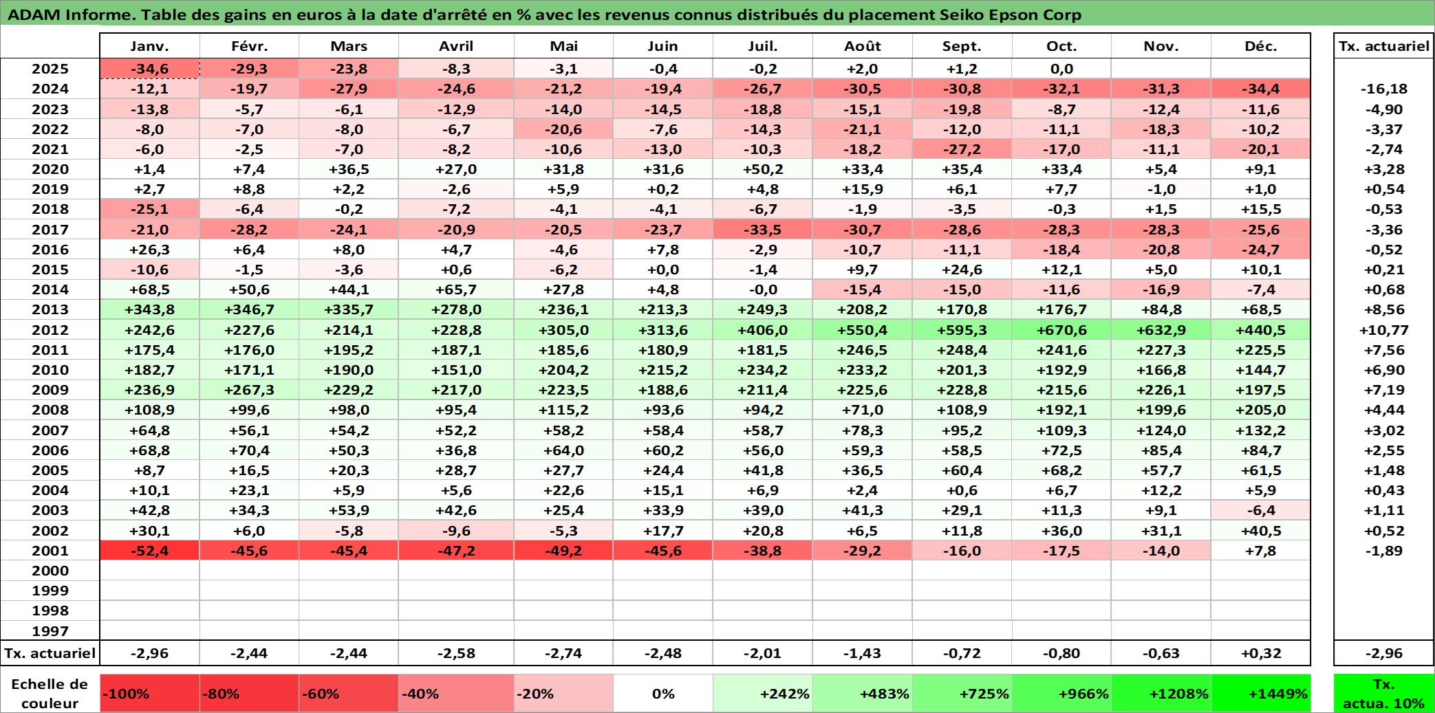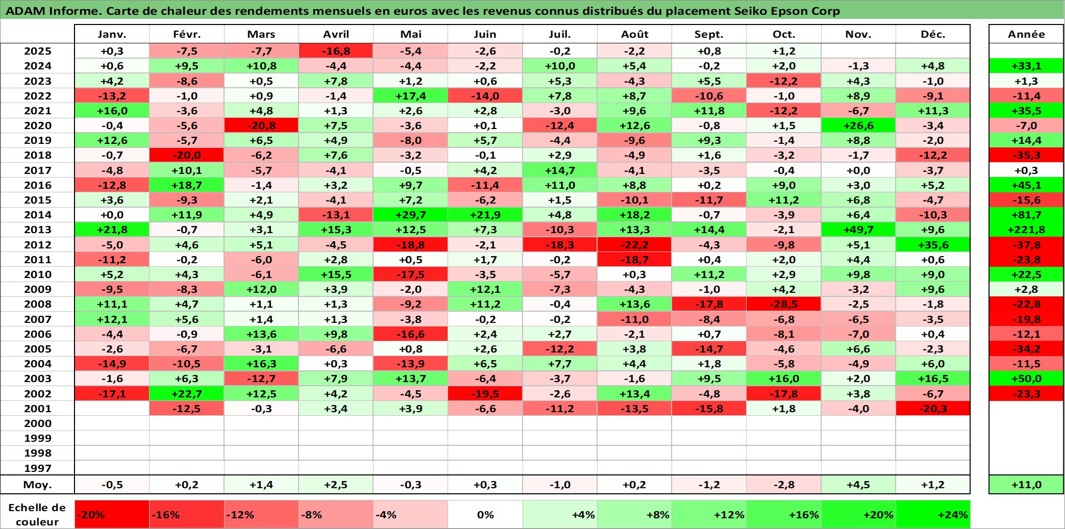 Site dédié aux investisseursPage dédiée sur site financeAnalyse des valorisations hebdomadaires de l'action Seiko Epson Corp. Cet actif est cote en JPY. Les valorisations sont en contrevaleur EURO et couvrent les semaines 2001W02 a 2025W40. Les revenus de cet actif financier sont pris en compte depuis la semaine 2003W39. La note globale ESG de cet actif est estimee a 14.0 (apres rebasage entre 0 et 20).