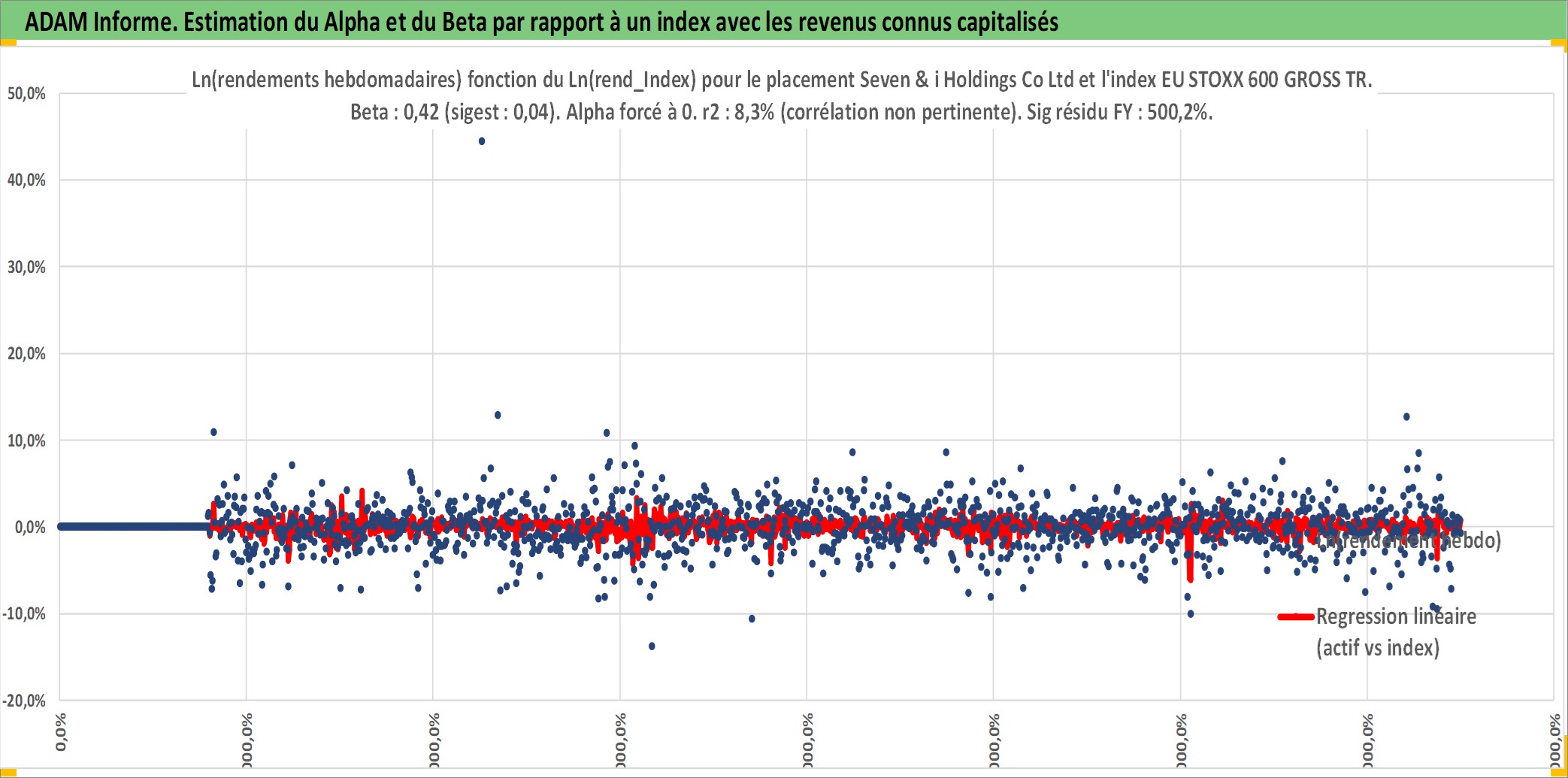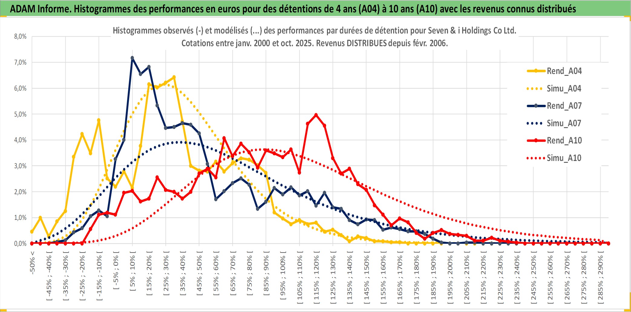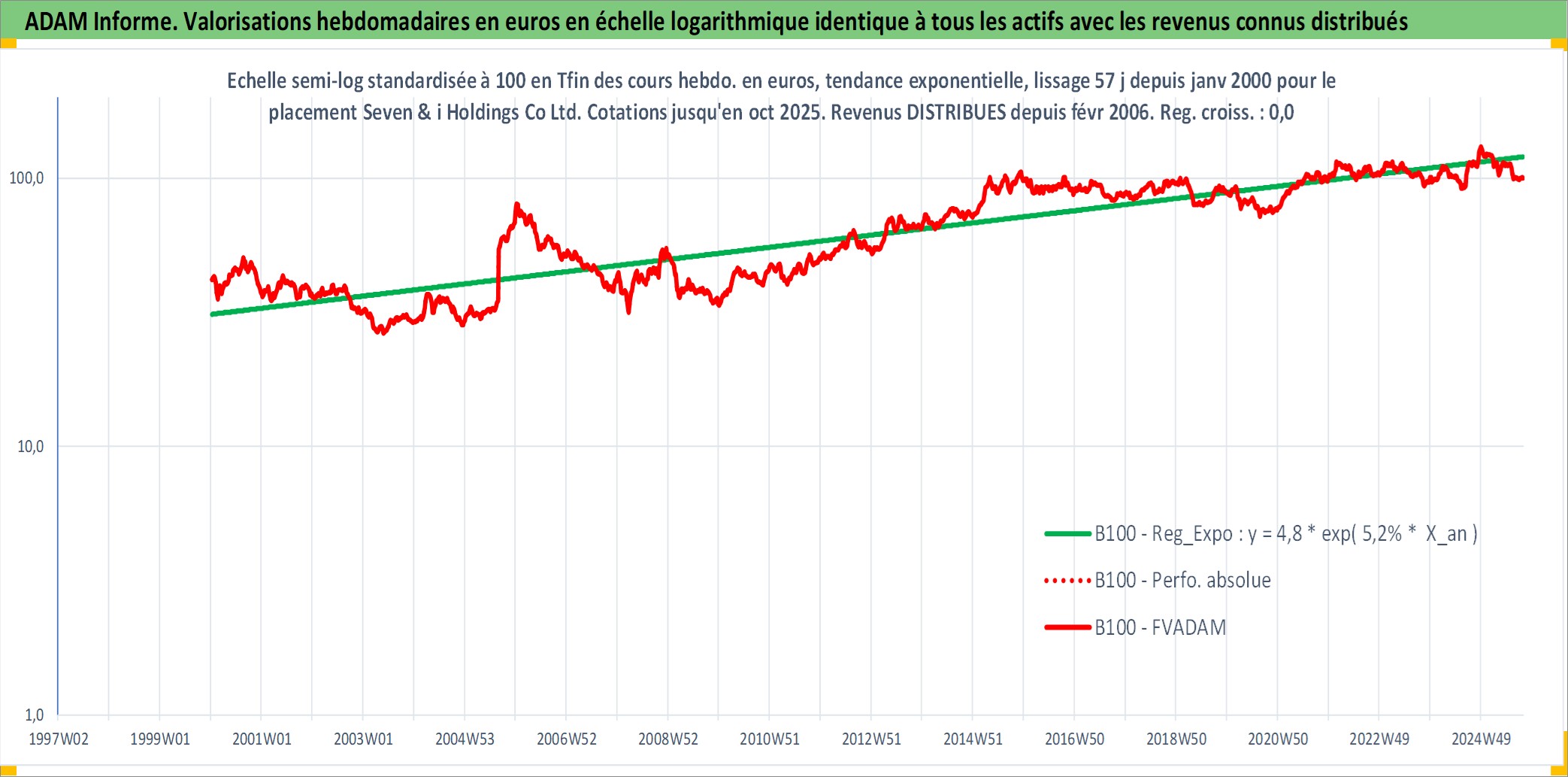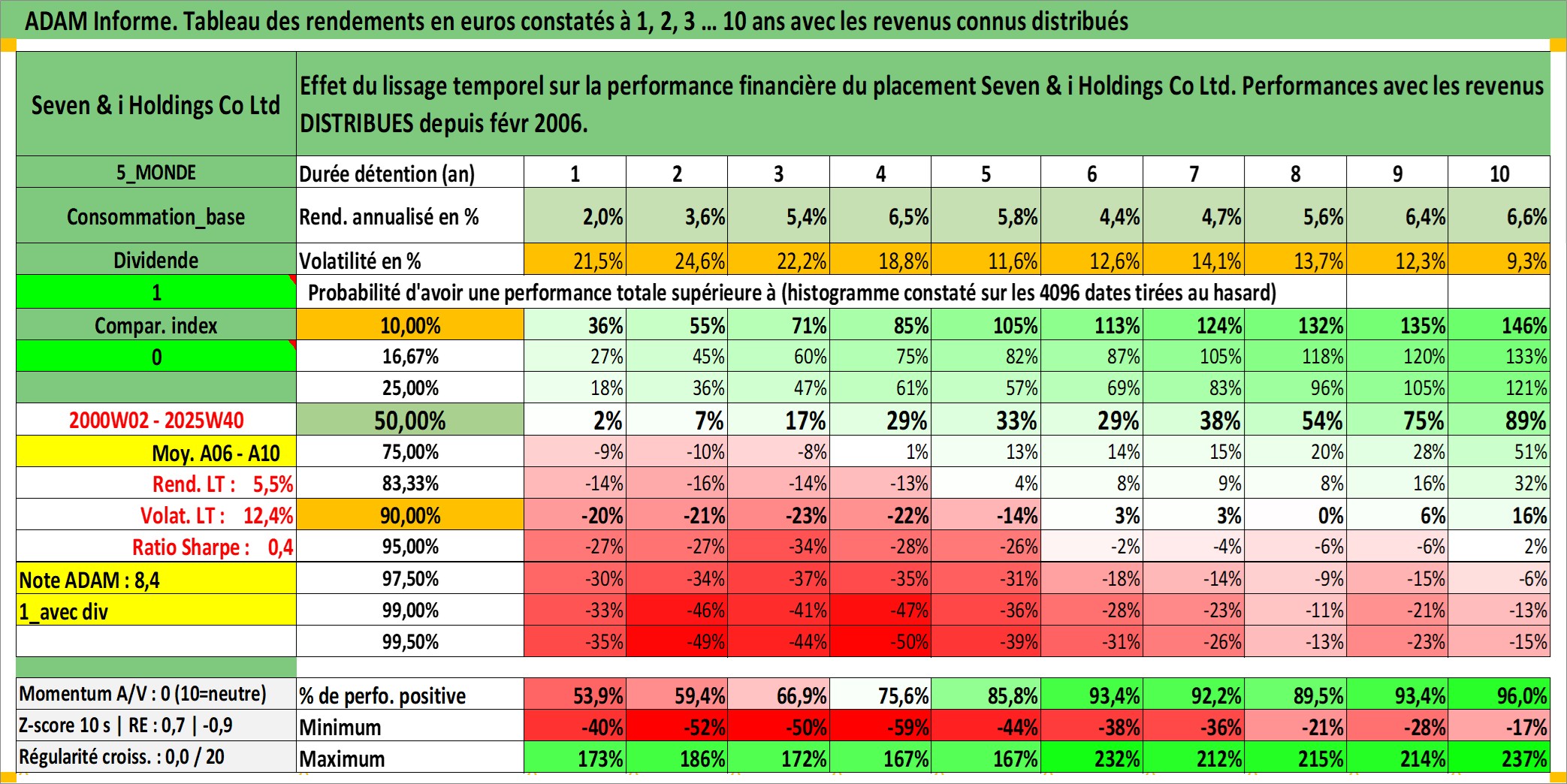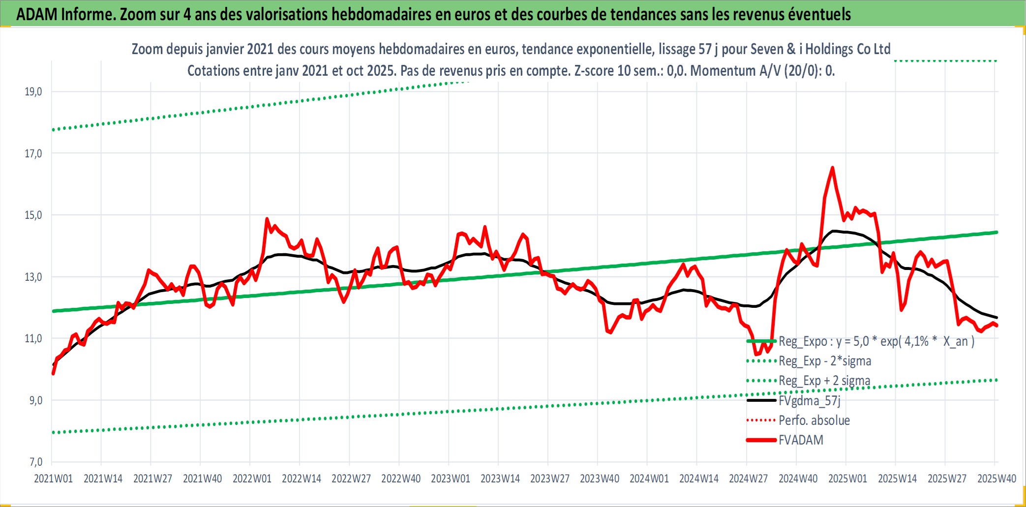 Site dédié aux investisseursPage dédiée sur site financeAnalyse des valorisations hebdomadaires de l'action Seven & i Holdings Co Ltd. Cet actif est cote en JPY. Les valorisations sont en contrevaleur EURO et couvrent les semaines 2000W02 a 2025W40. Les revenus de cet actif financier sont pris en compte depuis la semaine 2006W08. La note globale ESG de cet actif est estimee a 10.0 (apres rebasage entre 0 et 20).