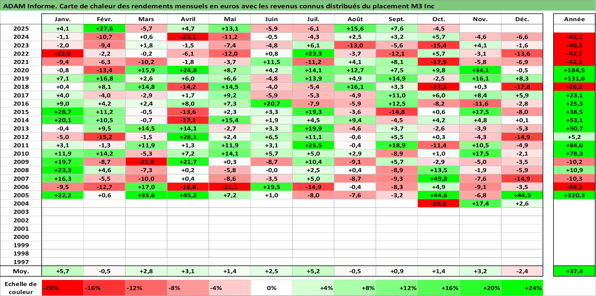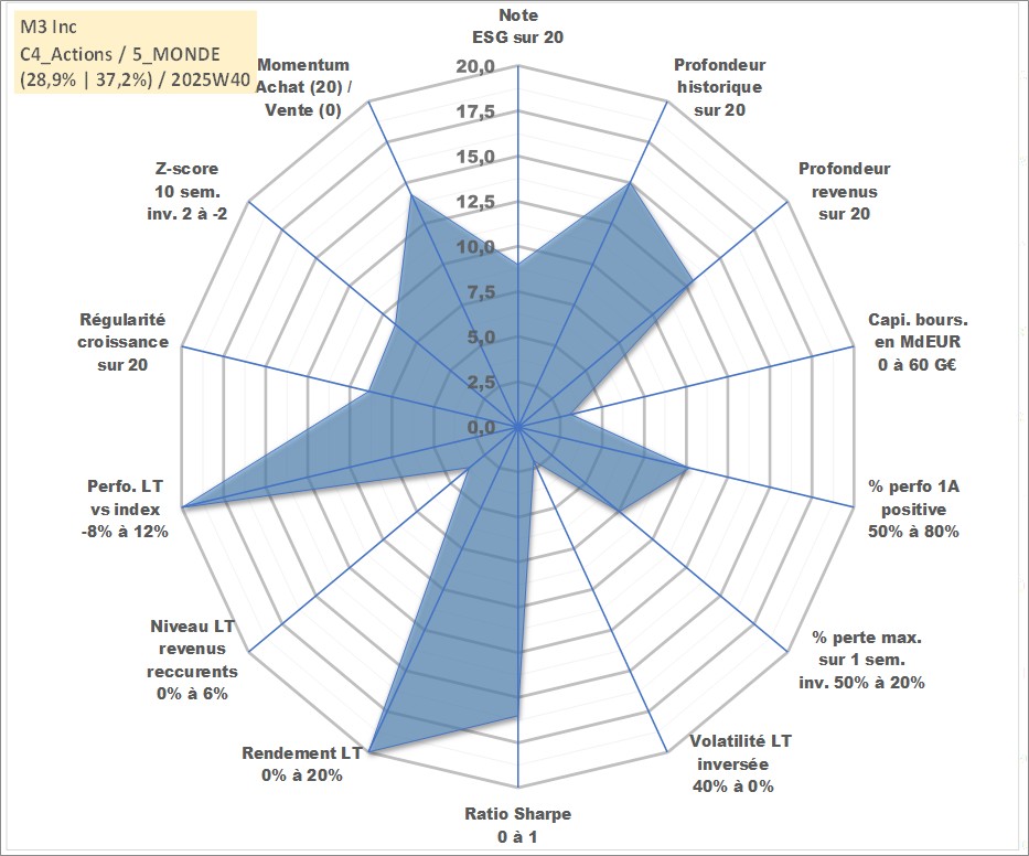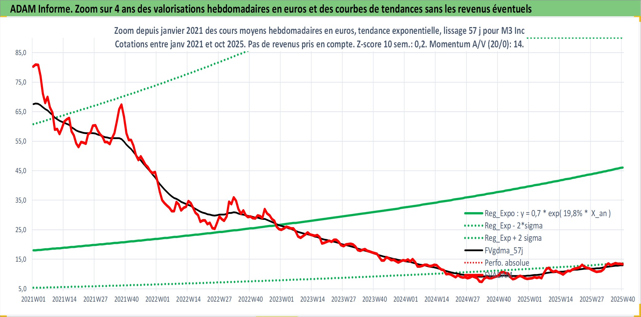 Site dédié aux investisseursPage dédiée sur site financeAnalyse des valorisations hebdomadaires de l'action M3 Inc. Cet actif est cote en JPY. Les valorisations sont en contrevaleur EURO et couvrent les semaines 2004W39 a 2025W40. Les revenus de cet actif financier sont pris en compte depuis la semaine 2008W13. La note globale ESG de cet actif est estimee a 9.0 (apres rebasage entre 0 et 20).