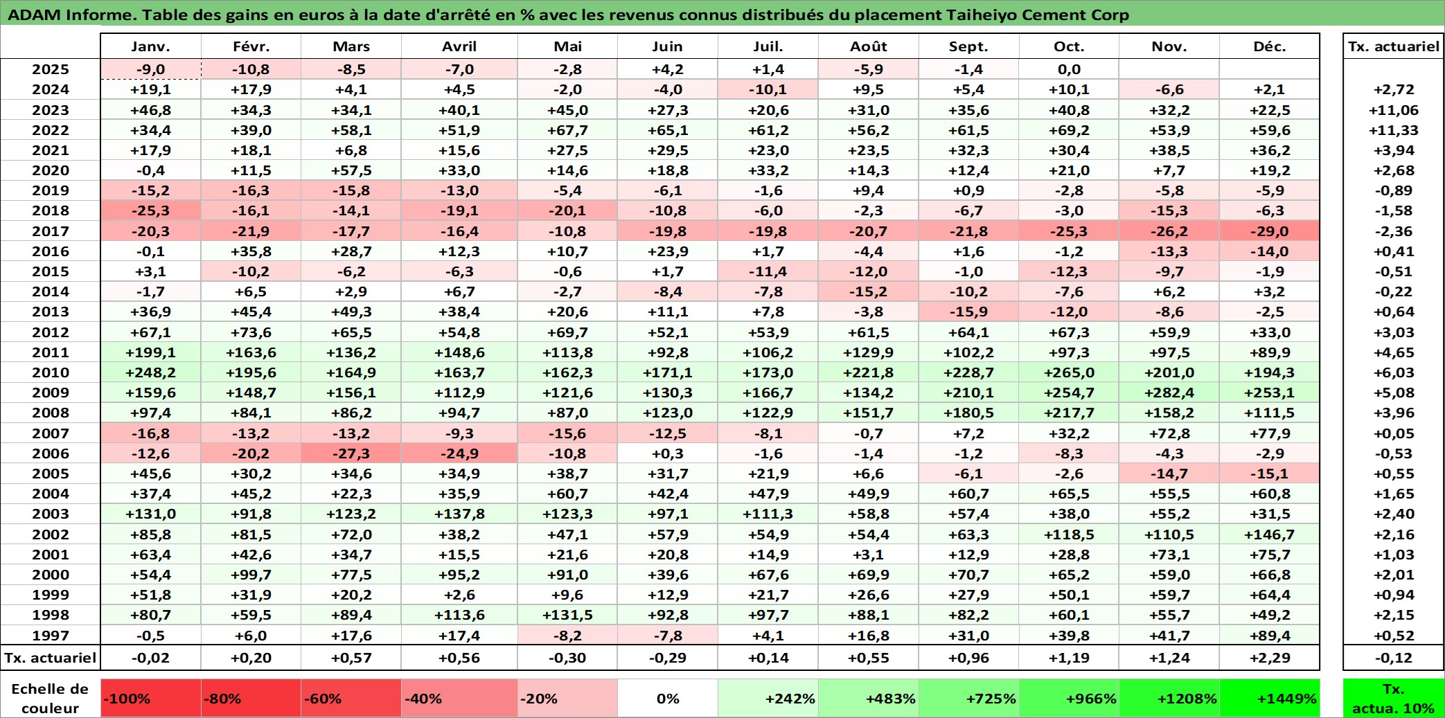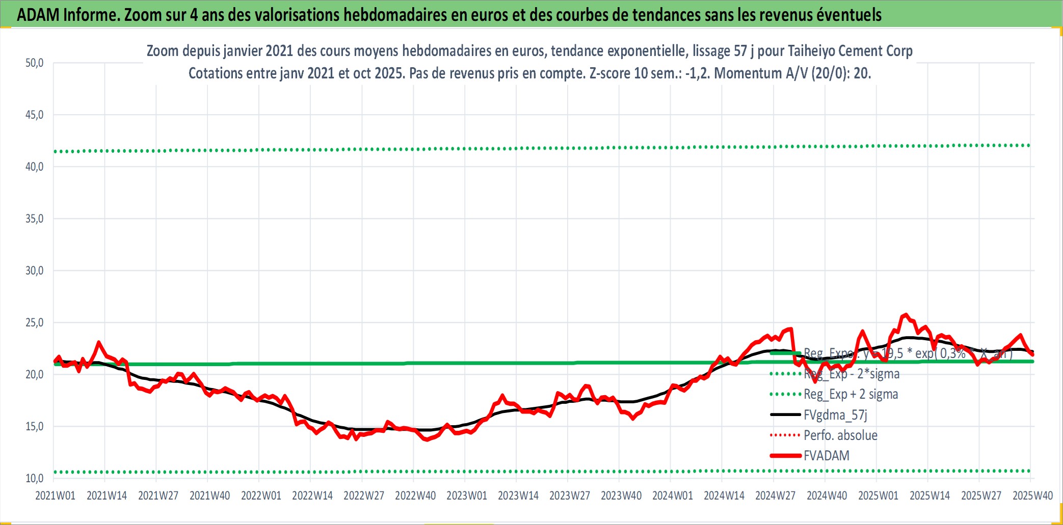 Site dédié aux investisseursPage dédiée sur site financeAnalyse des valorisations hebdomadaires de l'action Taiheiyo Cement Corp. Cet actif est cote en JPY. Les valorisations sont en contrevaleur EURO et couvrent les semaines 1997W01 a 2025W40. Les revenus de cet actif financier sont pris en compte depuis la semaine 1997W13. La note ESG de cet actif n'est pas connue.
