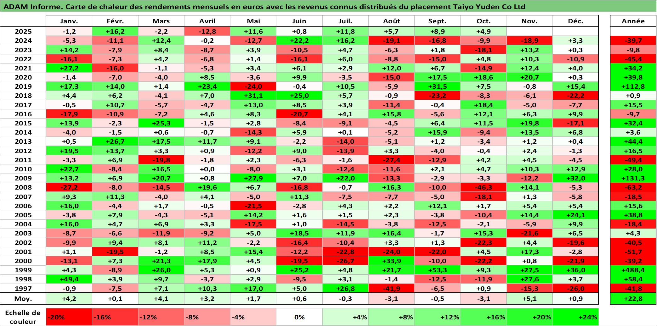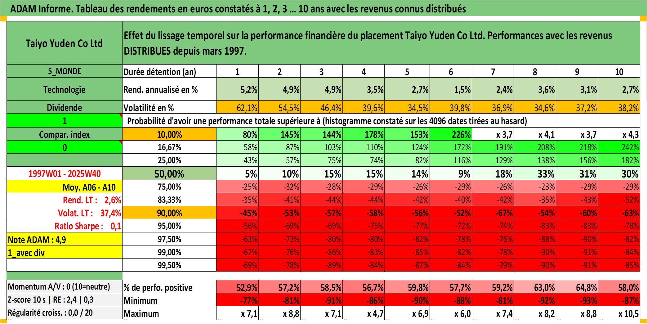 Site dédié aux investisseursPage dédiée sur site financeAnalyse des valorisations hebdomadaires de l'action Taiyo Yuden Co Ltd. Cet actif est cote en JPY. Les valorisations sont en contrevaleur EURO et couvrent les semaines 1997W01 a 2025W40. Les revenus de cet actif financier sont pris en compte depuis la semaine 1997W13. La note ESG de cet actif n'est pas connue.
