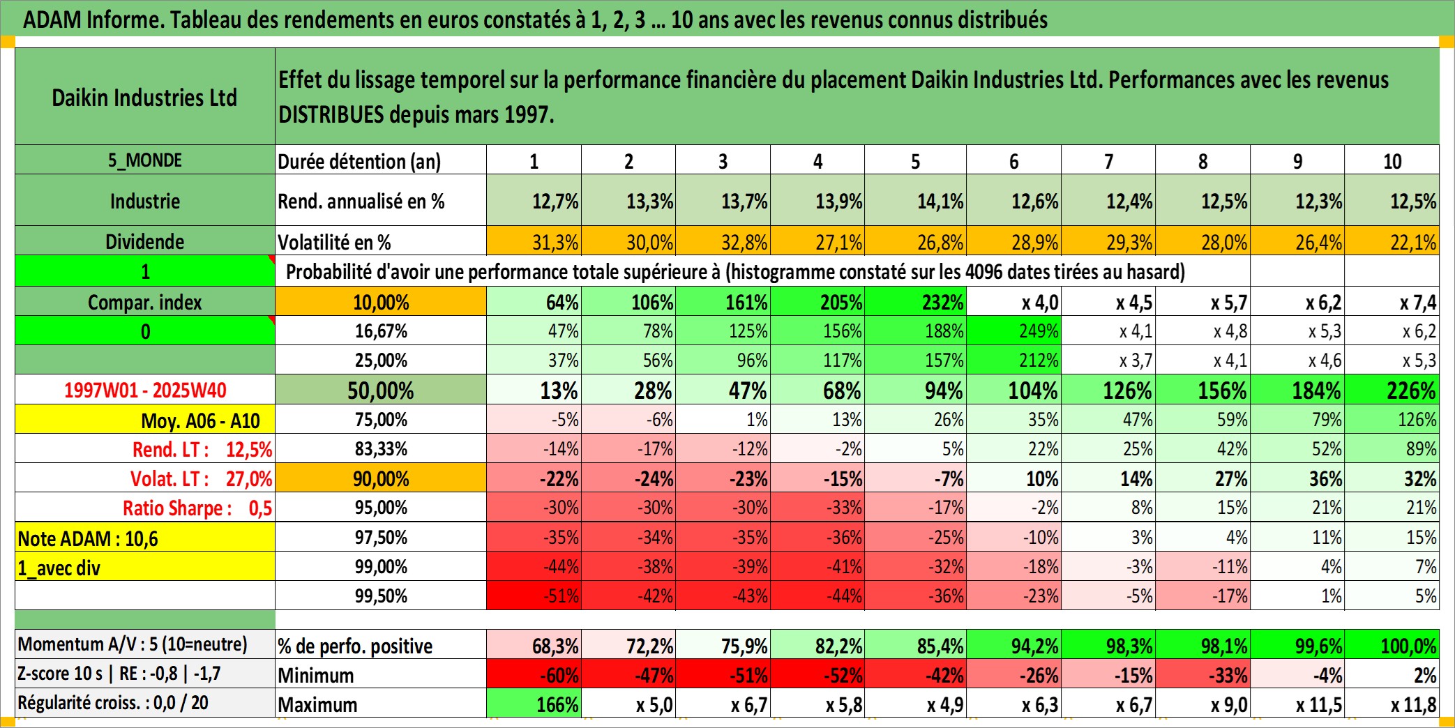 Site dédié aux investisseursPage dédiée sur site financeAnalyse des valorisations hebdomadaires de l'action Daikin Industries Ltd. Cet actif est cote en JPY. Les valorisations sont en contrevaleur EURO et couvrent les semaines 1997W01 a 2025W40. Les revenus de cet actif financier sont pris en compte depuis la semaine 1997W13. La note globale ESG de cet actif est estimee a 9.0 (apres rebasage entre 0 et 20).