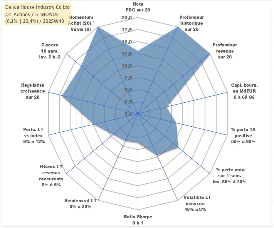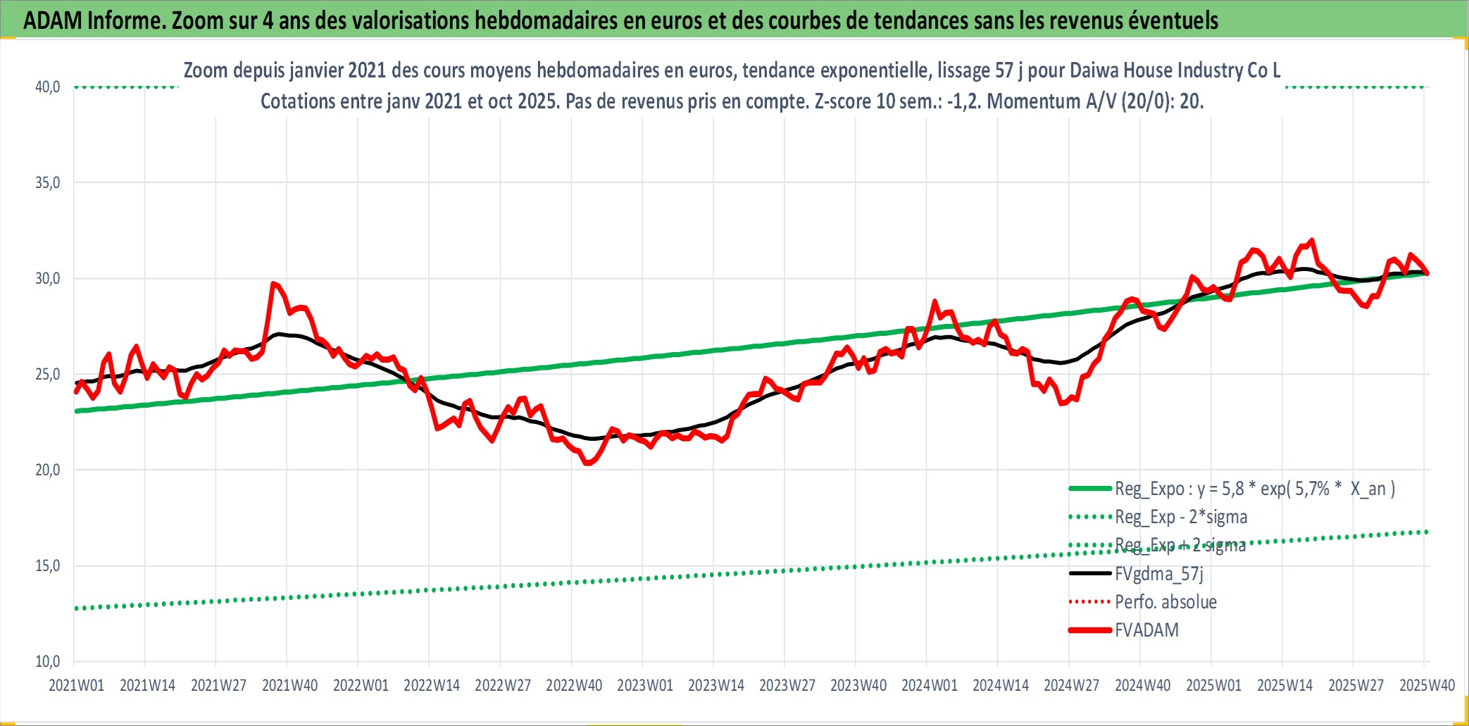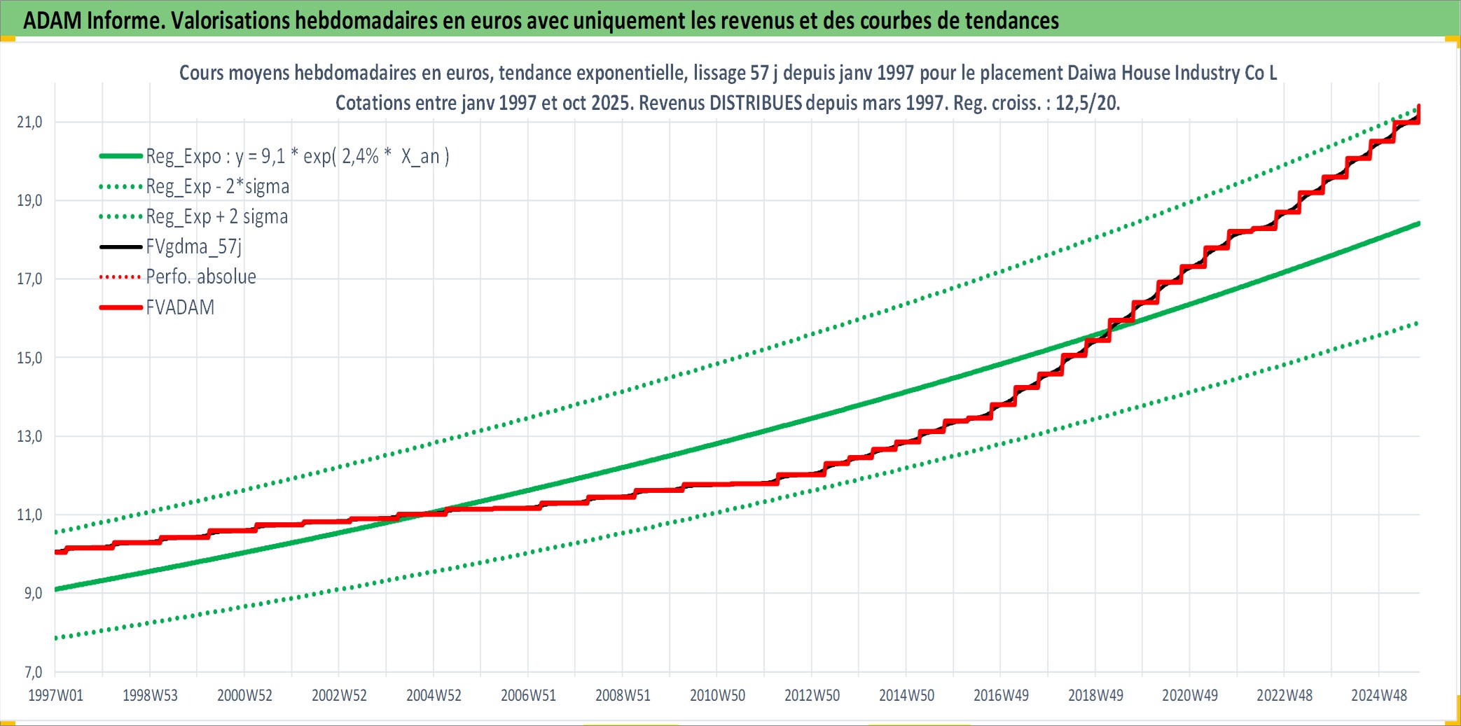Site dédié aux investisseursPage dédiée sur site financeAnalyse des valorisations hebdomadaires de l'action Daiwa House Industry Co Ltd. Cet actif est cote en JPY. Les valorisations sont en contrevaleur EURO et couvrent les semaines 1997W01 a 2025W40. Les revenus de cet actif financier sont pris en compte depuis la semaine 1997W13. La note globale ESG de cet actif est estimee a 13.0 (apres rebasage entre 0 et 20).