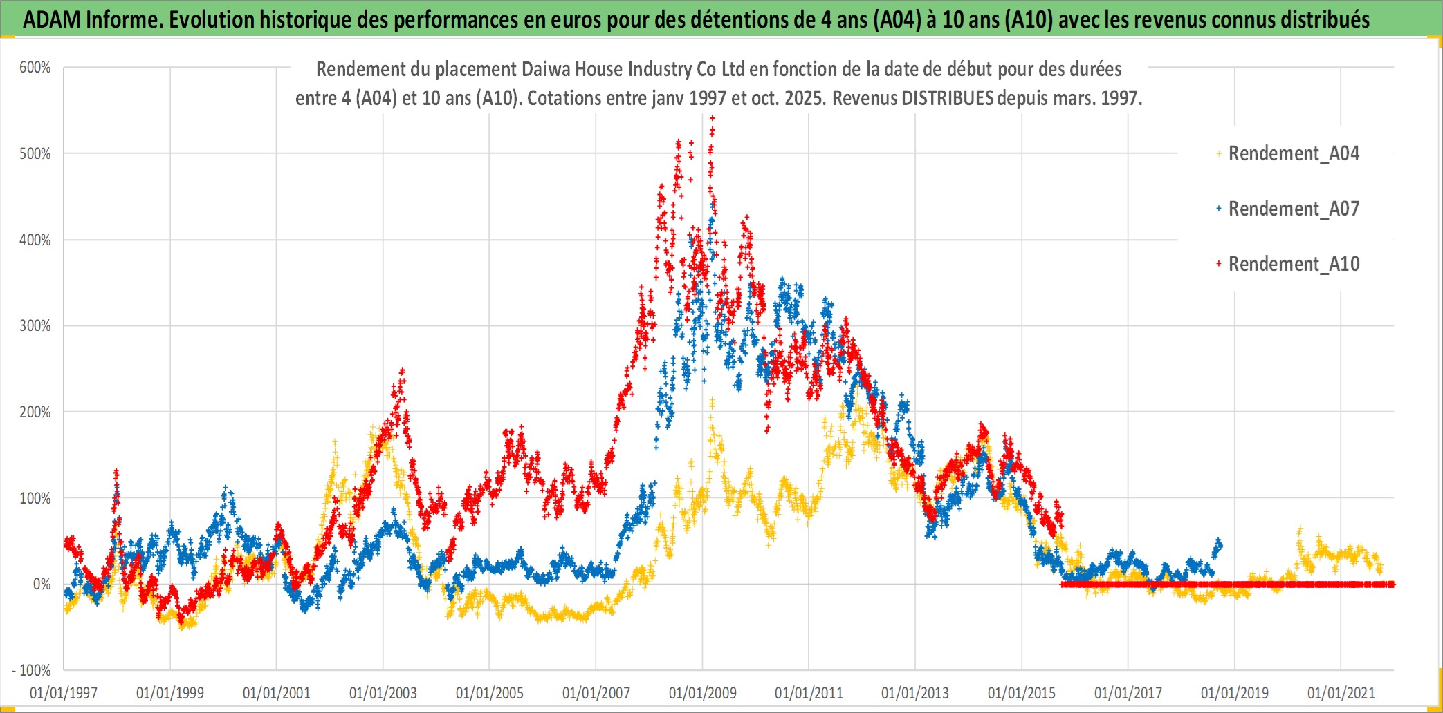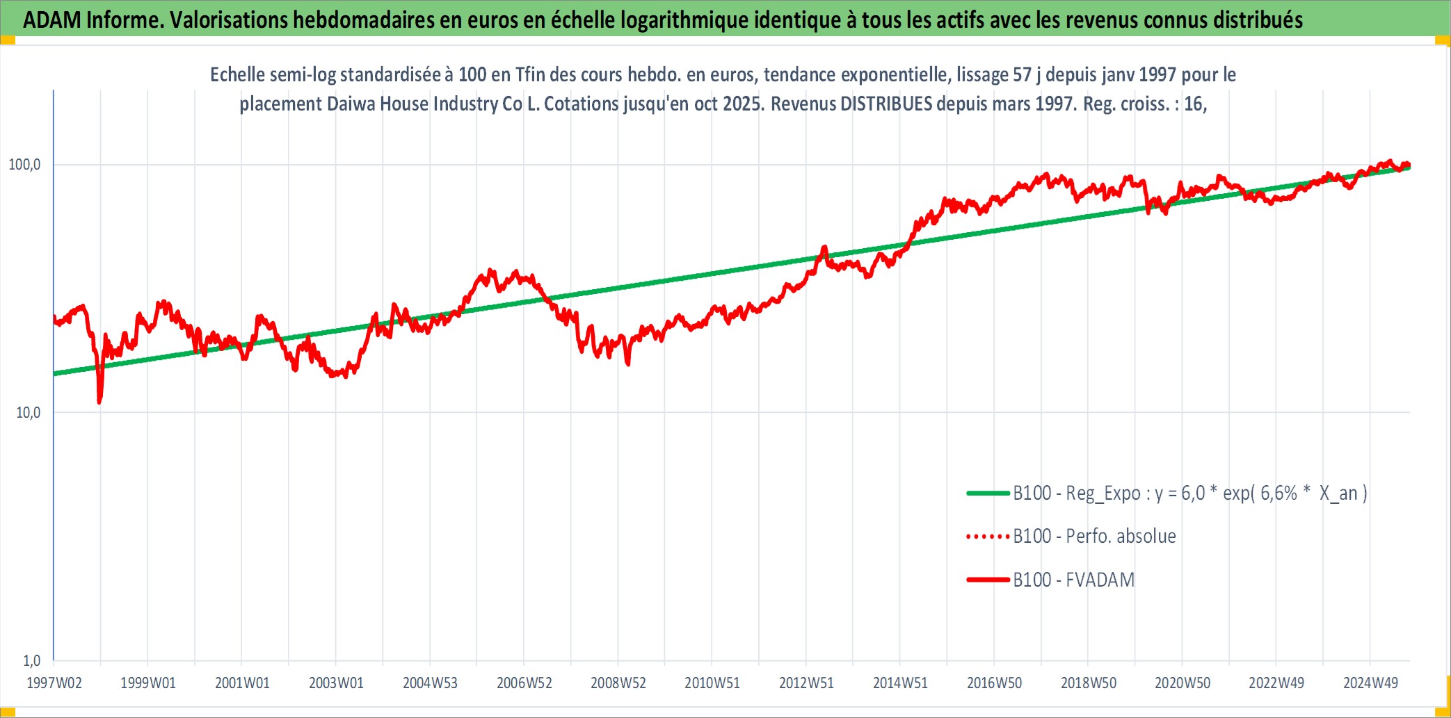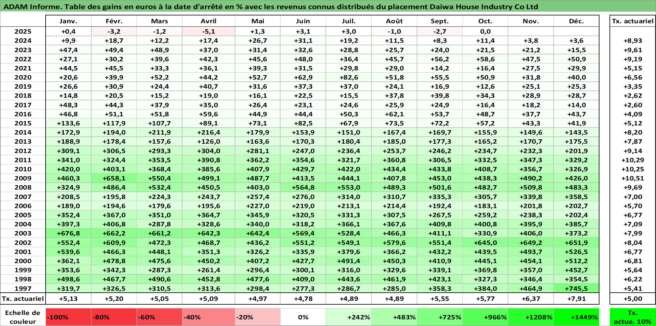 Site dédié aux investisseursPage dédiée sur site financeAnalyse des valorisations hebdomadaires de l'action Daiwa House Industry Co Ltd. Cet actif est cote en JPY. Les valorisations sont en contrevaleur EURO et couvrent les semaines 1997W01 a 2025W40. Les revenus de cet actif financier sont pris en compte depuis la semaine 1997W13. La note globale ESG de cet actif est estimee a 13.0 (apres rebasage entre 0 et 20).