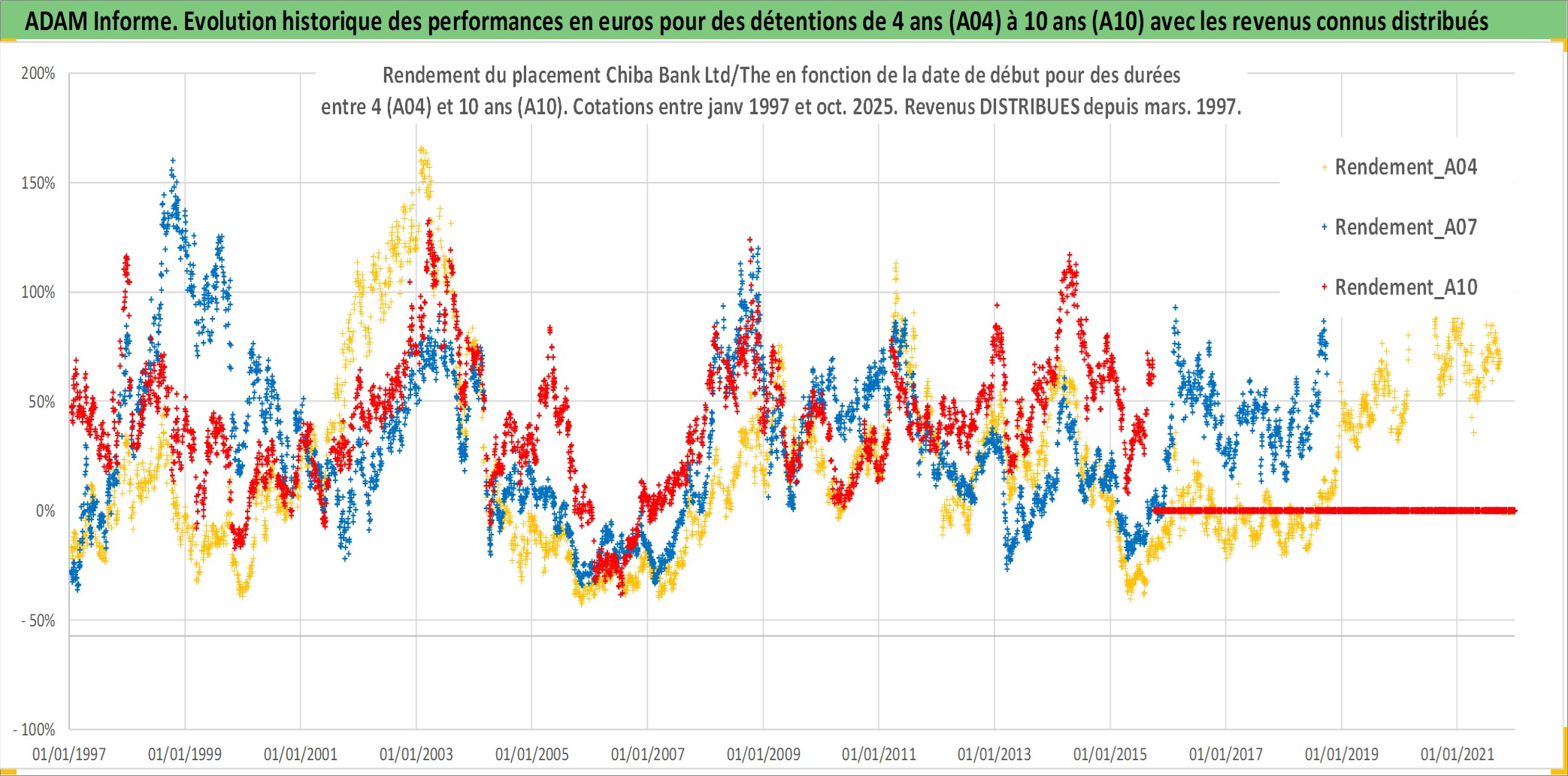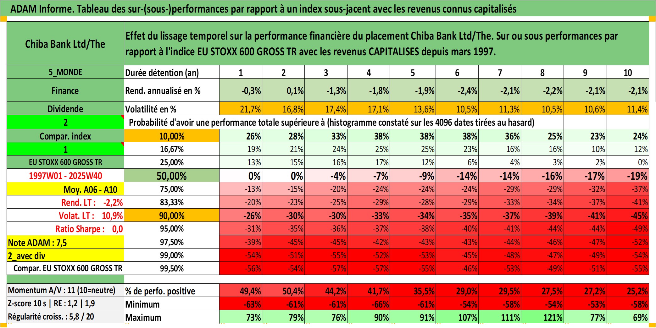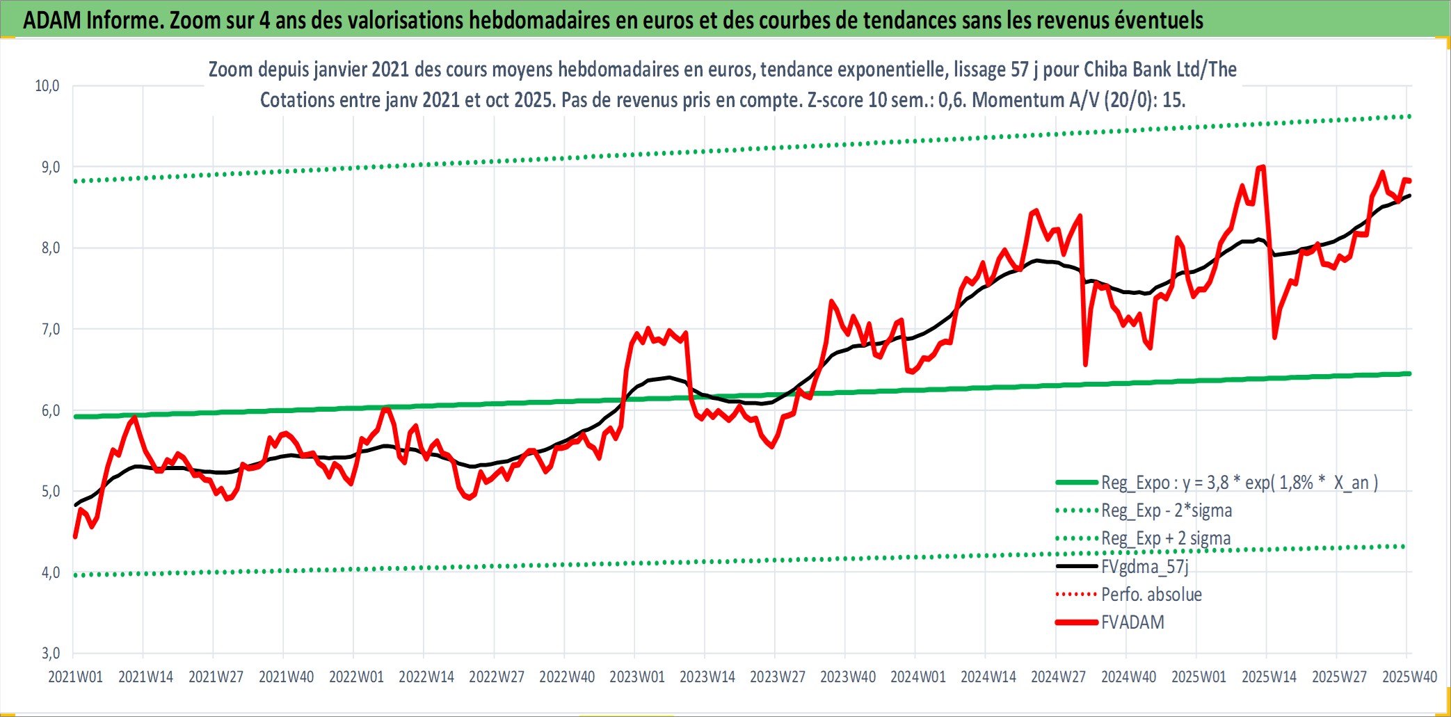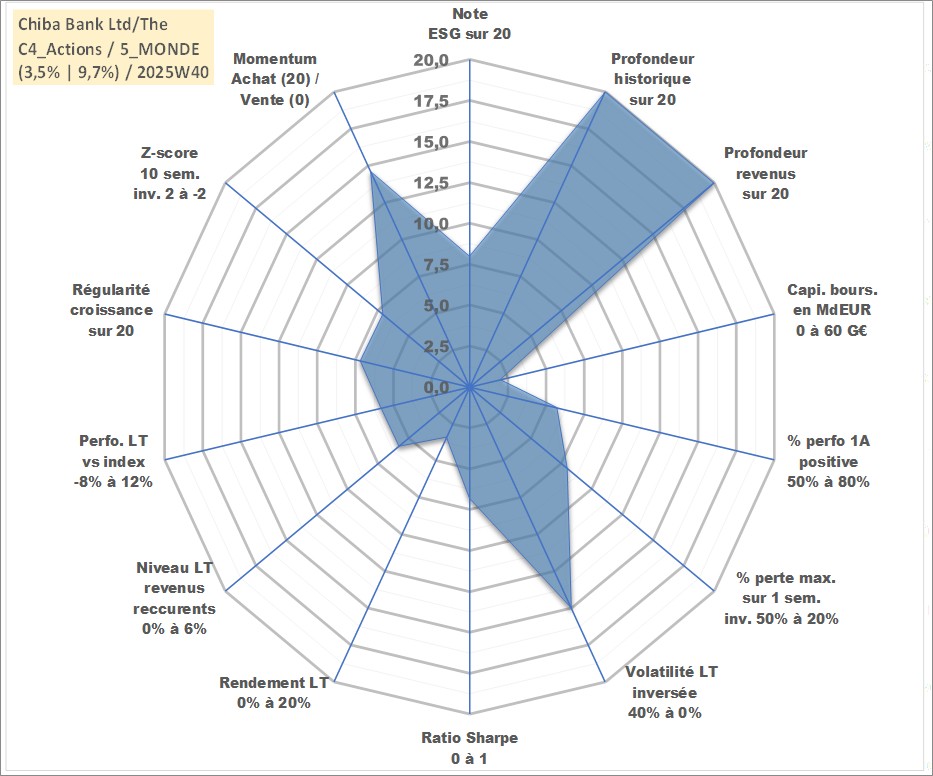 Site dédié aux investisseursPage dédiée sur site financeAnalyse des valorisations hebdomadaires de l'action Chiba Bank Ltd/The. Cet actif est cote en JPY. Les valorisations sont en contrevaleur EURO et couvrent les semaines 1997W01 a 2025W40. Les revenus de cet actif financier sont pris en compte depuis la semaine 1997W13. La note globale ESG de cet actif est estimee a 8.0 (apres rebasage entre 0 et 20).
