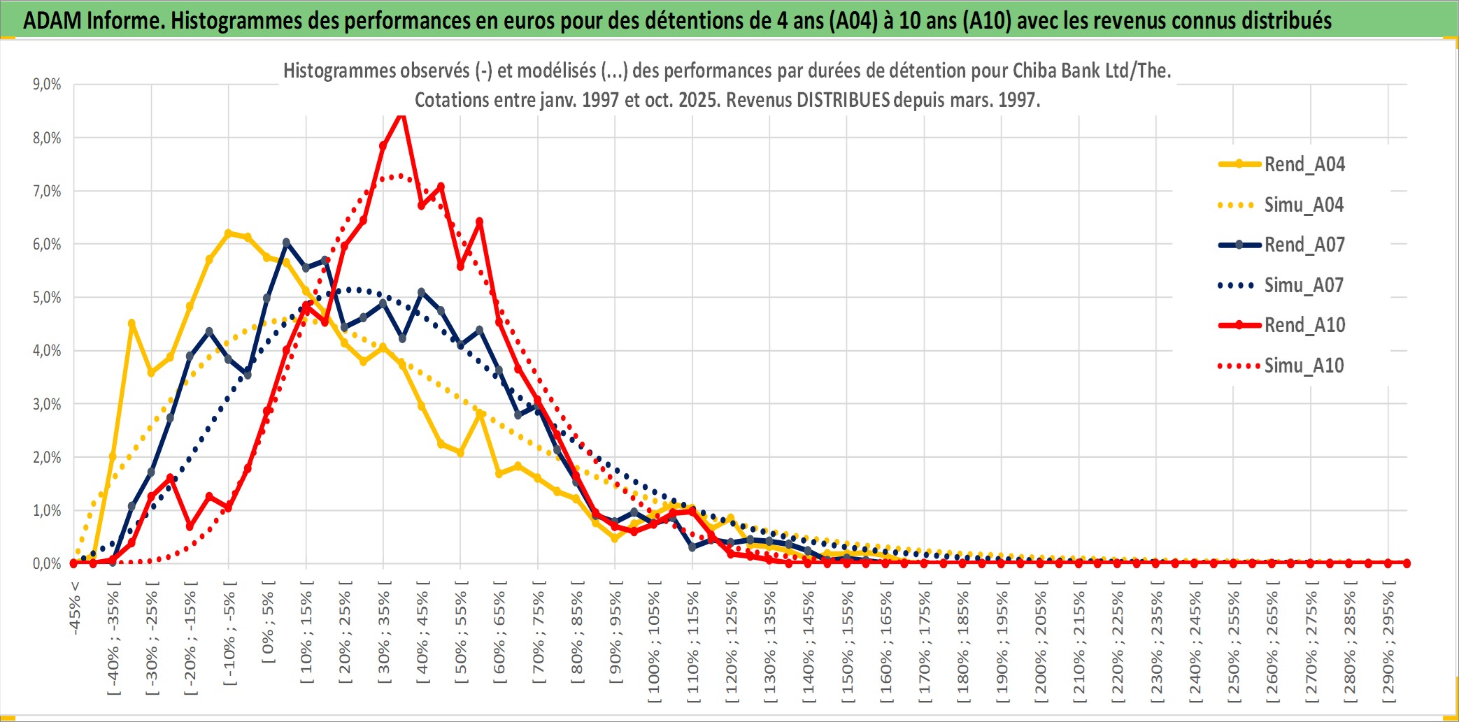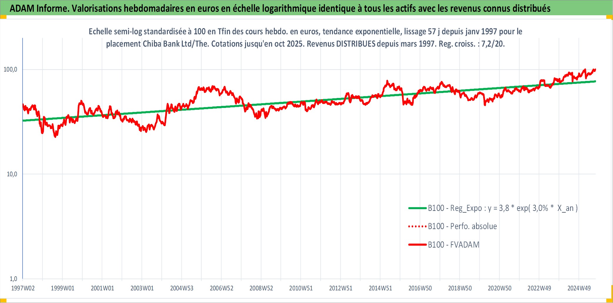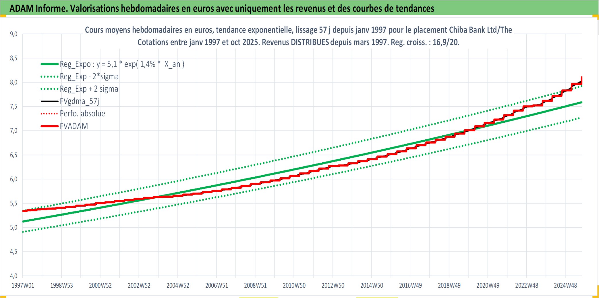 Site dédié aux investisseursPage dédiée sur site financeAnalyse des valorisations hebdomadaires de l'action Chiba Bank Ltd/The. Cet actif est cote en JPY. Les valorisations sont en contrevaleur EURO et couvrent les semaines 1997W01 a 2025W40. Les revenus de cet actif financier sont pris en compte depuis la semaine 1997W13. La note globale ESG de cet actif est estimee a 8.0 (apres rebasage entre 0 et 20).