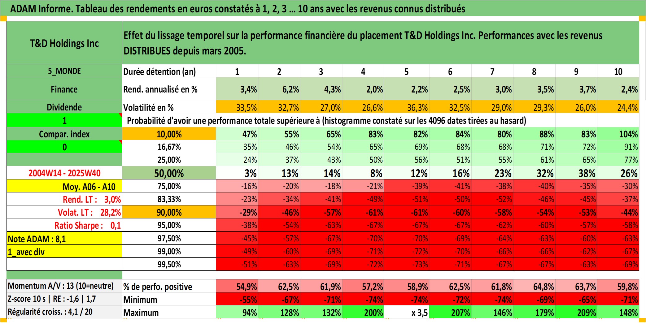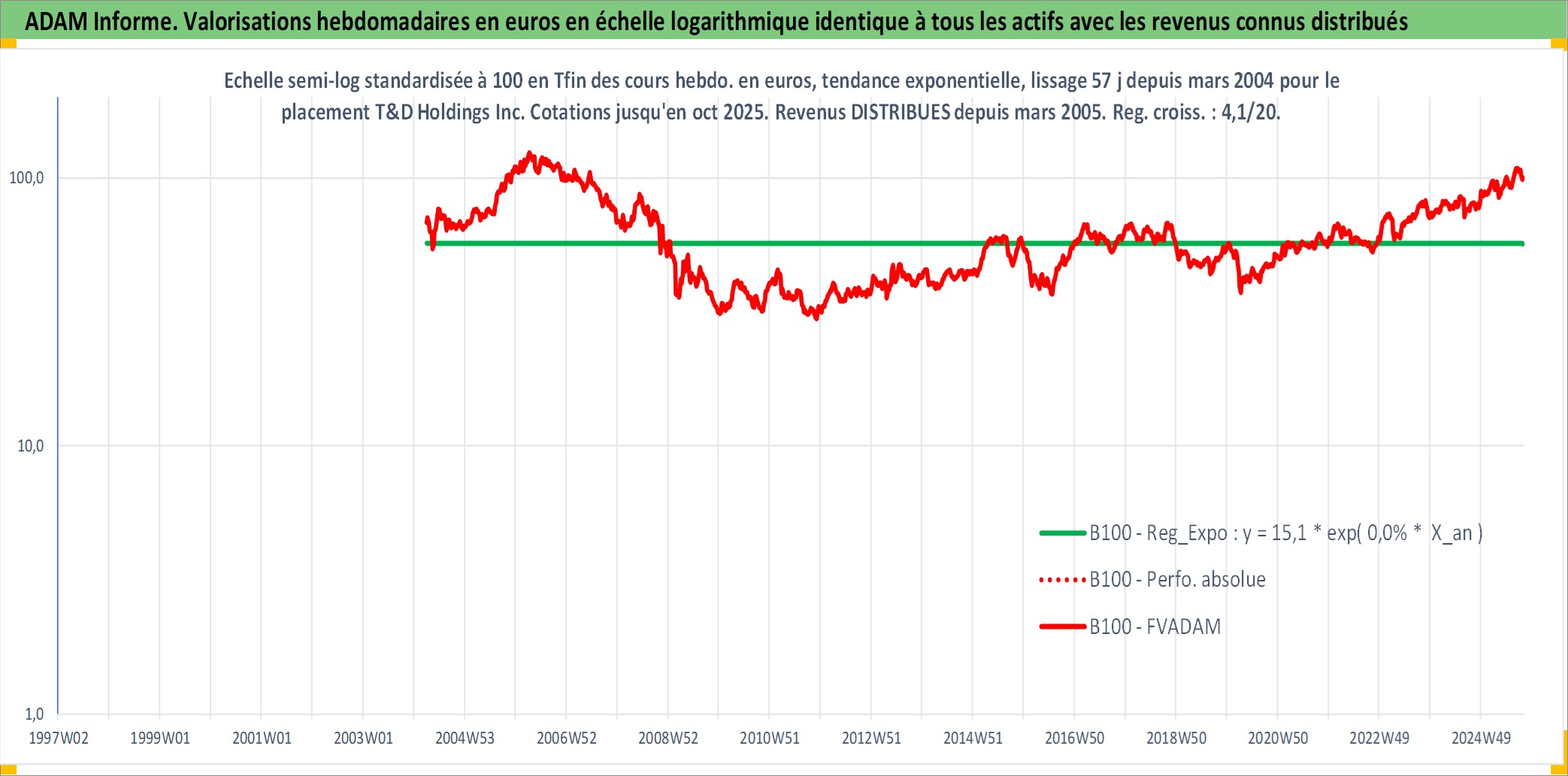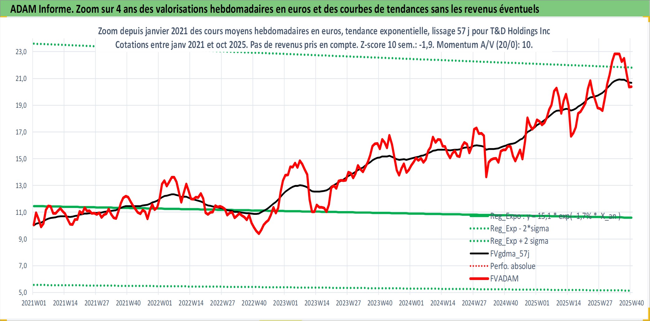 Site dédié aux investisseursPage dédiée sur site financeAnalyse des valorisations hebdomadaires de l'action T&D Holdings Inc. Cet actif est cote en JPY. Les valorisations sont en contrevaleur EURO et couvrent les semaines 2004W14 a 2025W40. Les revenus de cet actif financier sont pris en compte depuis la semaine 2005W13. La note globale ESG de cet actif est estimee a 7.0 (apres rebasage entre 0 et 20).