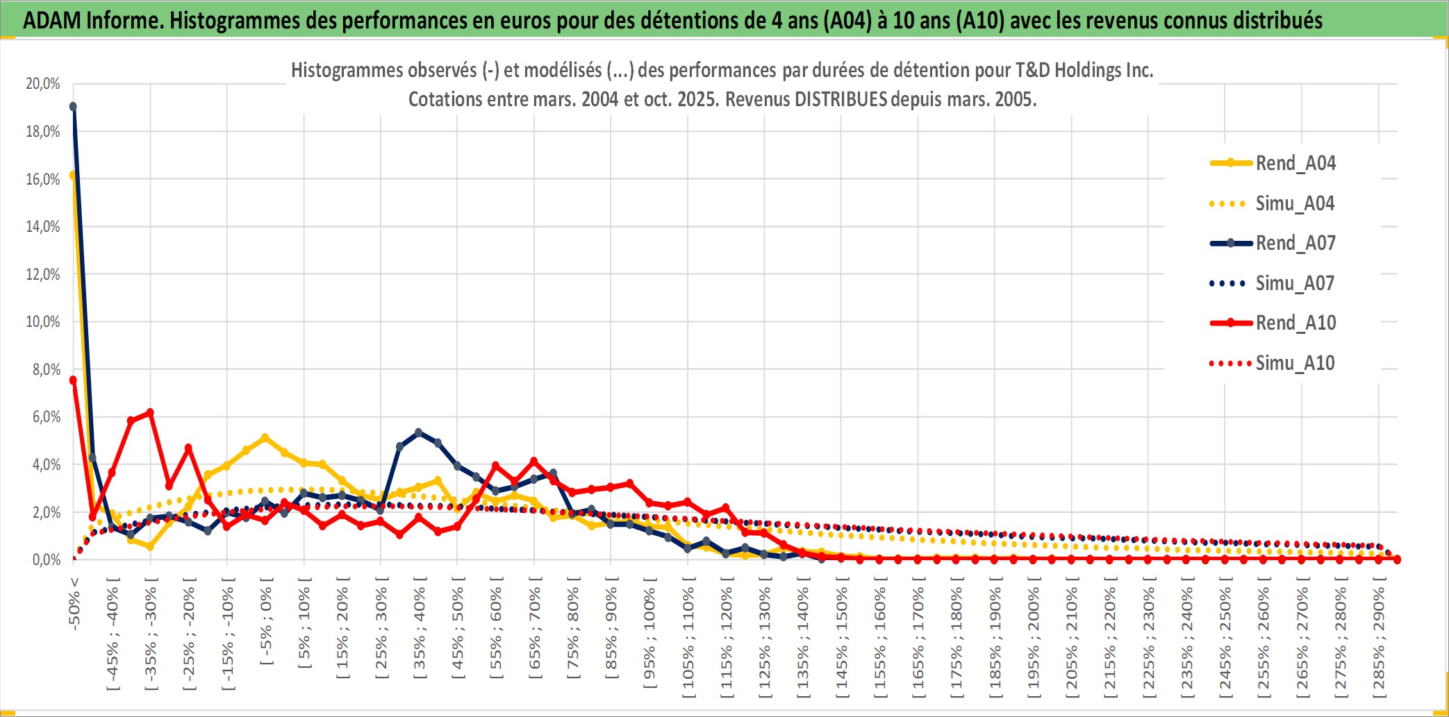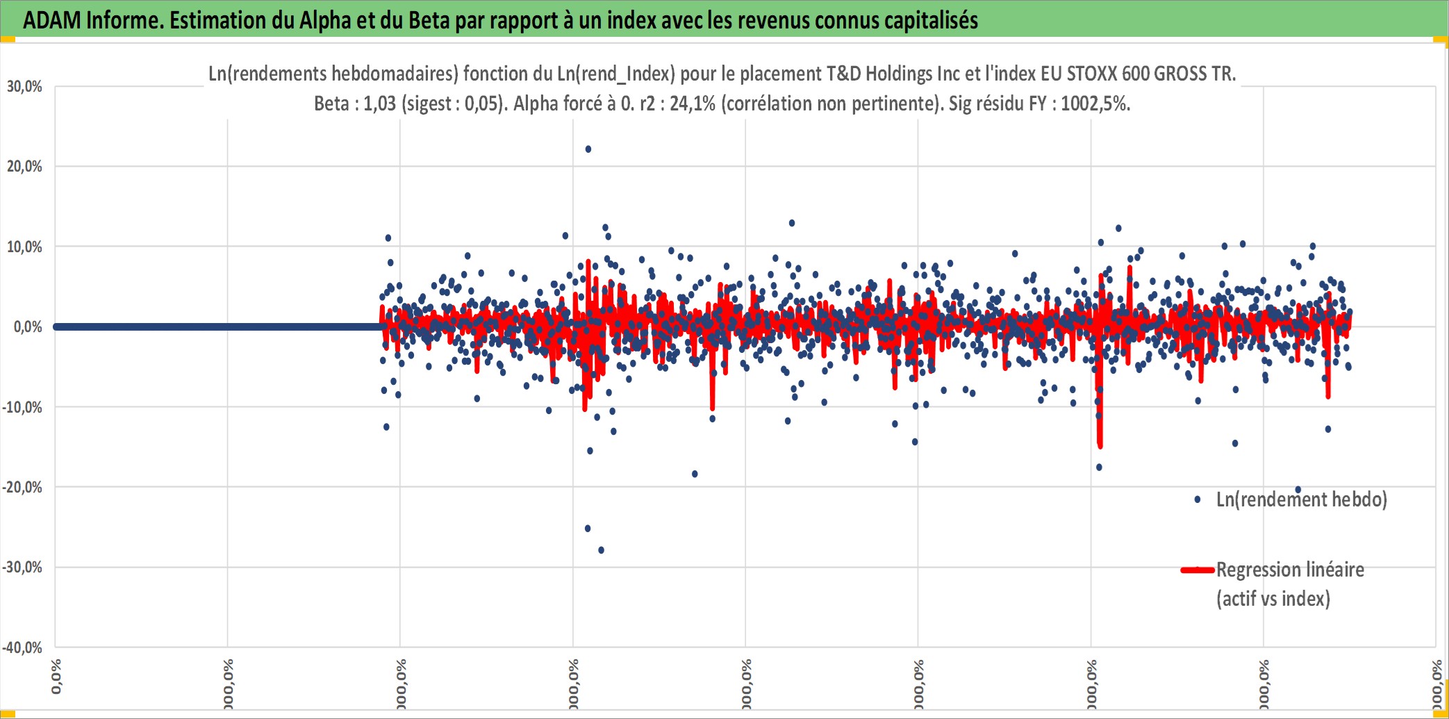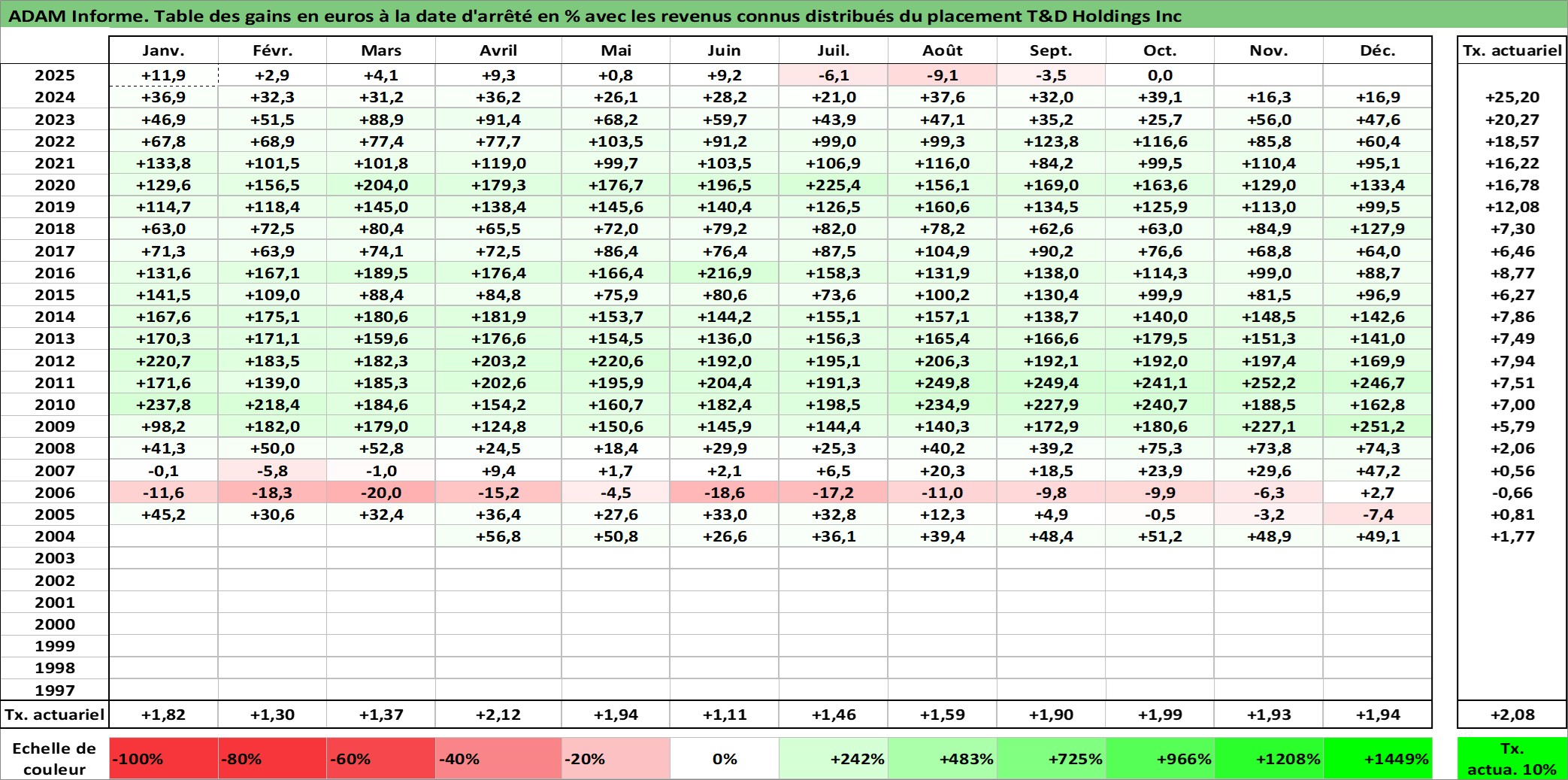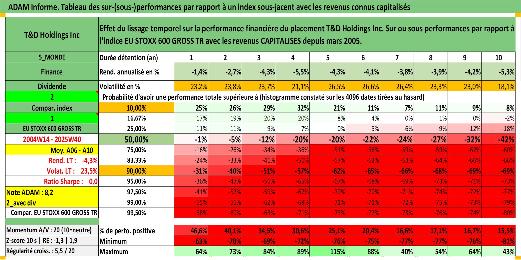 Site dédié aux investisseursPage dédiée sur site financeAnalyse des valorisations hebdomadaires de l'action T&D Holdings Inc. Cet actif est cote en JPY. Les valorisations sont en contrevaleur EURO et couvrent les semaines 2004W14 a 2025W40. Les revenus de cet actif financier sont pris en compte depuis la semaine 2005W13. La note globale ESG de cet actif est estimee a 7.0 (apres rebasage entre 0 et 20).