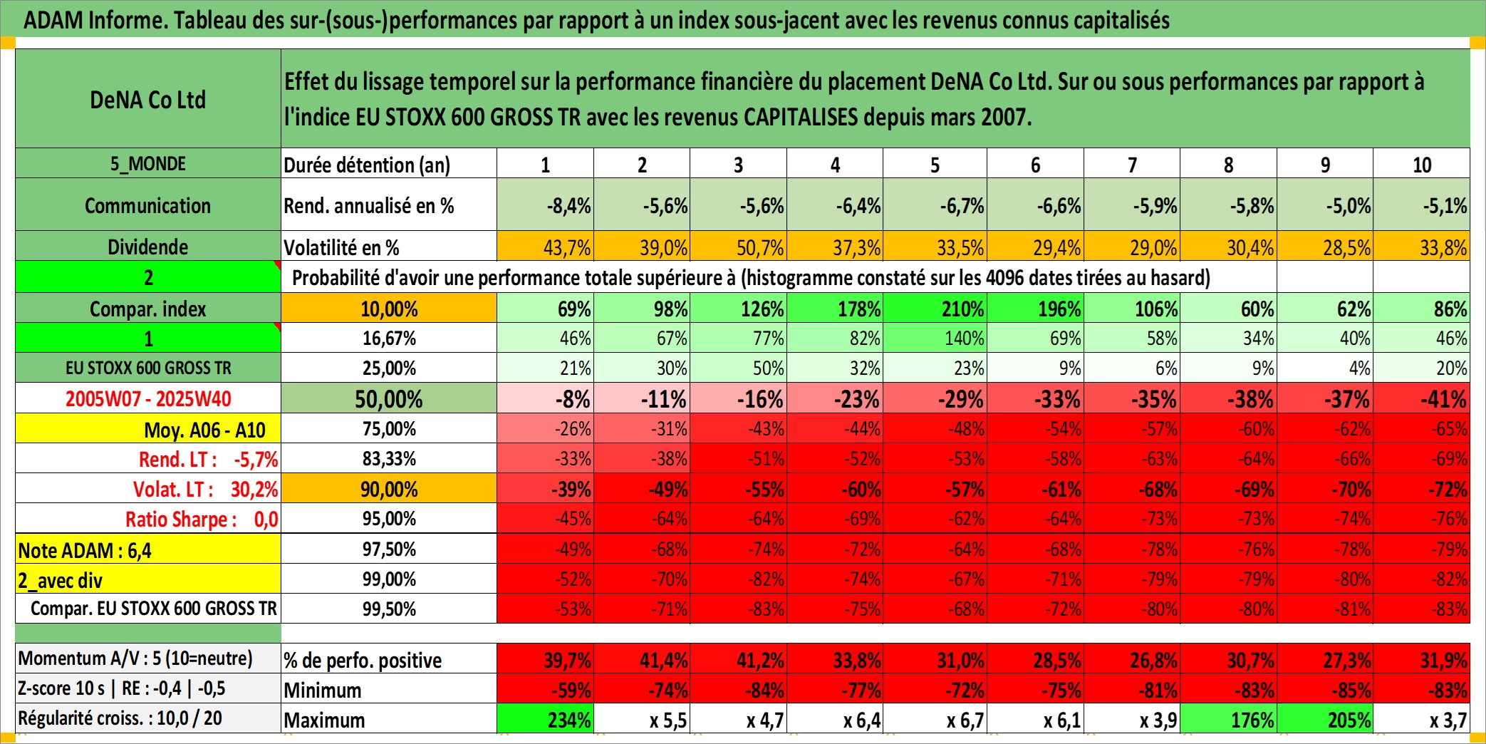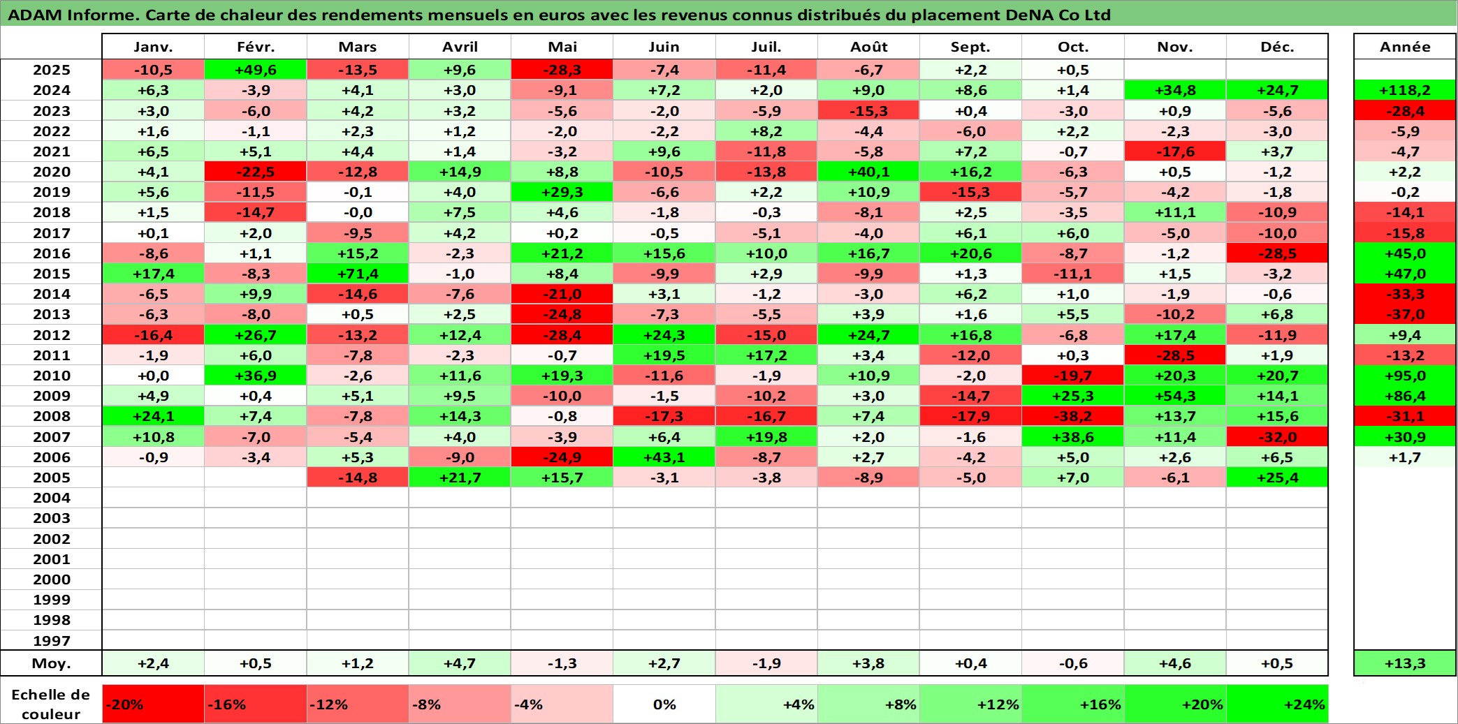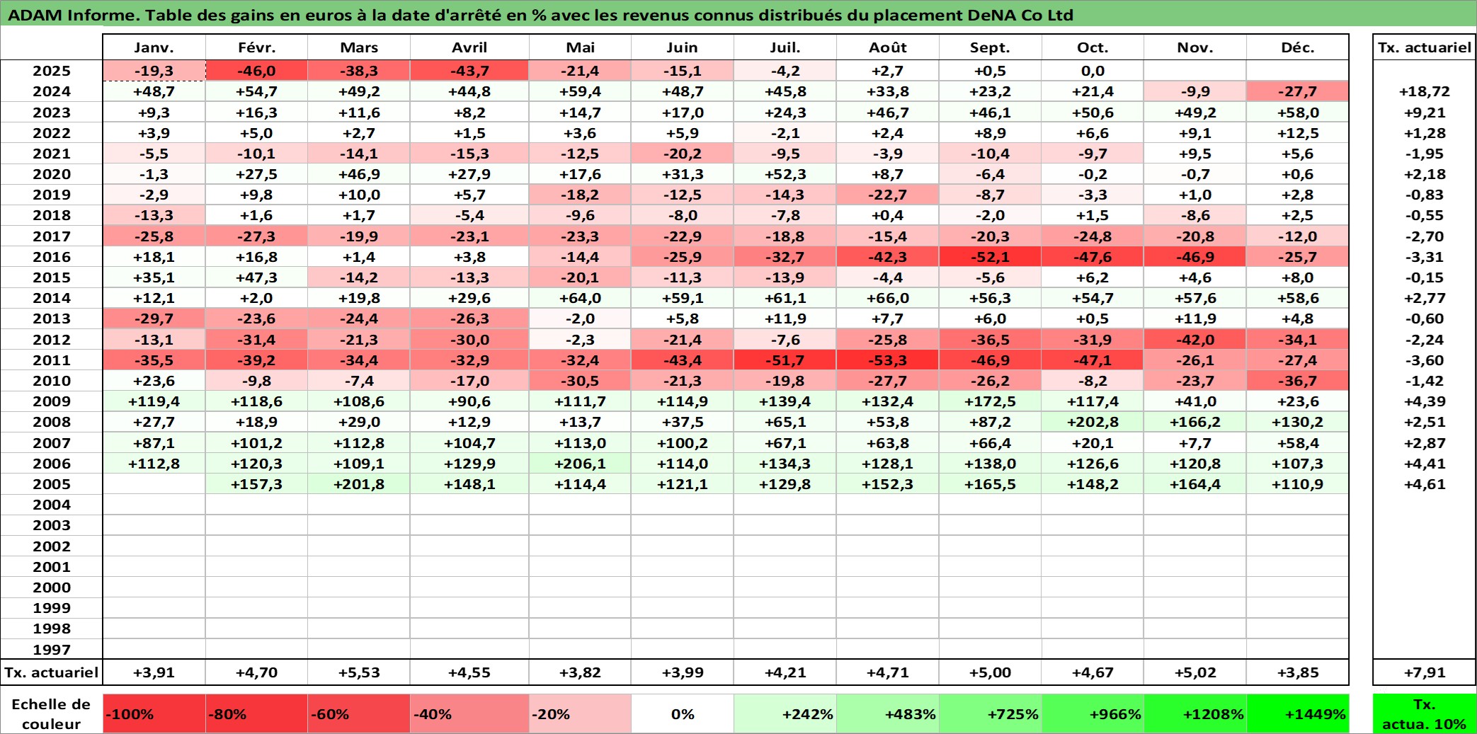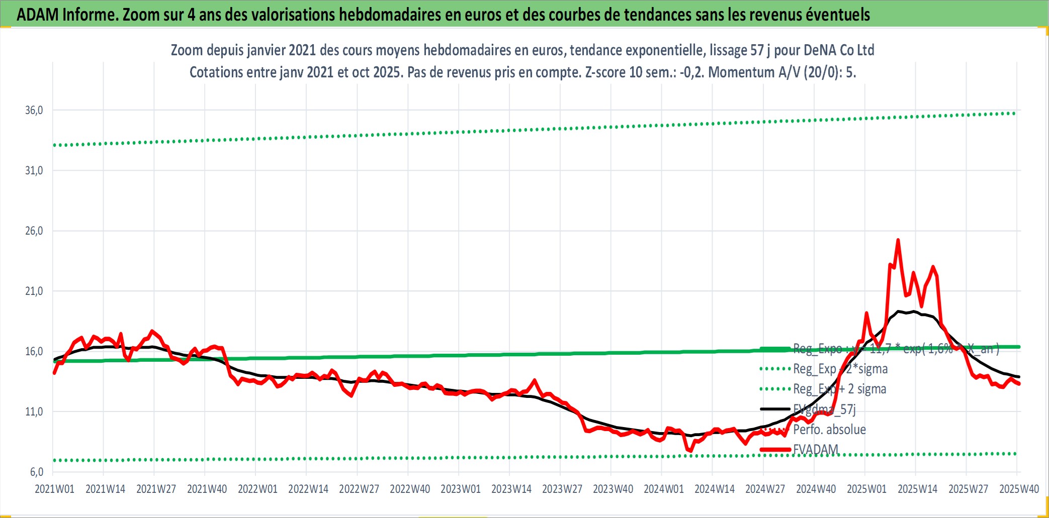 Site dédié aux investisseursPage dédiée sur site financeAnalyse des valorisations hebdomadaires de l'action DeNA Co Ltd. Cet actif est cote en JPY. Les valorisations sont en contrevaleur EURO et couvrent les semaines 2005W07 a 2025W40. Les revenus de cet actif financier sont pris en compte depuis la semaine 2007W13. La note ESG de cet actif n'est pas connue.