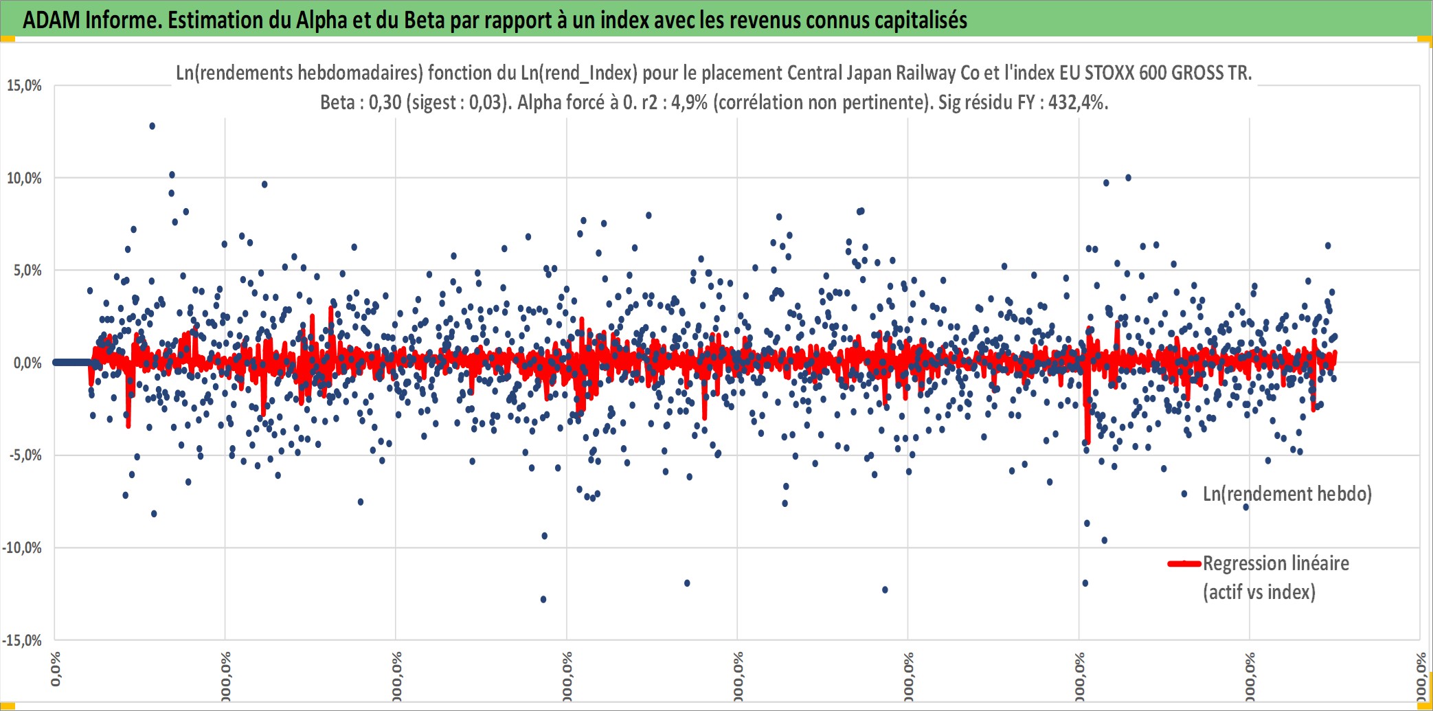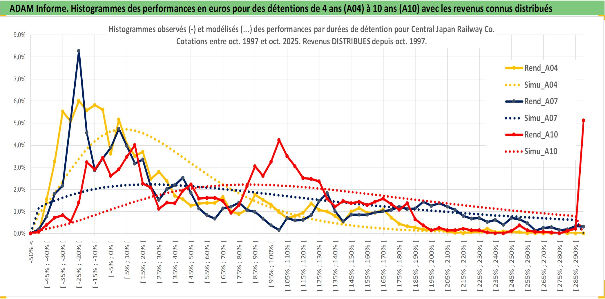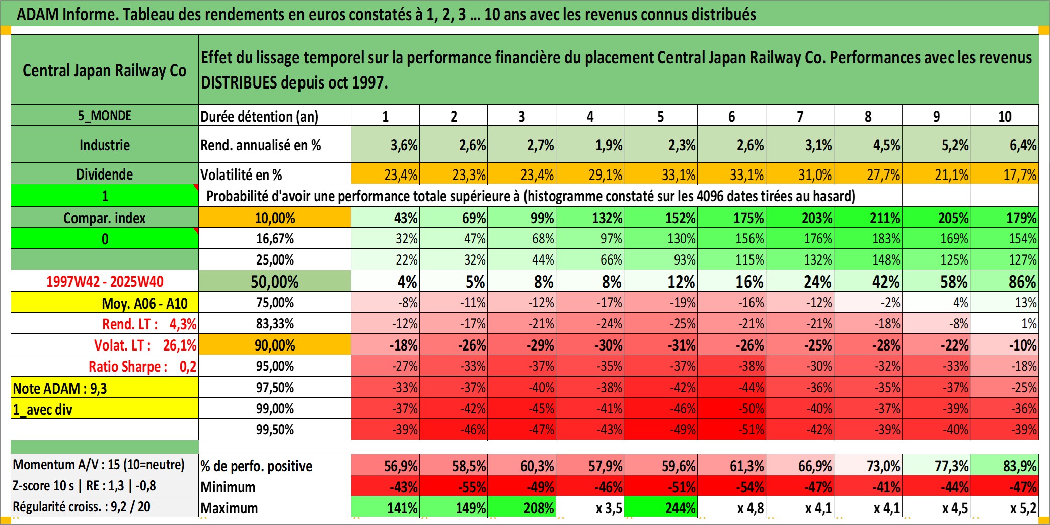 Site dédié aux investisseursPage dédiée sur site financeAnalyse des valorisations hebdomadaires de l'action Central Japan Railway Co. Cet actif est cote en JPY. Les valorisations sont en contrevaleur EURO et couvrent les semaines 1997W42 a 2025W40. Les revenus de cet actif financier sont pris en compte depuis la semaine 1997W43. La note globale ESG de cet actif est estimee a 6.0 (apres rebasage entre 0 et 20).