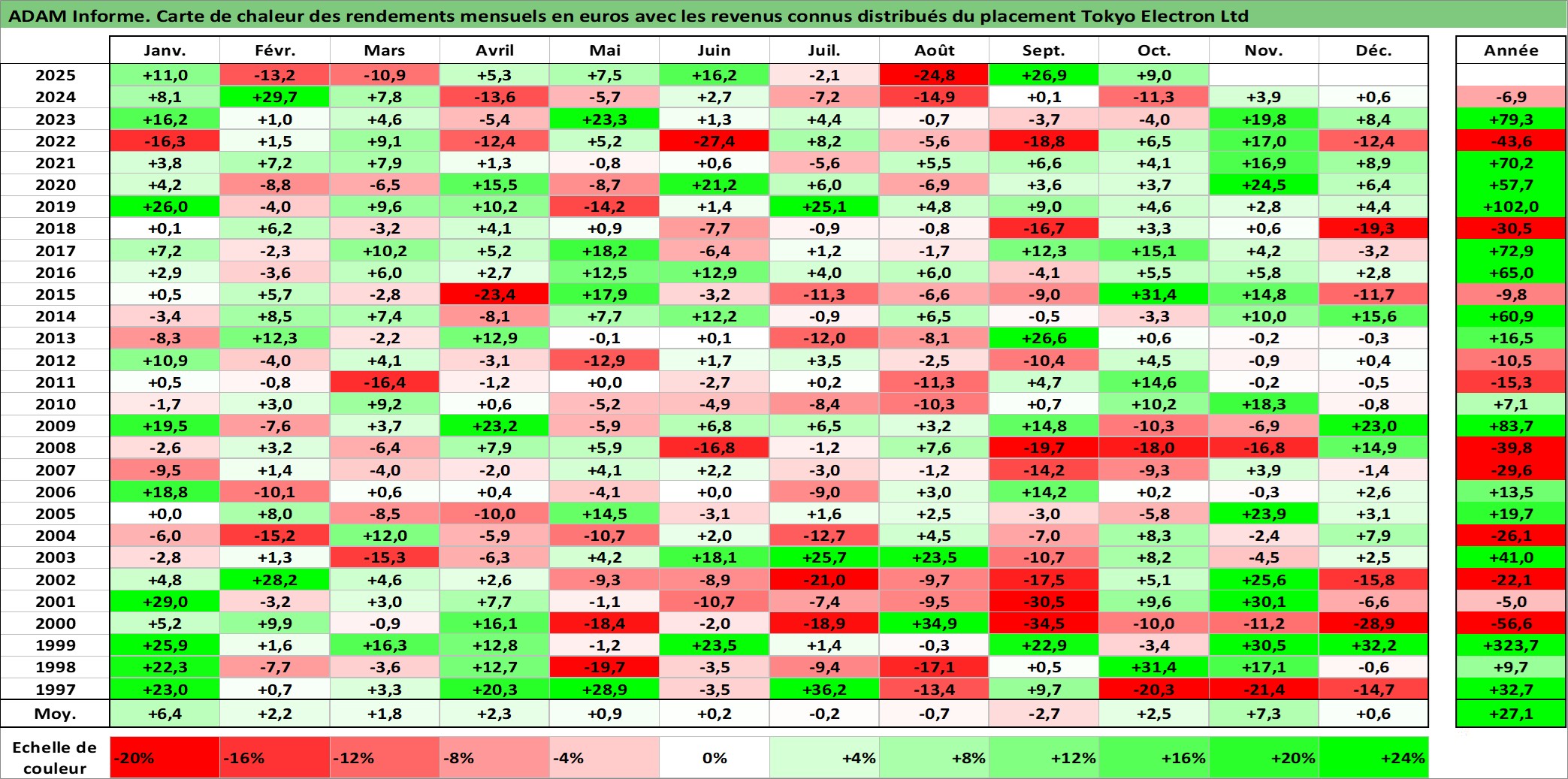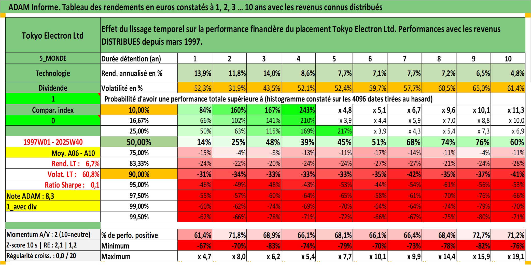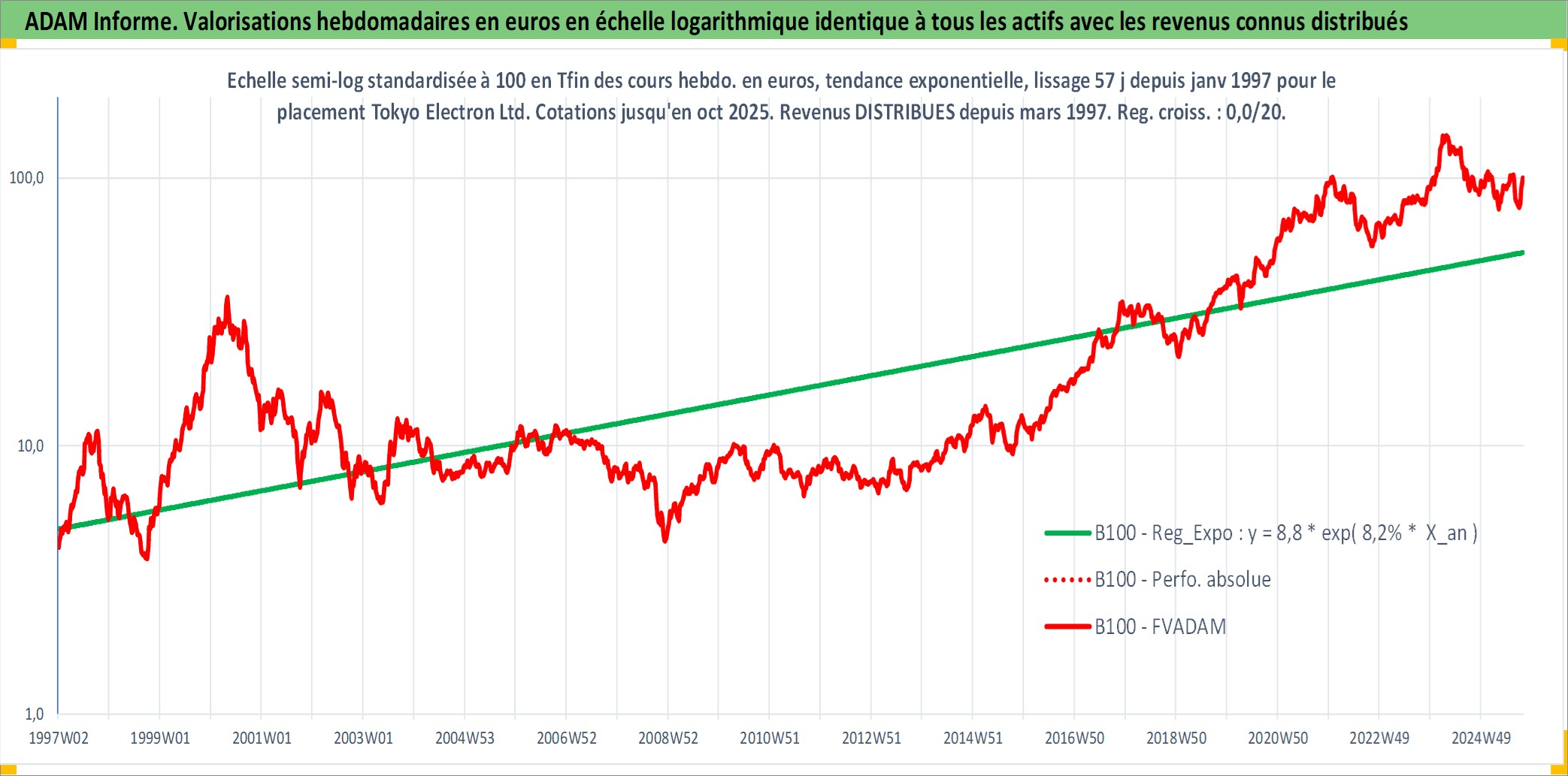 Site dédié aux investisseursPage dédiée sur site financeAnalyse des valorisations hebdomadaires de l'action Tokyo Electron Ltd. Cet actif est cote en JPY. Les valorisations sont en contrevaleur EURO et couvrent les semaines 1997W01 a 2025W40. Les revenus de cet actif financier sont pris en compte depuis la semaine 1997W13. La note globale ESG de cet actif est estimee a 13.0 (apres rebasage entre 0 et 20).
