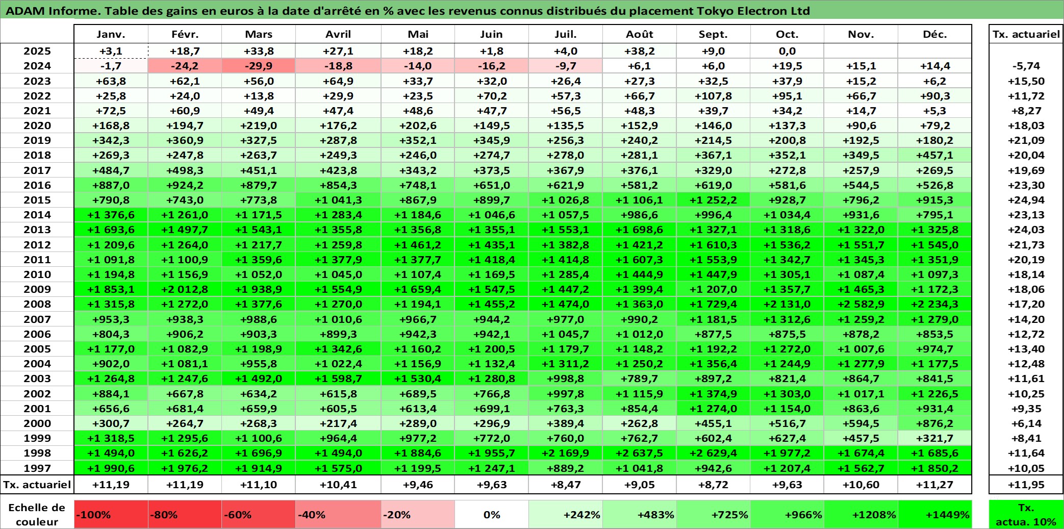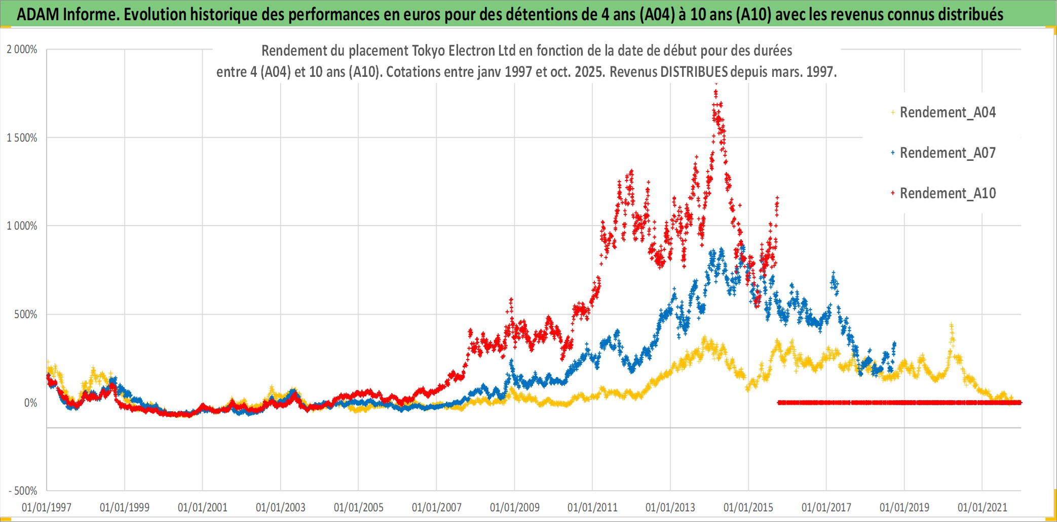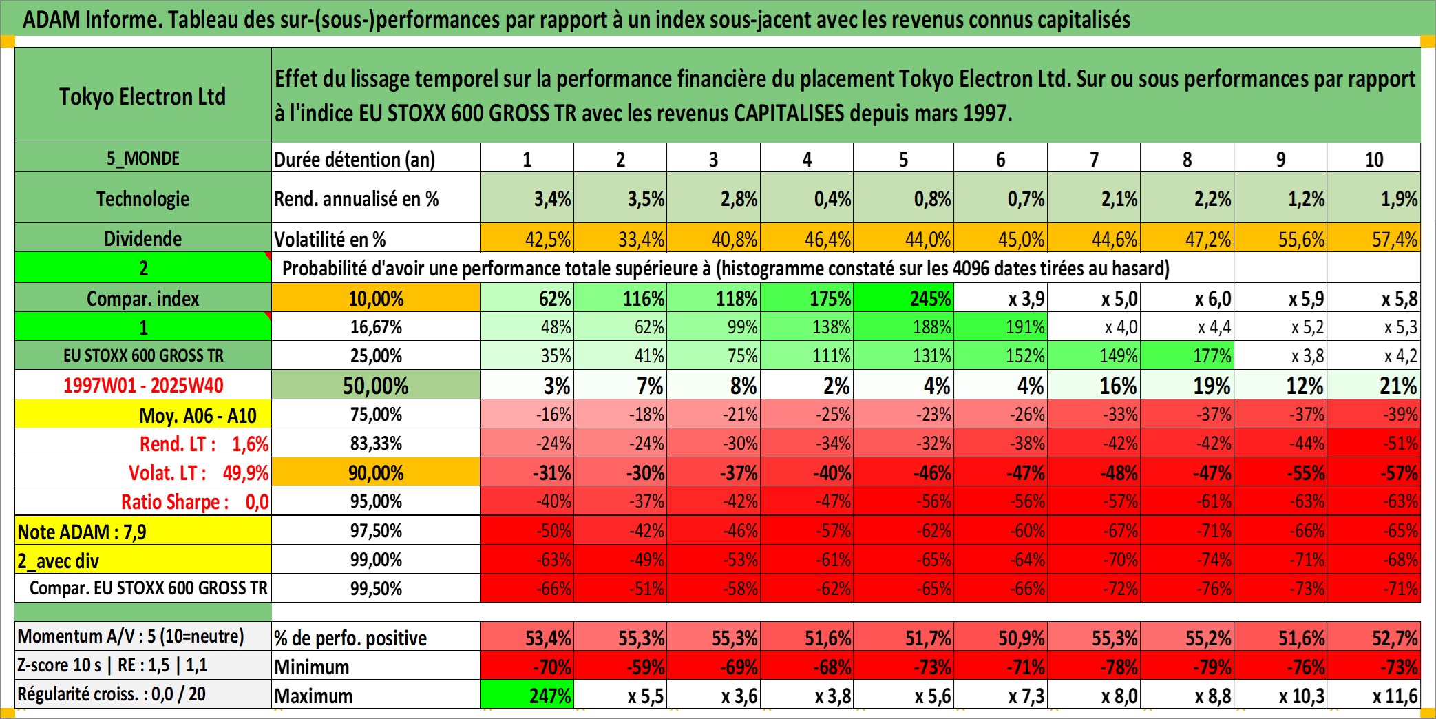 Site dédié aux investisseursPage dédiée sur site financeAnalyse des valorisations hebdomadaires de l'action Tokyo Electron Ltd. Cet actif est cote en JPY. Les valorisations sont en contrevaleur EURO et couvrent les semaines 1997W01 a 2025W40. Les revenus de cet actif financier sont pris en compte depuis la semaine 1997W13. La note globale ESG de cet actif est estimee a 13.0 (apres rebasage entre 0 et 20).