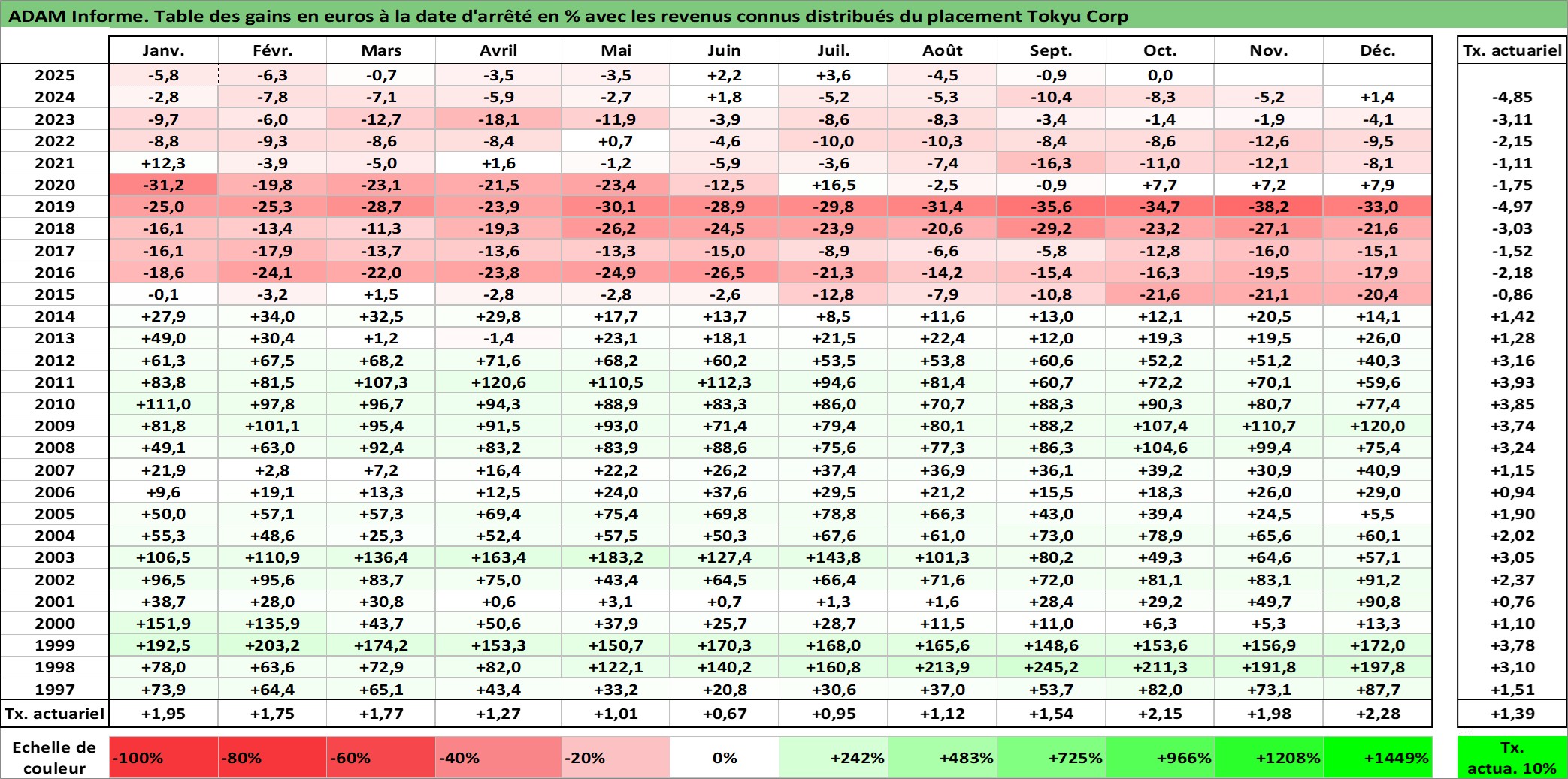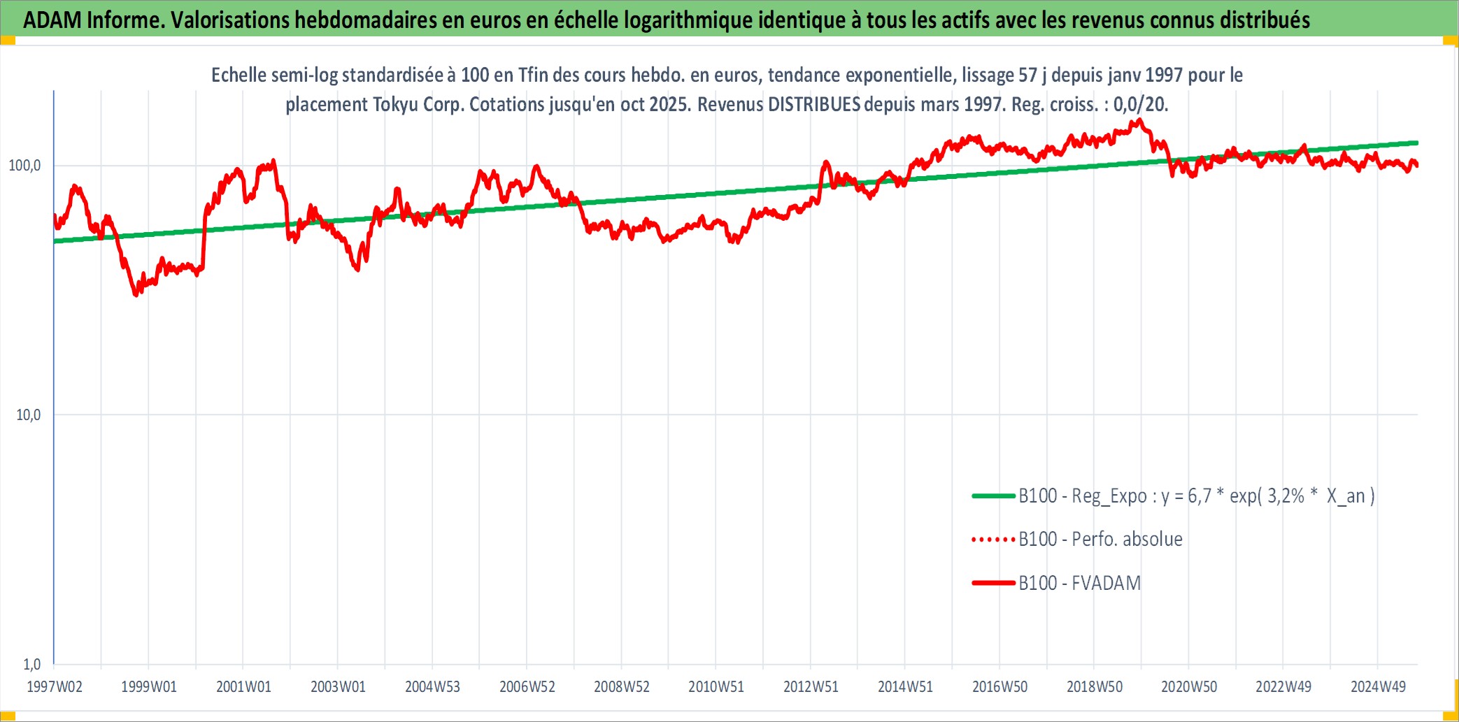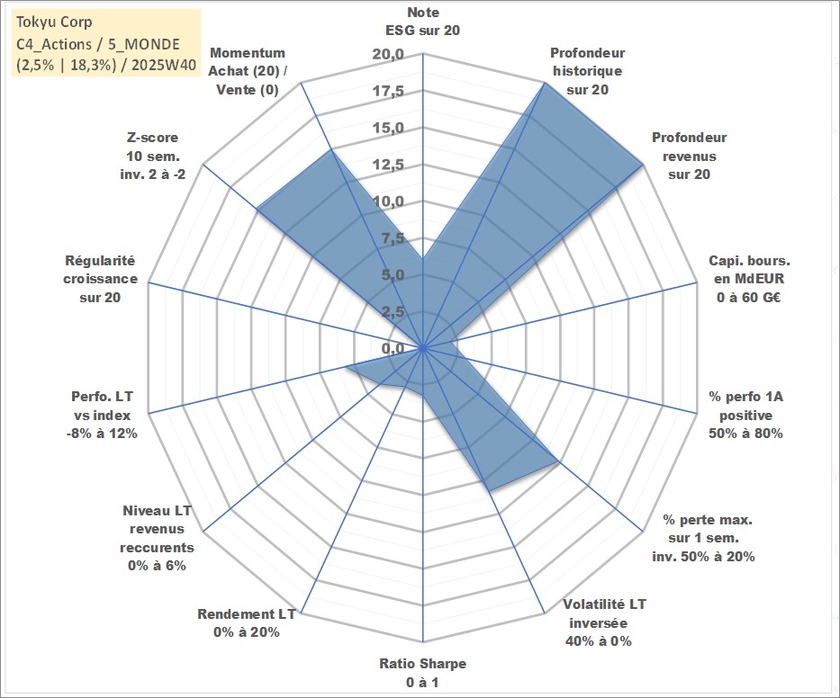 Site dédié aux investisseursPage dédiée sur site financeAnalyse des valorisations hebdomadaires de l'action Tokyu Corp. Cet actif est cote en JPY. Les valorisations sont en contrevaleur EURO et couvrent les semaines 1997W01 a 2025W40. Les revenus de cet actif financier sont pris en compte depuis la semaine 1997W13. La note globale ESG de cet actif est estimee a 6.0 (apres rebasage entre 0 et 20).