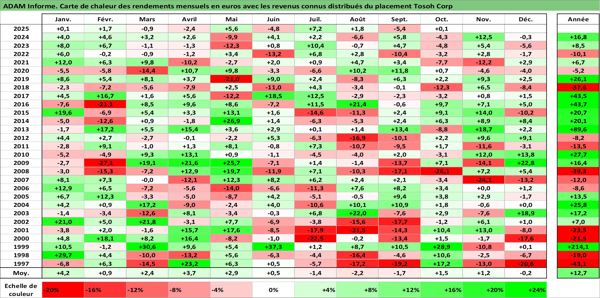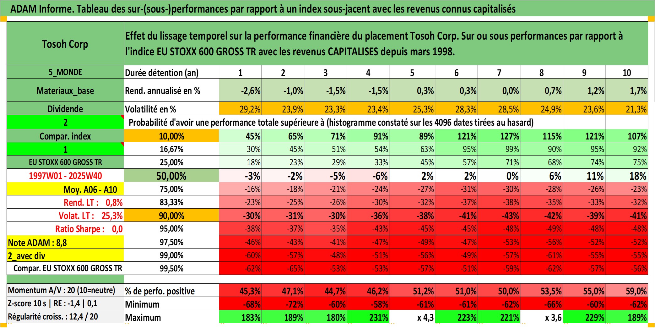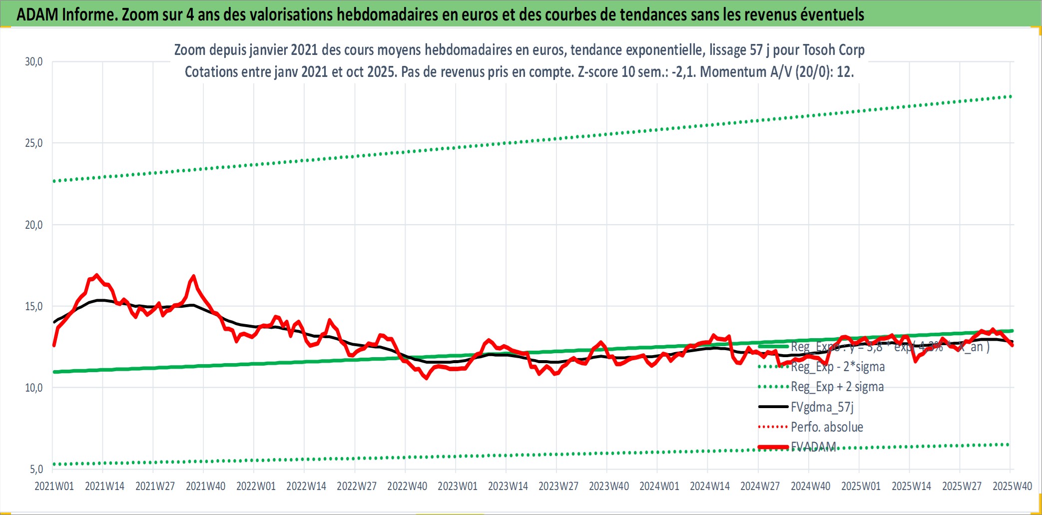 Site dédié aux investisseursPage dédiée sur site financeAnalyse des valorisations hebdomadaires de l'action Tosoh Corp. Cet actif est cote en JPY. Les valorisations sont en contrevaleur EURO et couvrent les semaines 1997W01 a 2025W40. Les revenus de cet actif financier sont pris en compte depuis la semaine 1998W13. La note globale ESG de cet actif est estimee a 7.0 (apres rebasage entre 0 et 20).