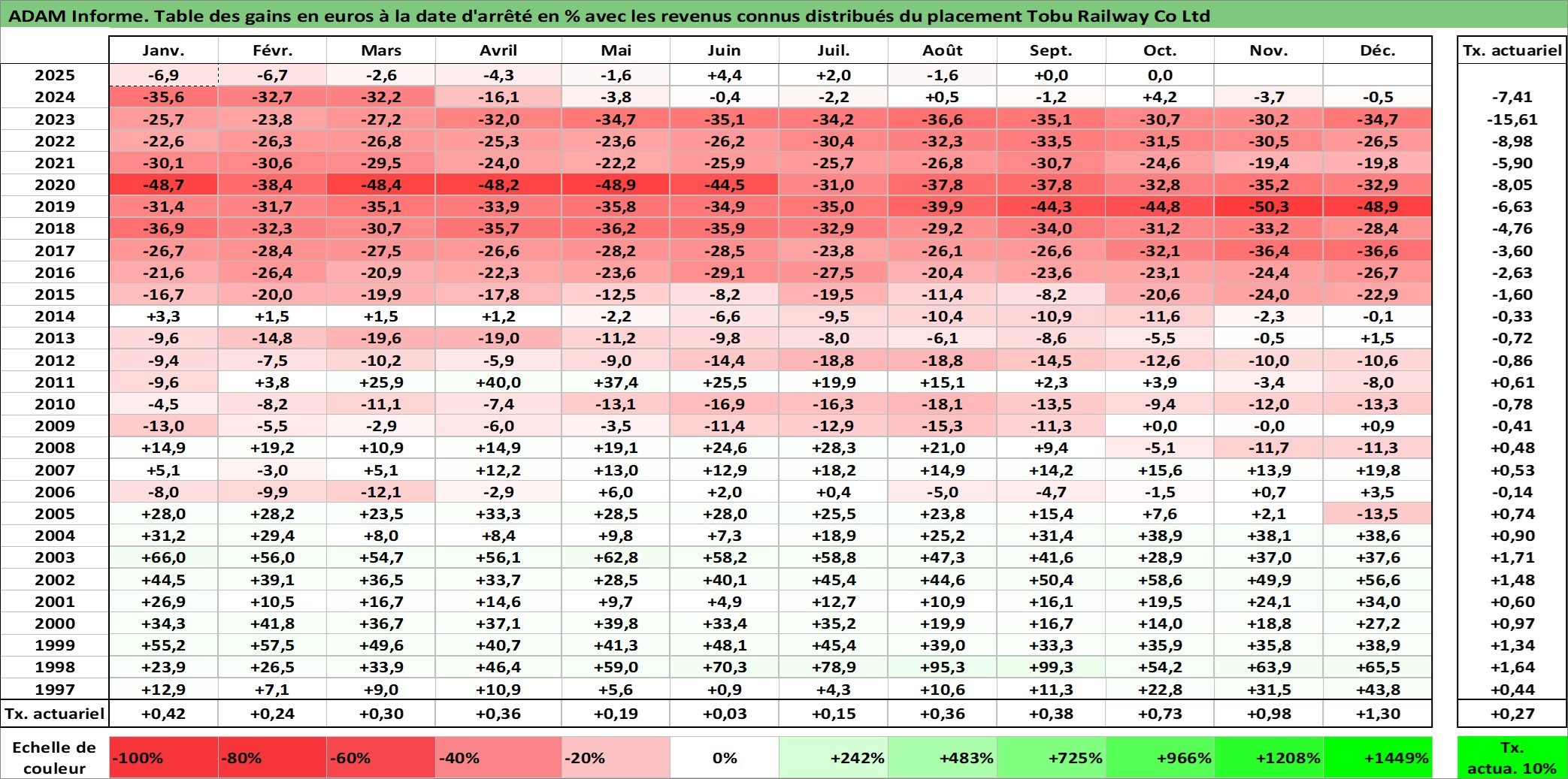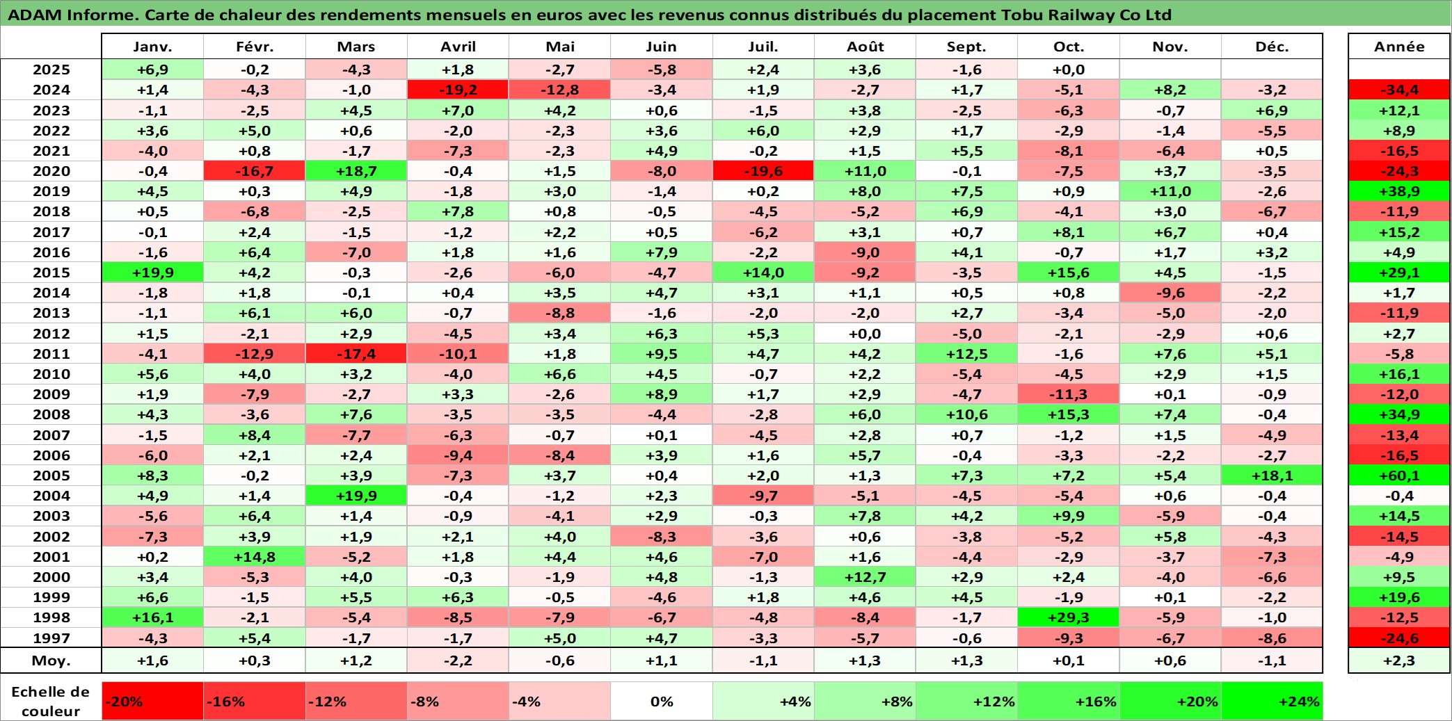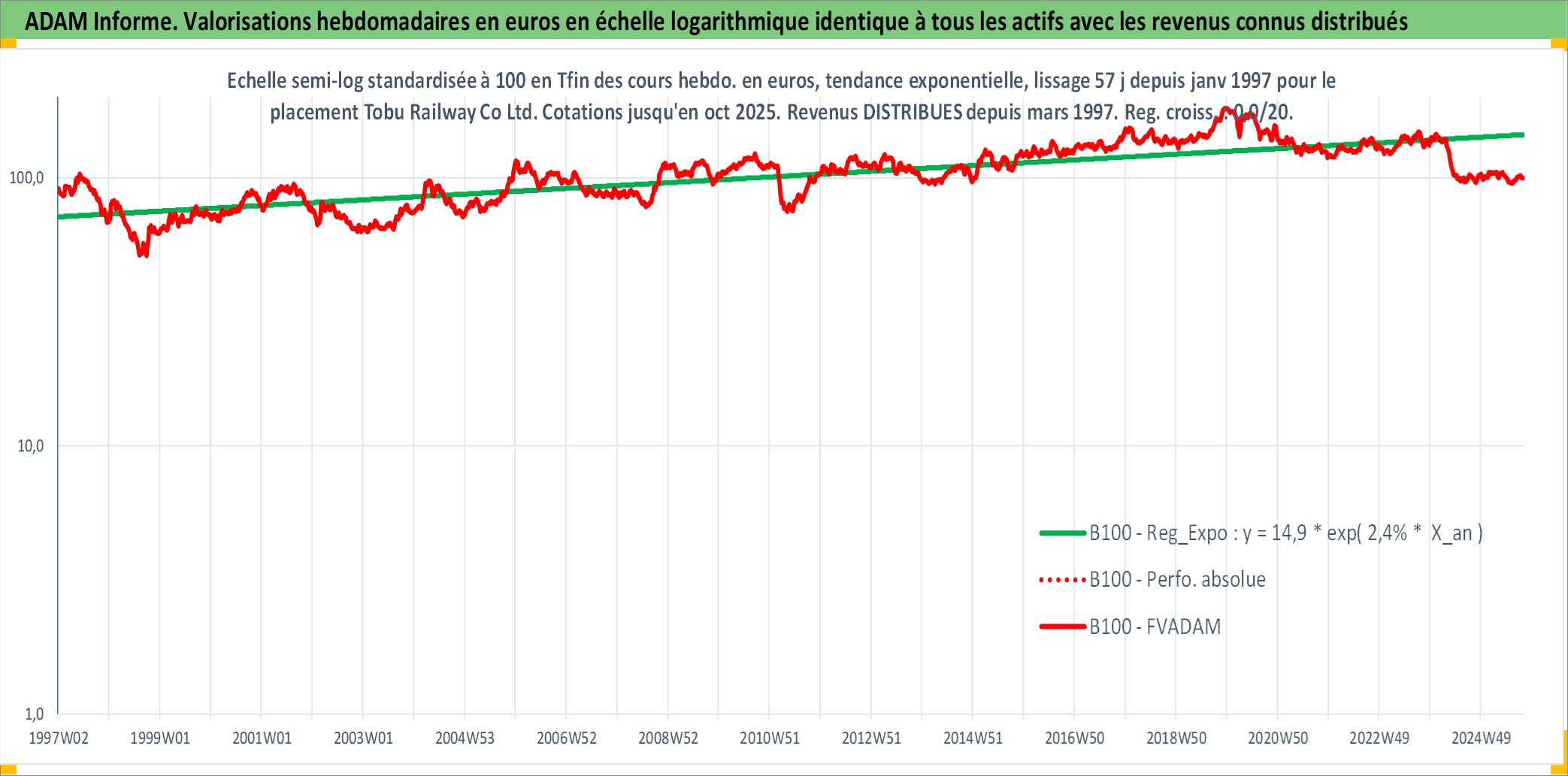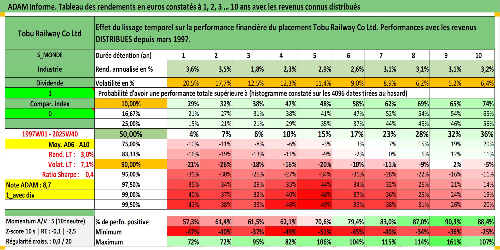 Site dédié aux investisseursPage dédiée sur site financeAnalyse des valorisations hebdomadaires de l'action Tobu Railway Co Ltd. Cet actif est cote en JPY. Les valorisations sont en contrevaleur EURO et couvrent les semaines 1997W01 a 2025W40. Les revenus de cet actif financier sont pris en compte depuis la semaine 1997W13. La note globale ESG de cet actif est estimee a 4.0 (apres rebasage entre 0 et 20).