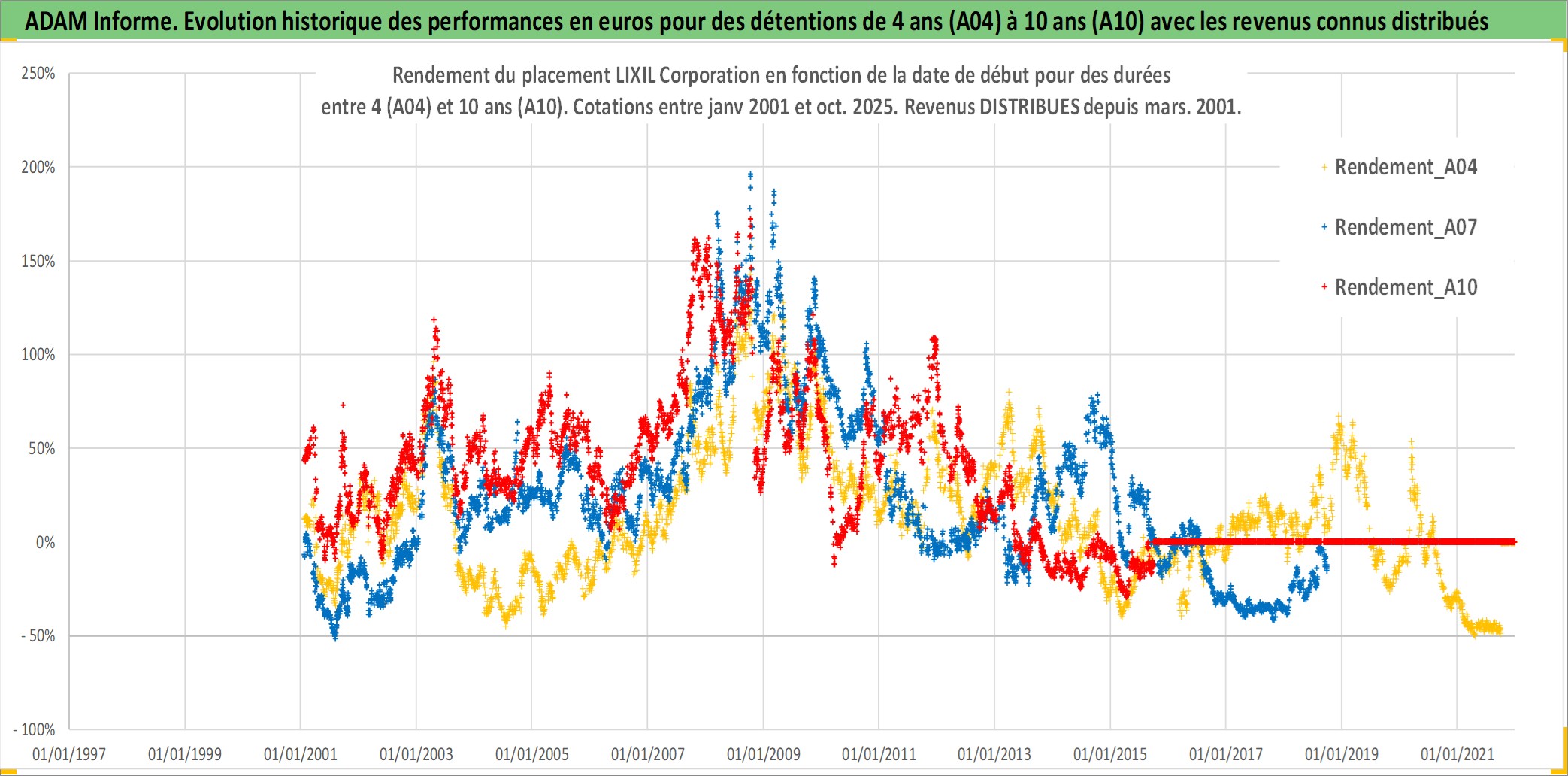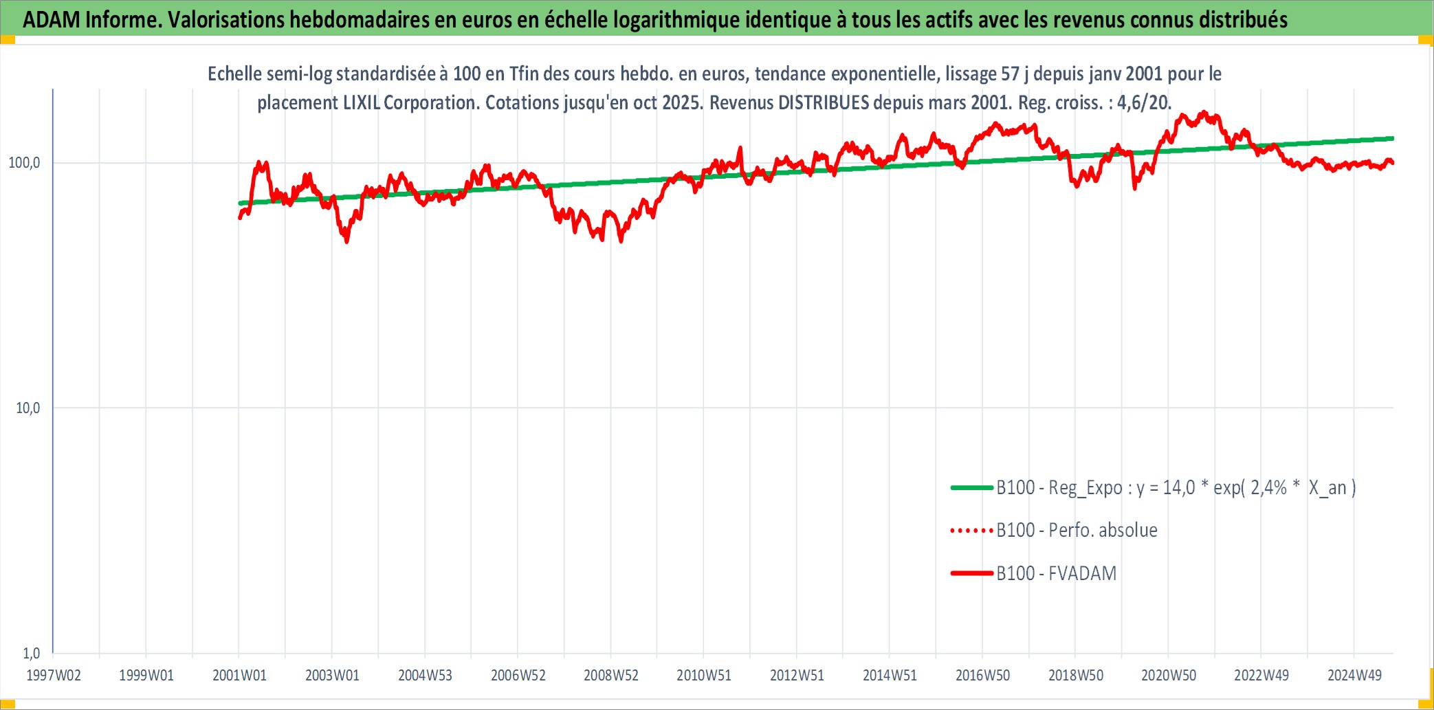 Site dédié aux investisseursPage dédiée sur site financeAnalyse des valorisations hebdomadaires de l'action LIXIL Corporation. Cet actif est cote en JPY. Les valorisations sont en contrevaleur EURO et couvrent les semaines 2001W02 a 2025W40. Les revenus de cet actif financier sont pris en compte depuis la semaine 2001W13. La note globale ESG de cet actif est estimee a 12.0 (apres rebasage entre 0 et 20).