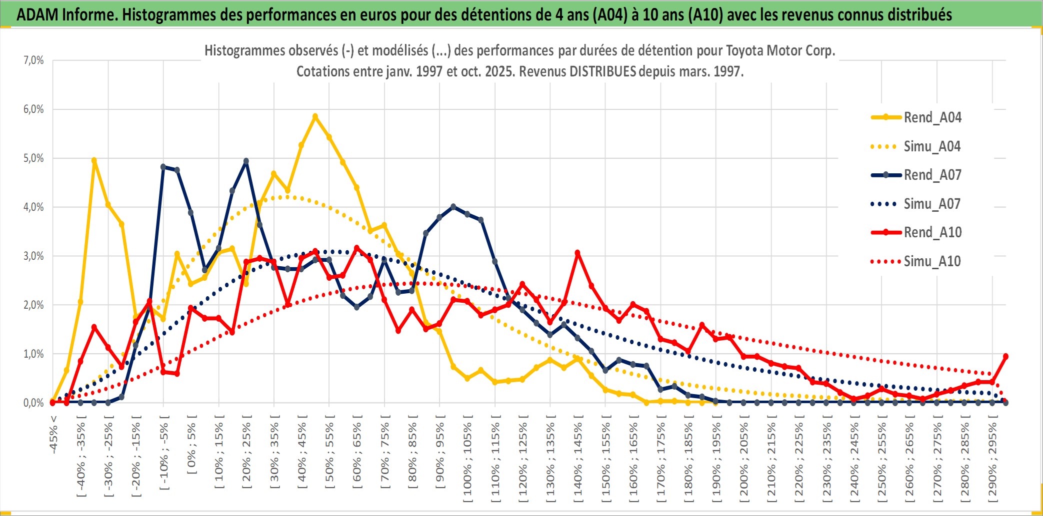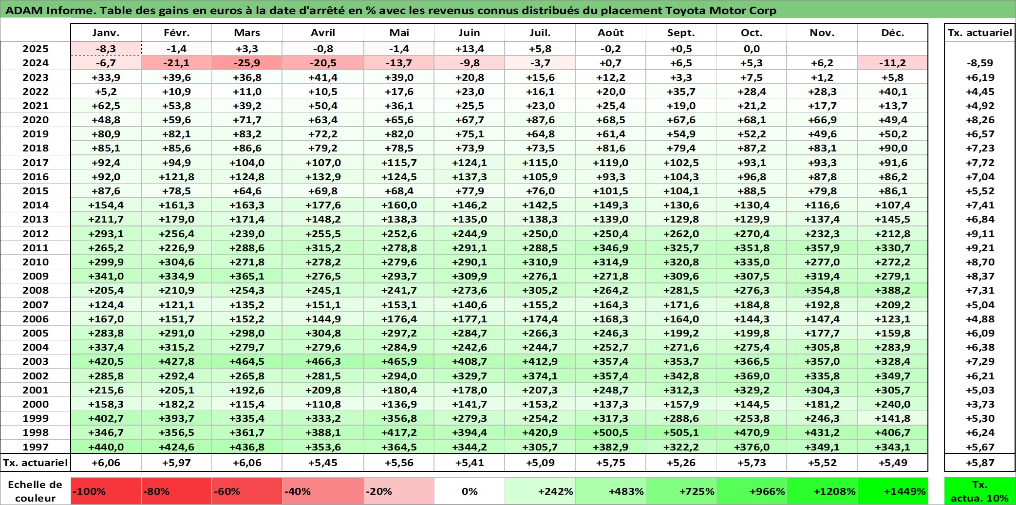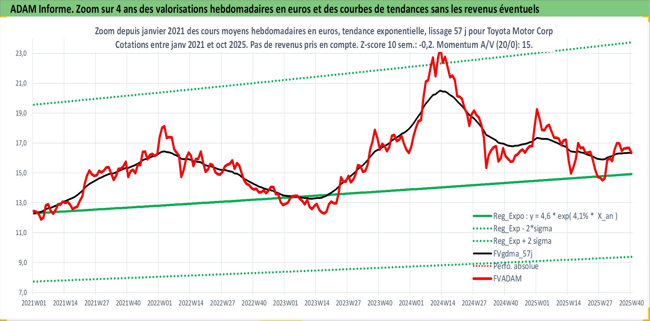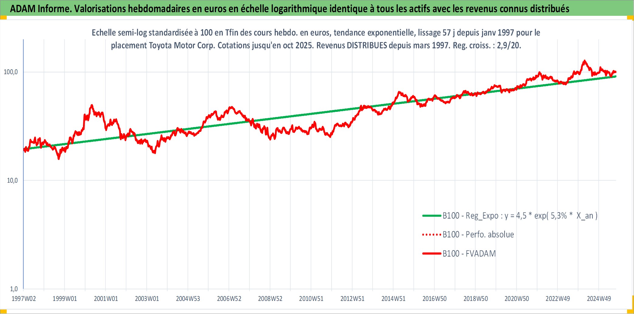 Site dédié aux investisseursPage dédiée sur site financeAnalyse des valorisations hebdomadaires de l'action Toyota Motor Corp. Cet actif est cote en JPY. Les valorisations sont en contrevaleur EURO et couvrent les semaines 1997W01 a 2025W40. Les revenus de cet actif financier sont pris en compte depuis la semaine 1997W13. La note globale ESG de cet actif est estimee a 6.0 (apres rebasage entre 0 et 20).