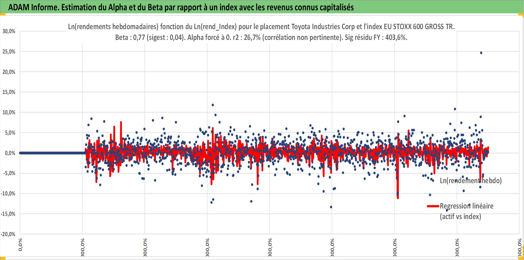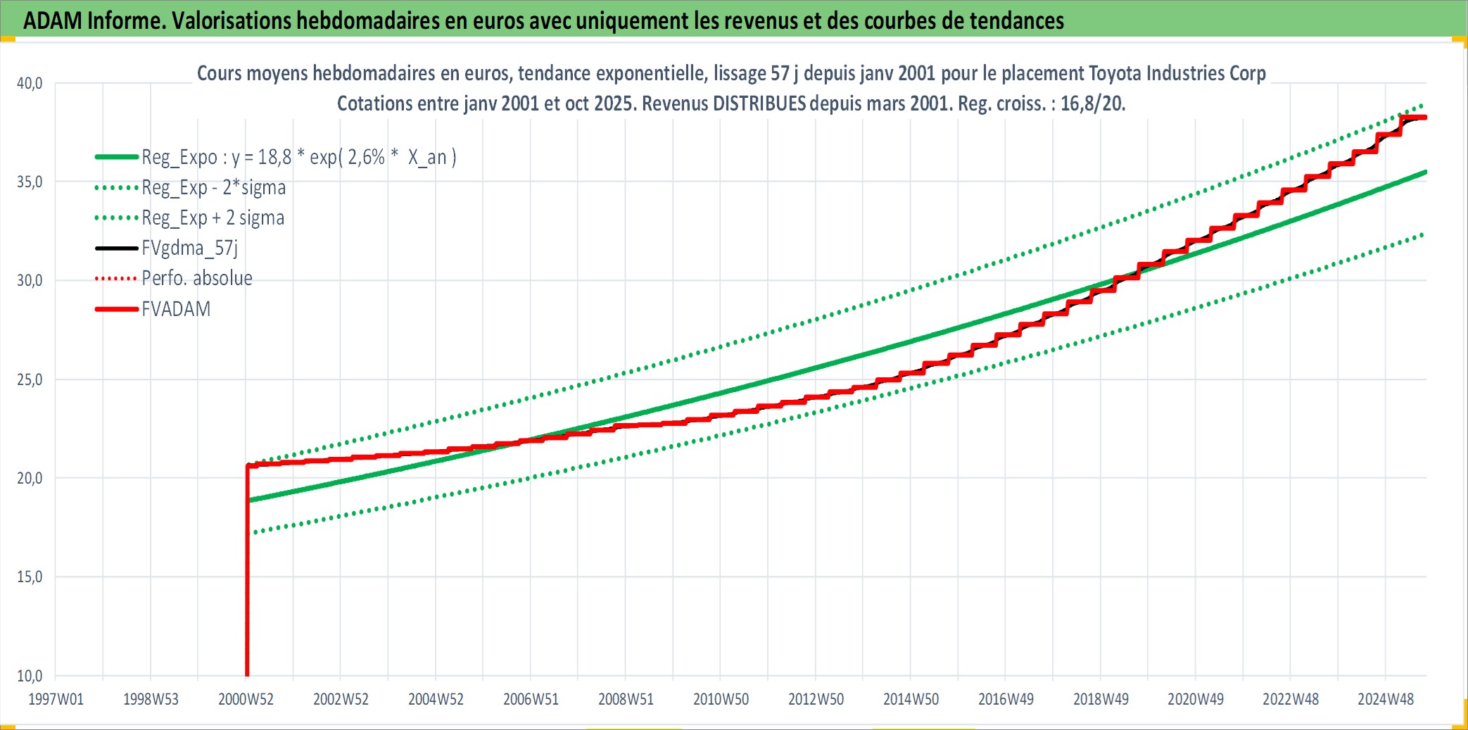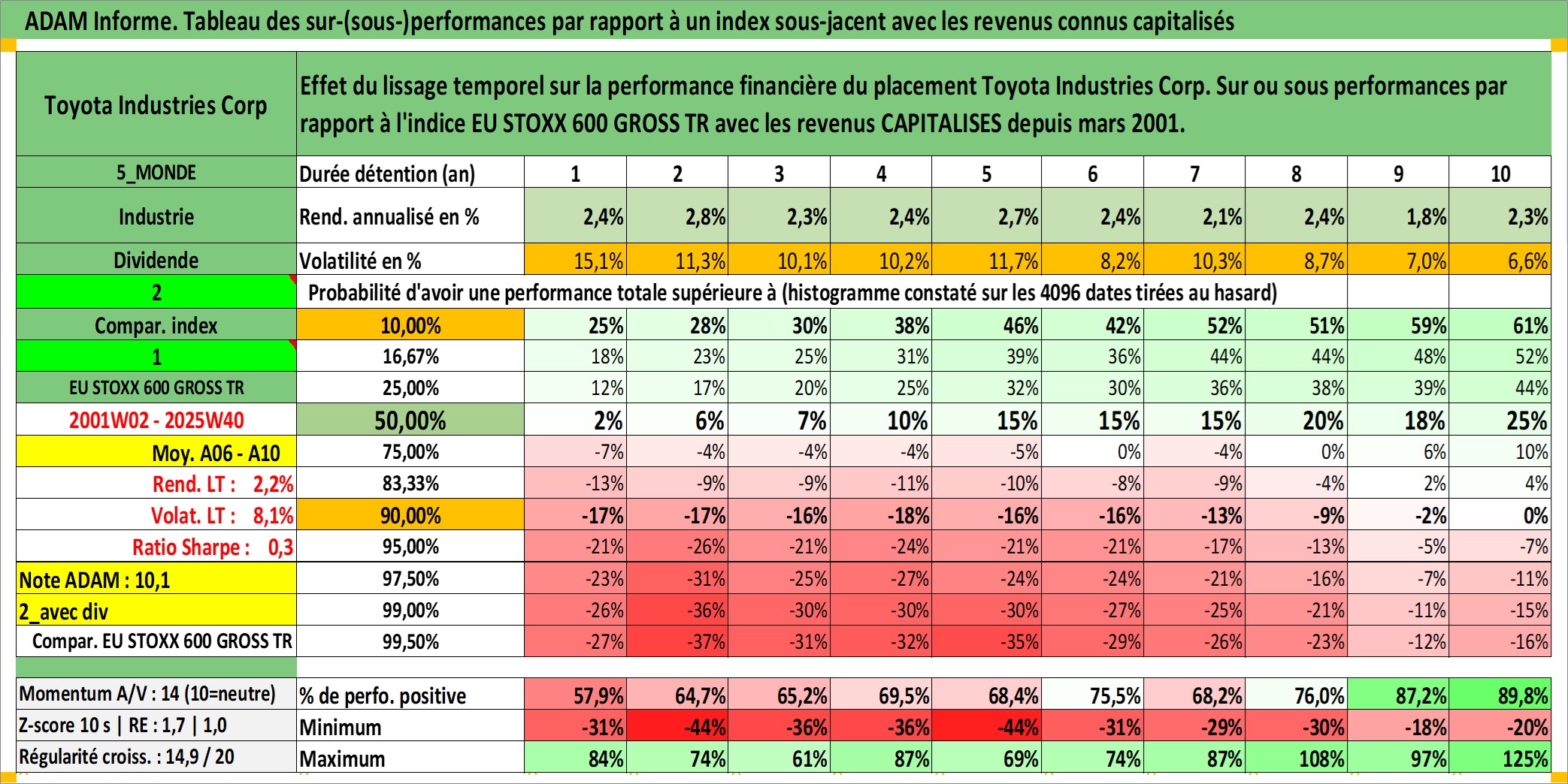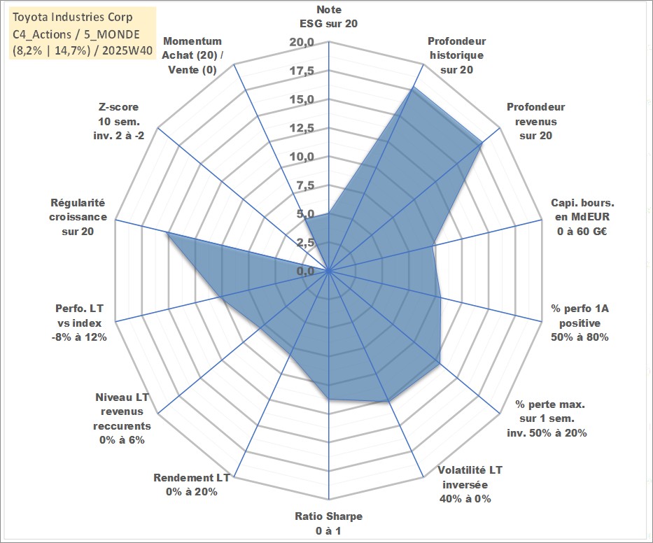 Site dédié aux investisseursPage dédiée sur site financeAnalyse des valorisations hebdomadaires de l'action Toyota Industries Corp. Cet actif est cote en JPY. Les valorisations sont en contrevaleur EURO et couvrent les semaines 2001W02 a 2025W40. Les revenus de cet actif financier sont pris en compte depuis la semaine 2001W13. La note globale ESG de cet actif est estimee a 5.0 (apres rebasage entre 0 et 20).