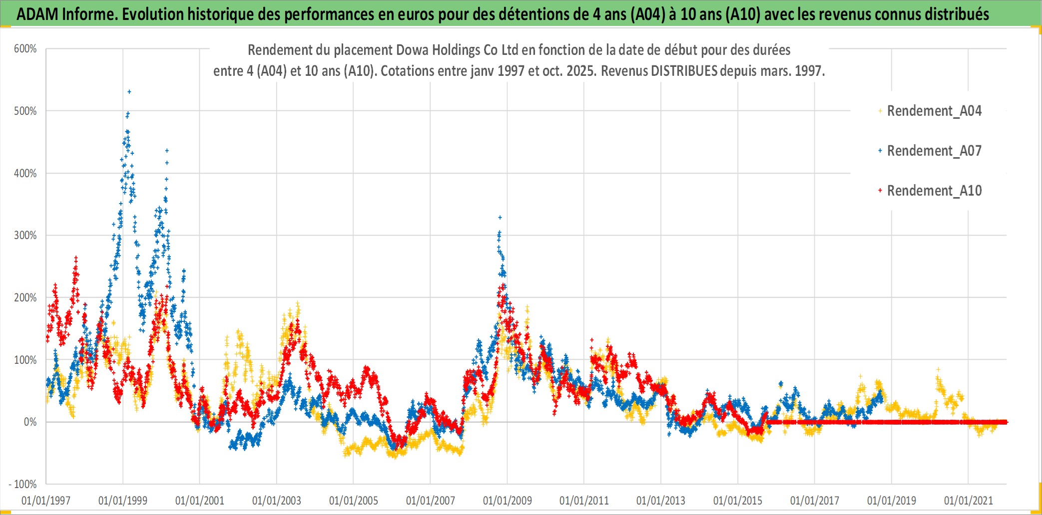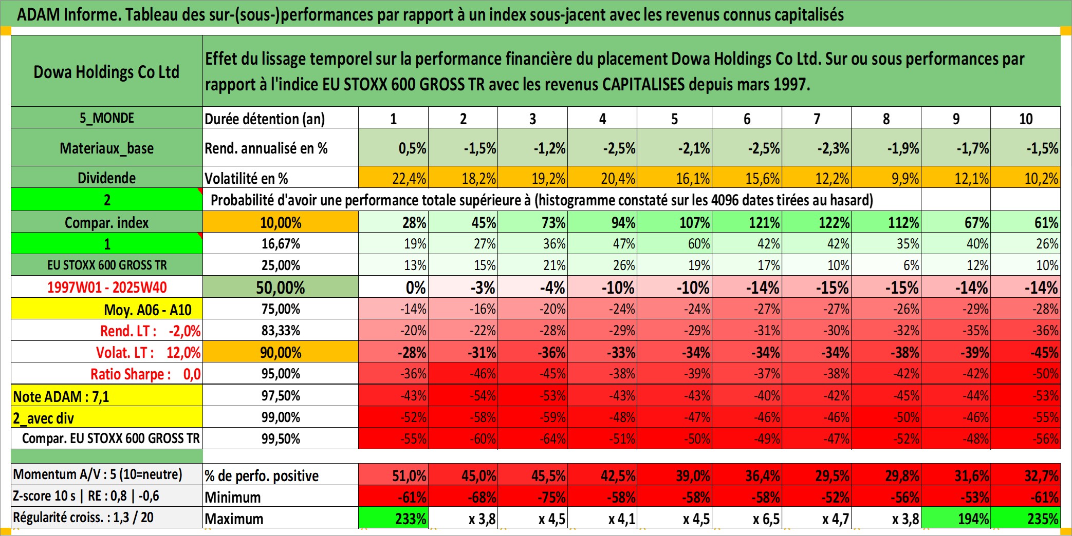 Site dédié aux investisseursPage dédiée sur site financeAnalyse des valorisations hebdomadaires de l'action Dowa Holdings Co Ltd. Cet actif est cote en JPY. Les valorisations sont en contrevaleur EURO et couvrent les semaines 1997W01 a 2025W40. Les revenus de cet actif financier sont pris en compte depuis la semaine 1997W13. La note ESG de cet actif n'est pas connue.