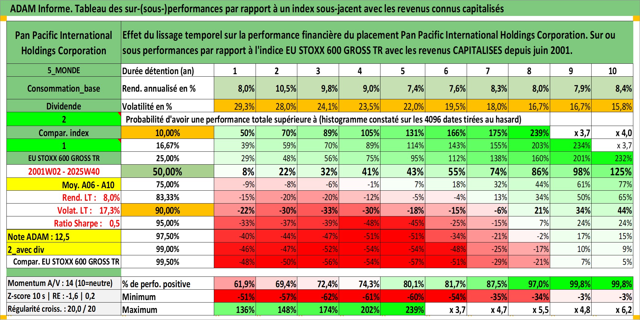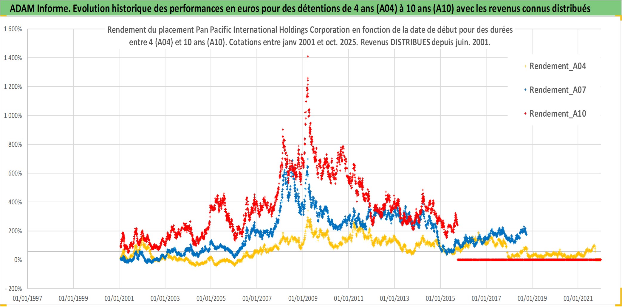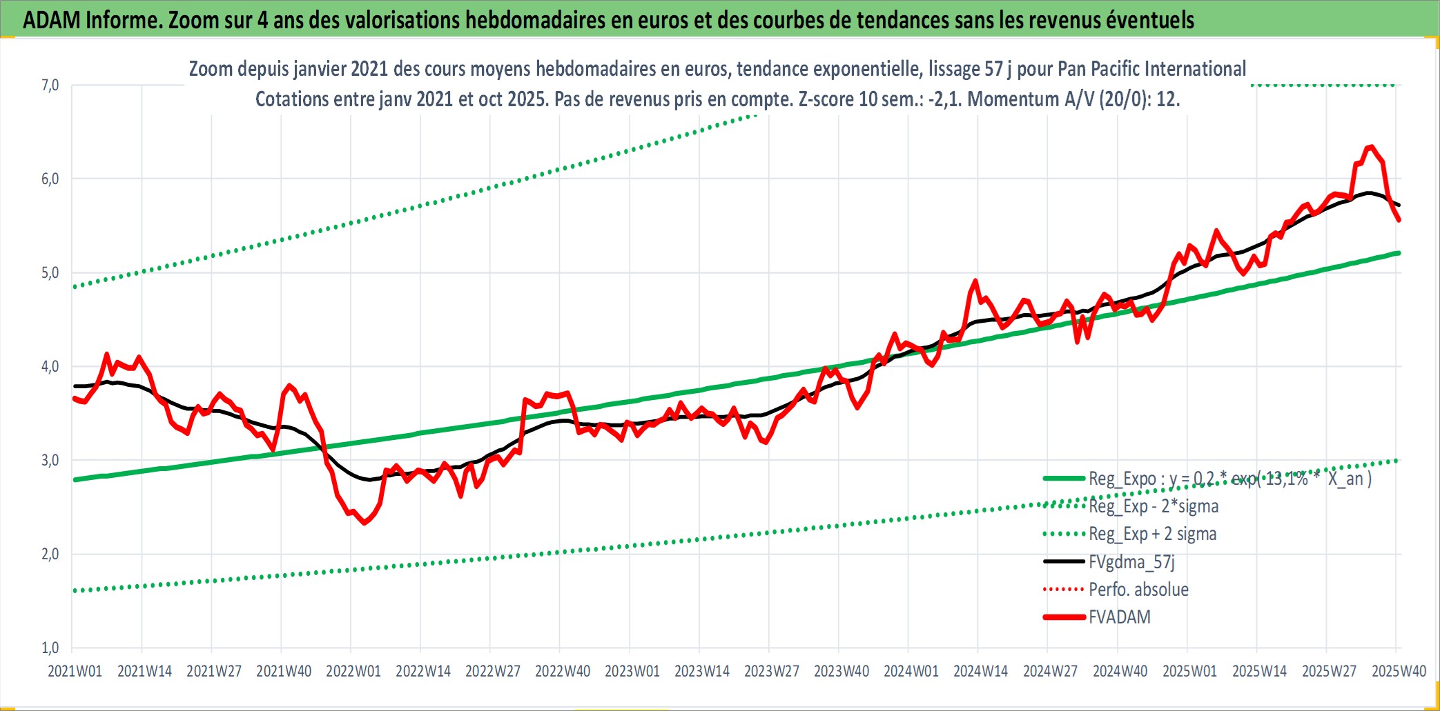 Site dédié aux investisseursPage dédiée sur site financeAnalyse des valorisations hebdomadaires de l'action Pan Pacific International Holdings Corporation. Cet actif est cote en JPY. Les valorisations sont en contrevaleur EURO et couvrent les semaines 2001W02 a 2025W40. Les revenus de cet actif financier sont pris en compte depuis la semaine 2001W26. La note globale ESG de cet actif est estimee a 11.0 (apres rebasage entre 0 et 20).
