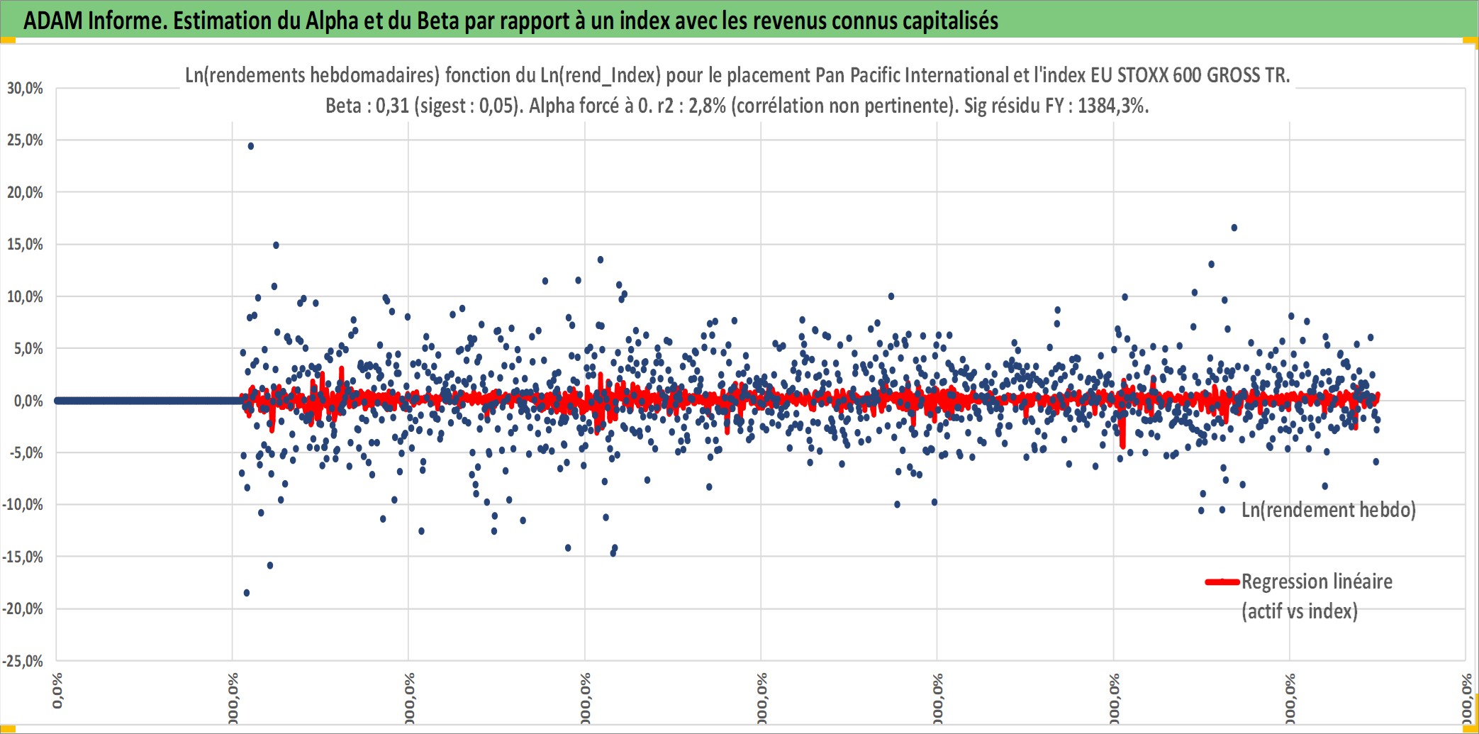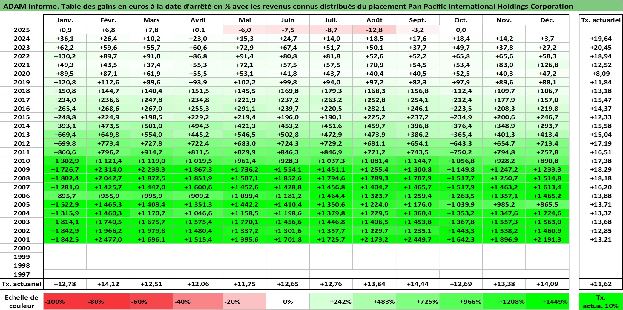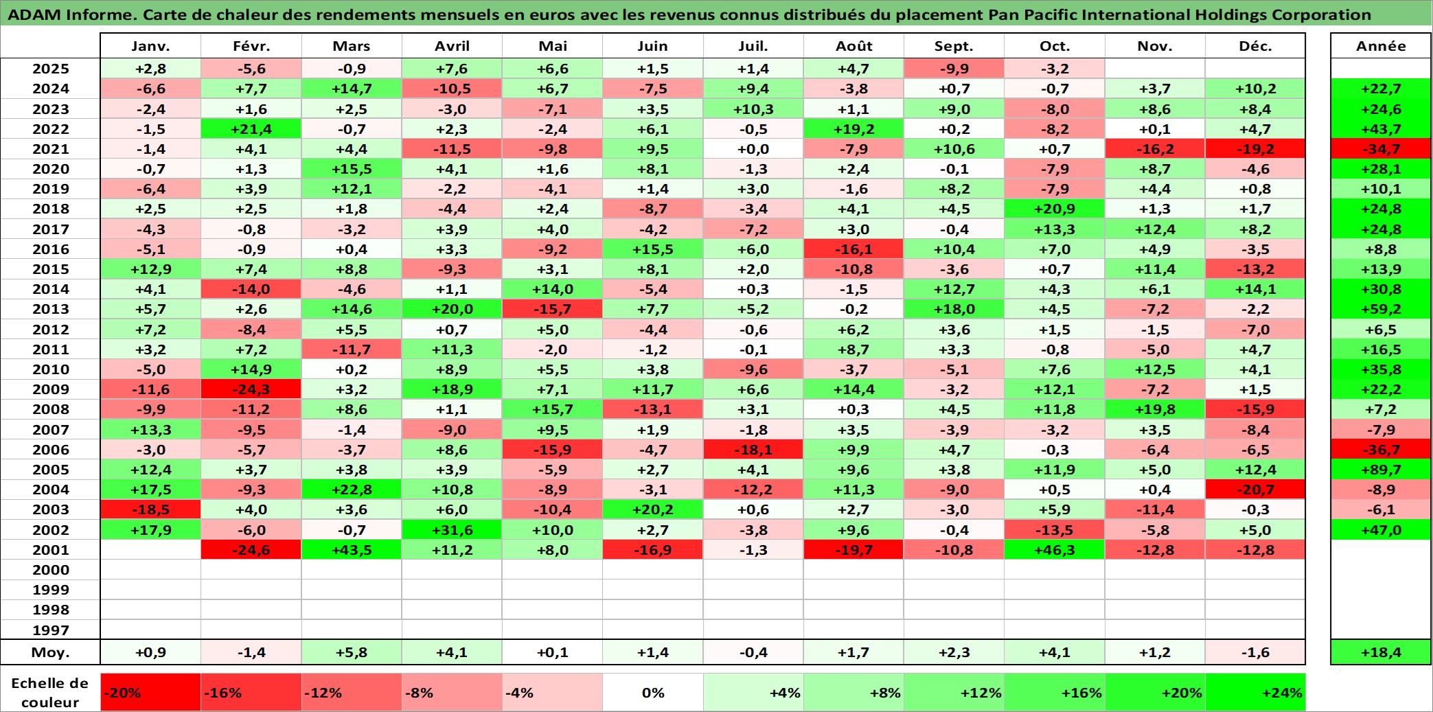 Site dédié aux investisseursPage dédiée sur site financeAnalyse des valorisations hebdomadaires de l'action Pan Pacific International Holdings Corporation. Cet actif est cote en JPY. Les valorisations sont en contrevaleur EURO et couvrent les semaines 2001W02 a 2025W40. Les revenus de cet actif financier sont pris en compte depuis la semaine 2001W26. La note globale ESG de cet actif est estimee a 11.0 (apres rebasage entre 0 et 20).
