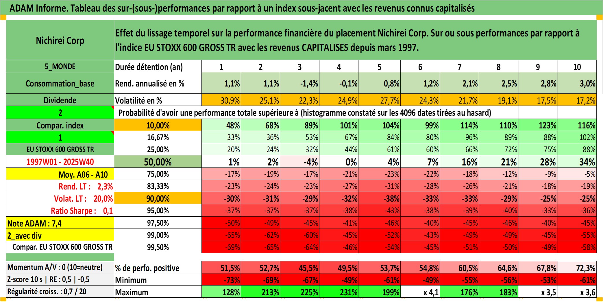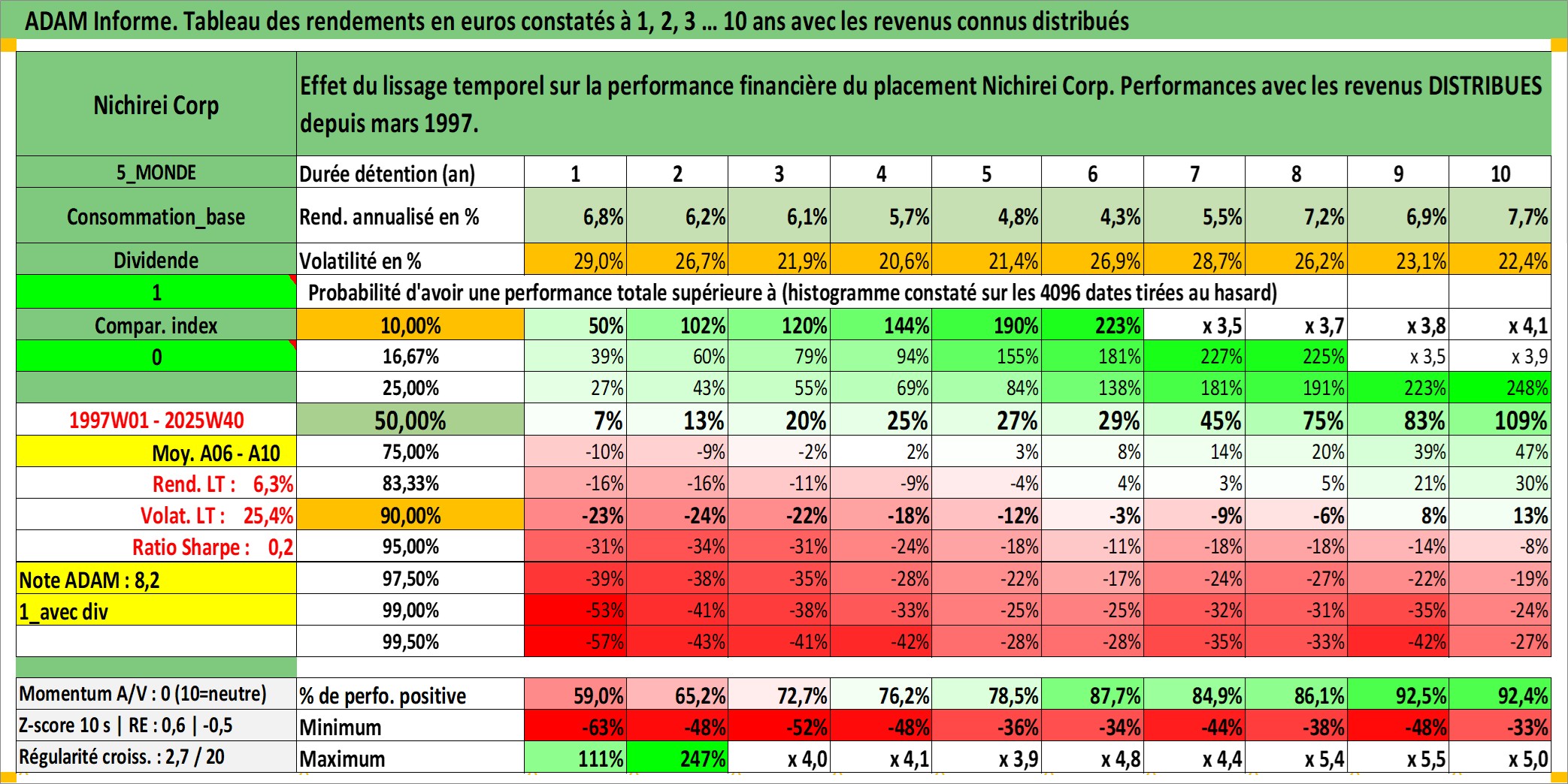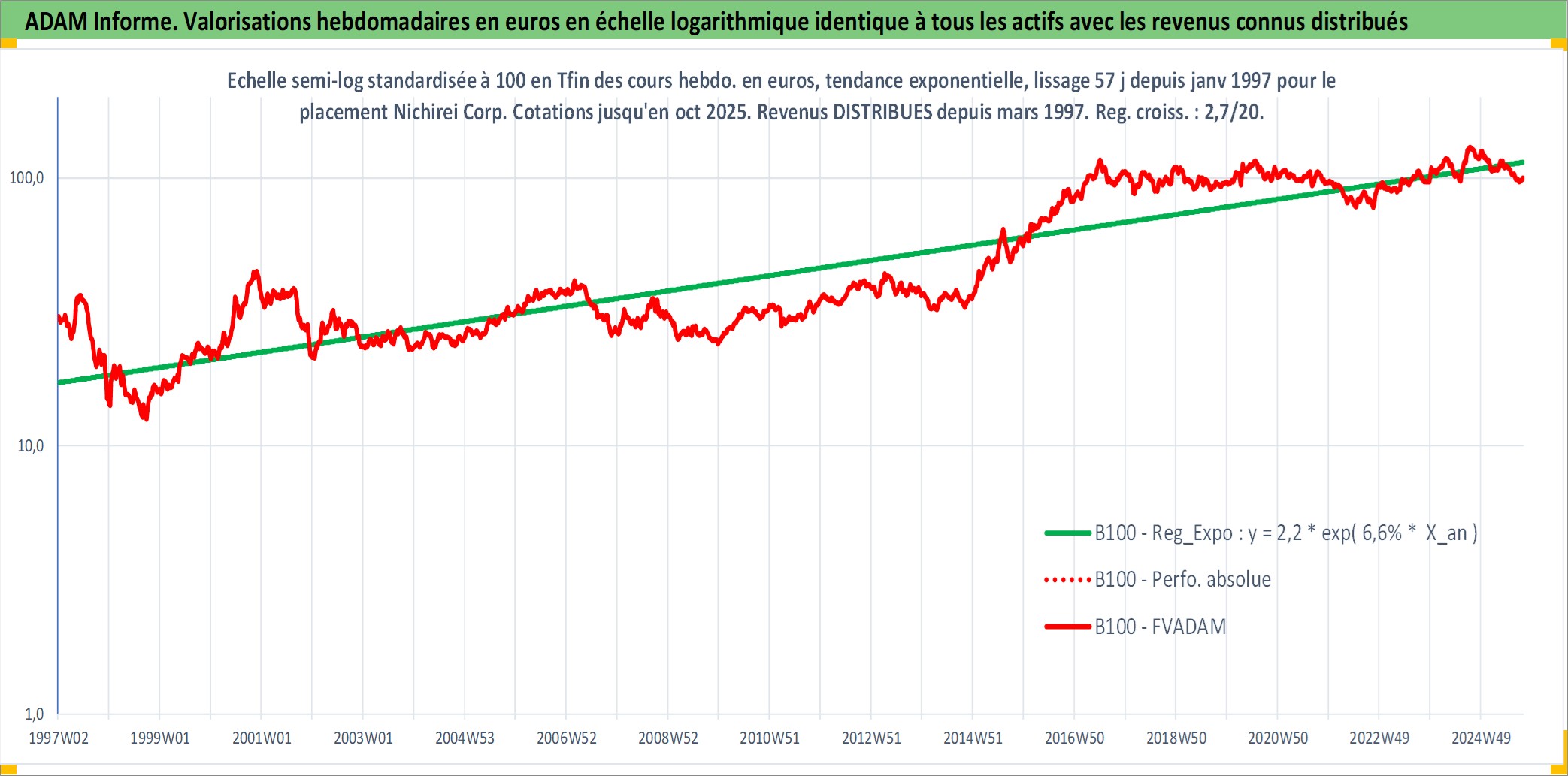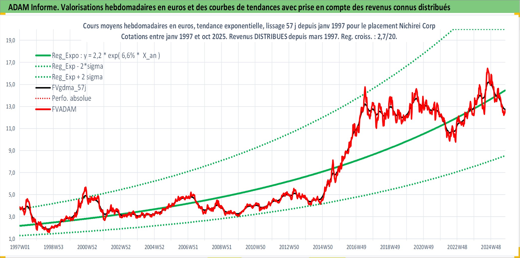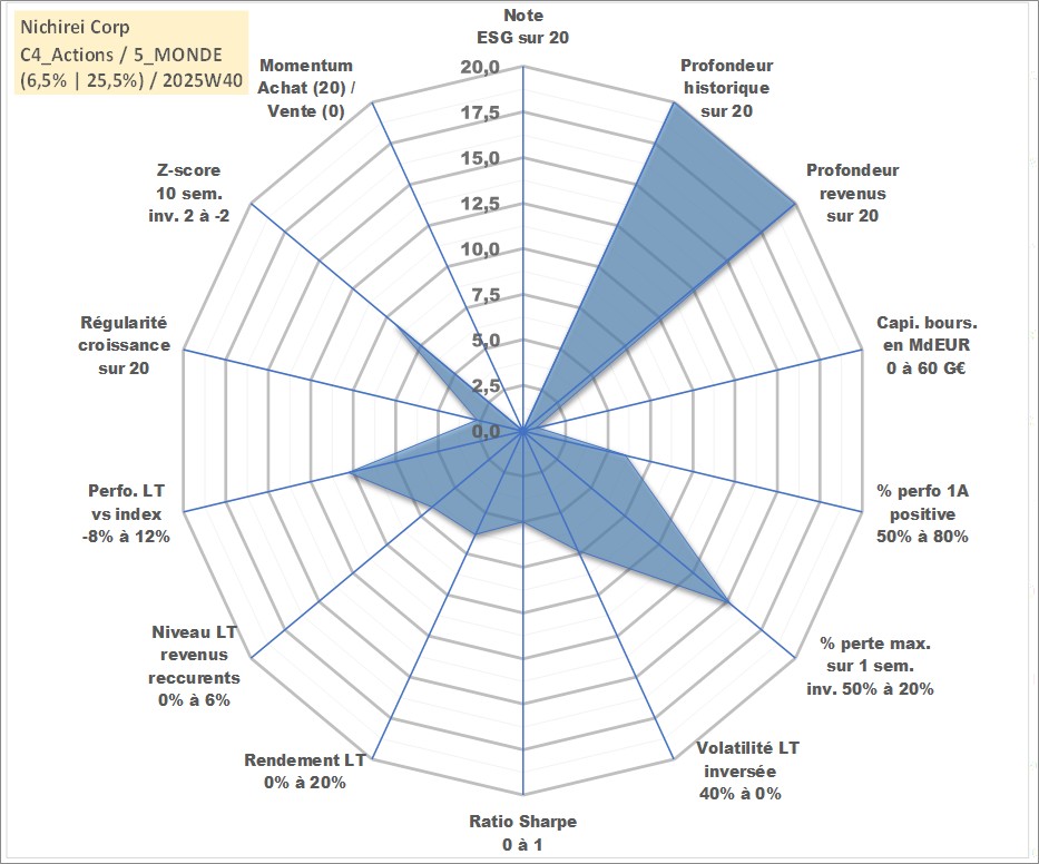 Site dédié aux investisseursPage dédiée sur site financeAnalyse des valorisations hebdomadaires de l'action Nichirei Corp. Cet actif est cote en JPY. Les valorisations sont en contrevaleur EURO et couvrent les semaines 1997W01 a 2025W40. Les revenus de cet actif financier sont pris en compte depuis la semaine 1997W13. La note ESG de cet actif n'est pas connue.