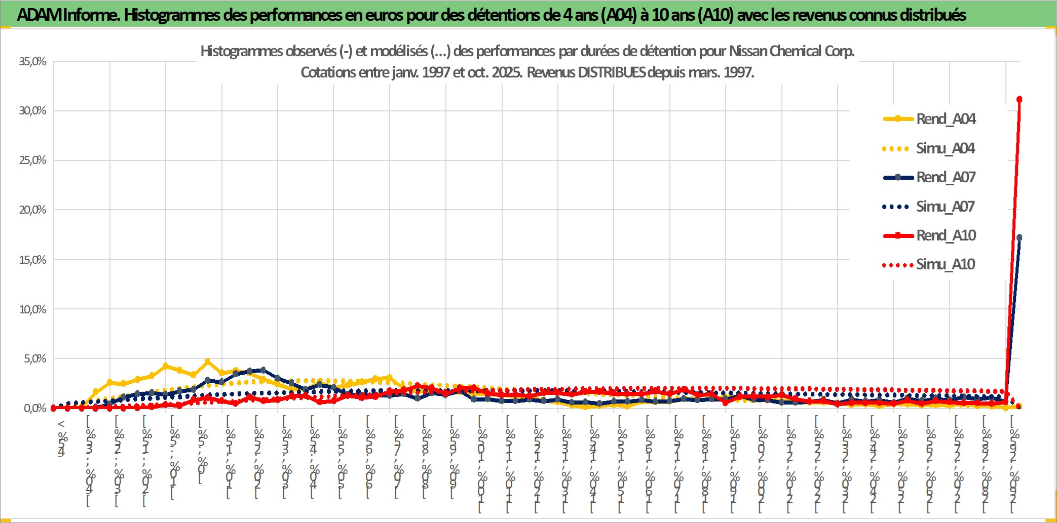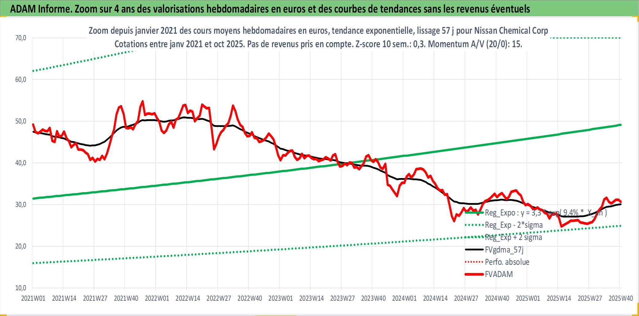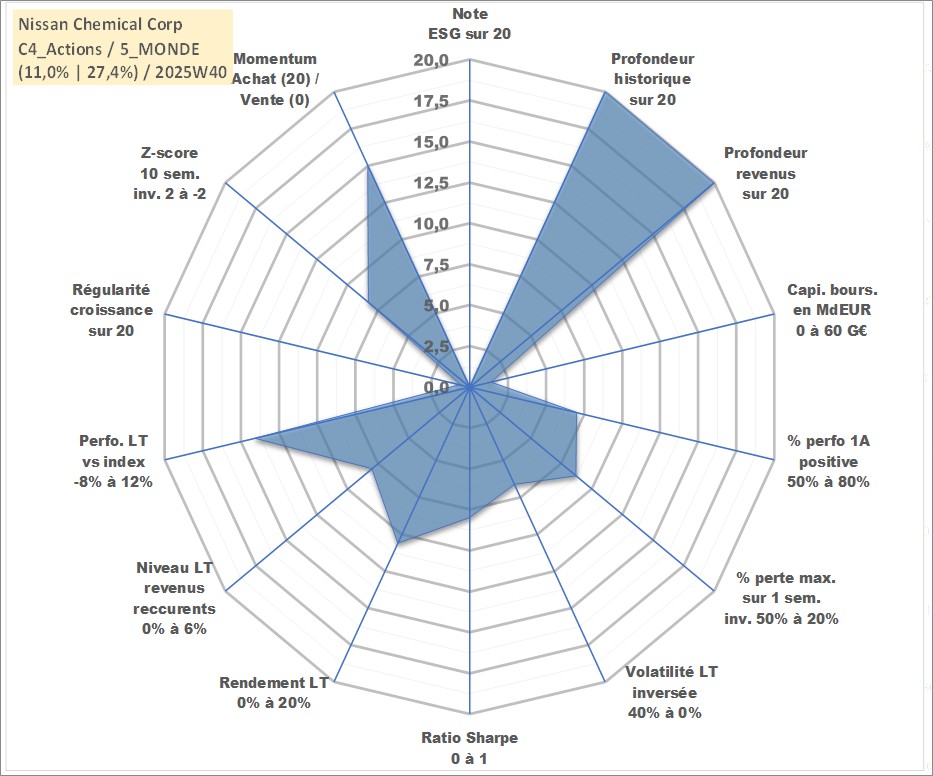 Site dédié aux investisseursPage dédiée sur site financeAnalyse des valorisations hebdomadaires de l'action Nissan Chemical Corp. Cet actif est cote en JPY. Les valorisations sont en contrevaleur EURO et couvrent les semaines 1997W01 a 2025W40. Les revenus de cet actif financier sont pris en compte depuis la semaine 1997W13. La note ESG de cet actif n'est pas connue.