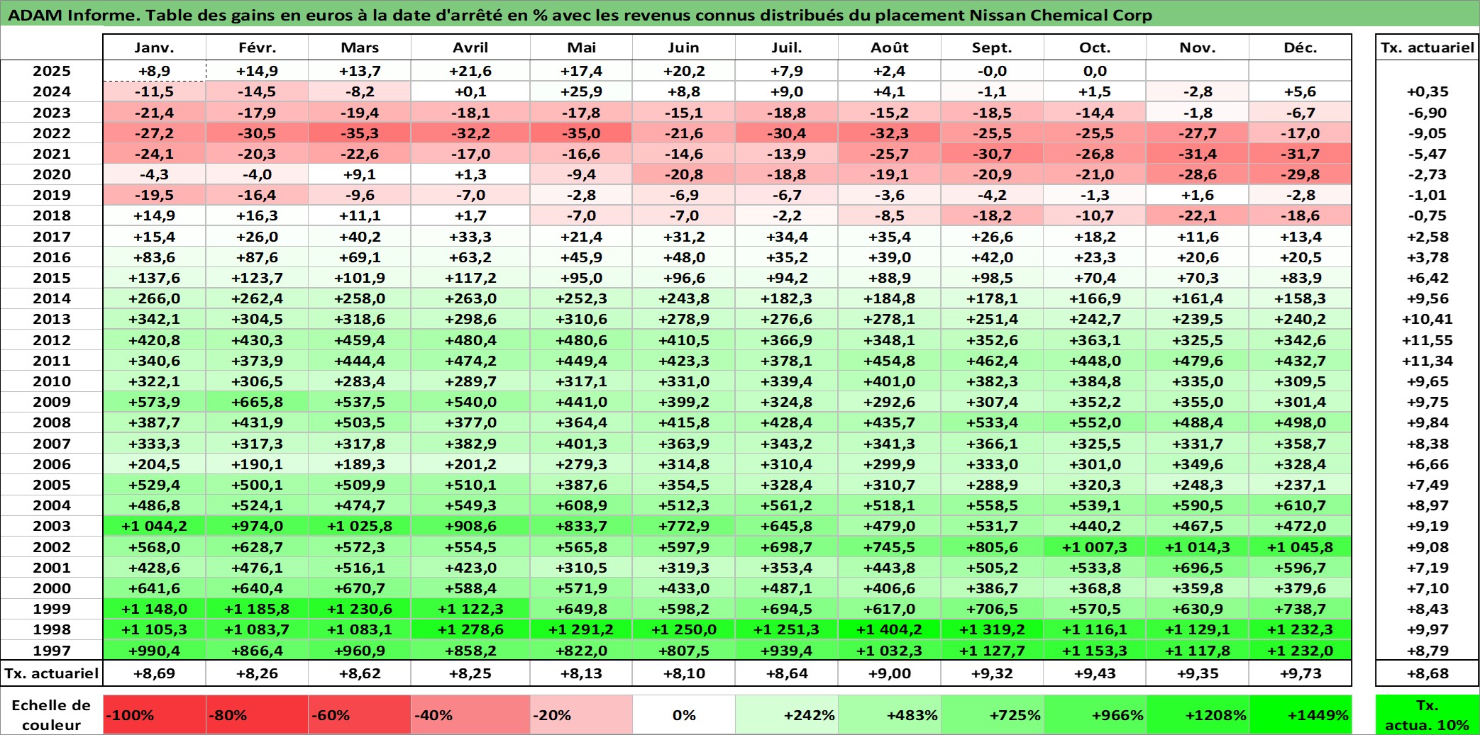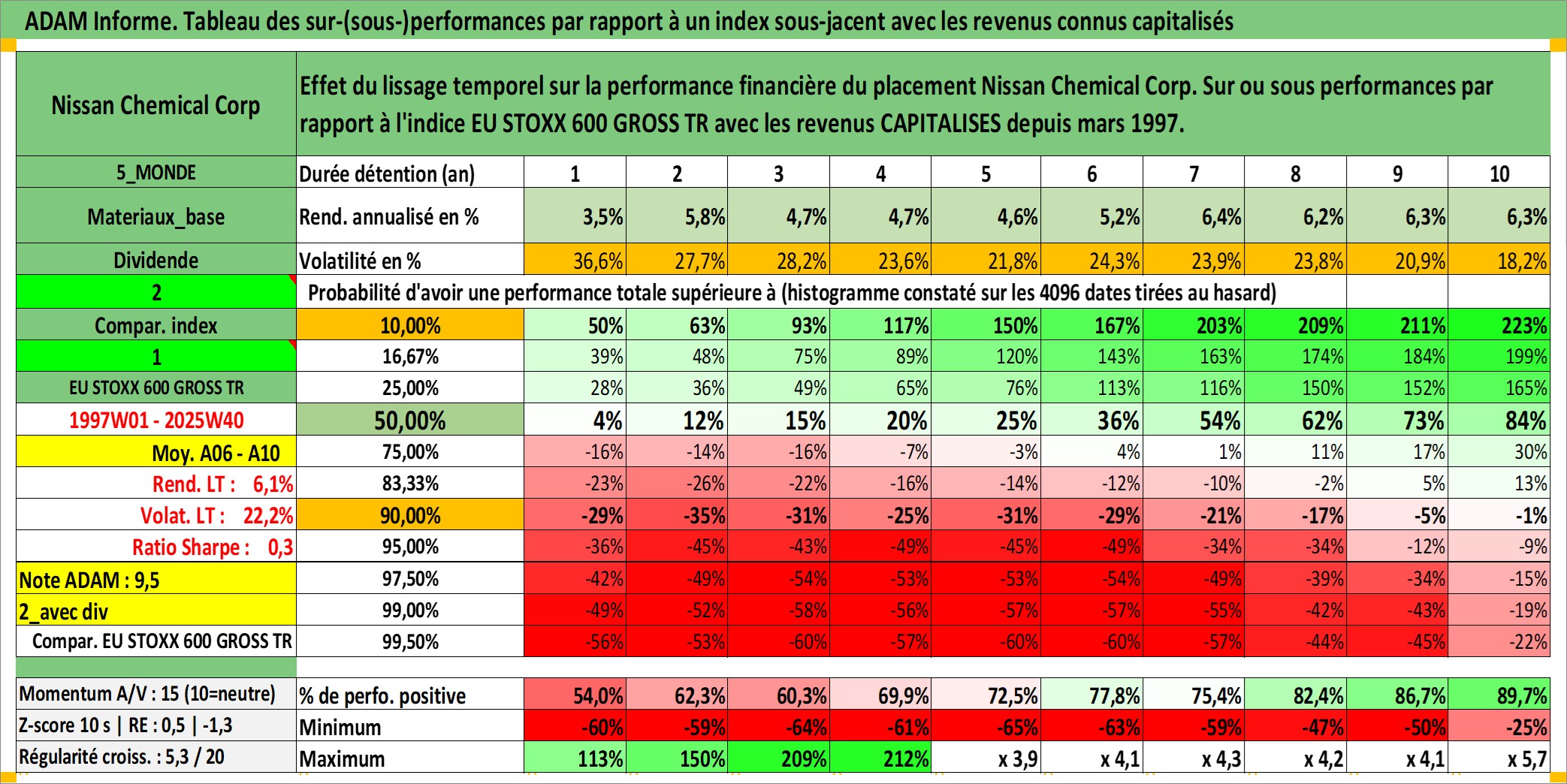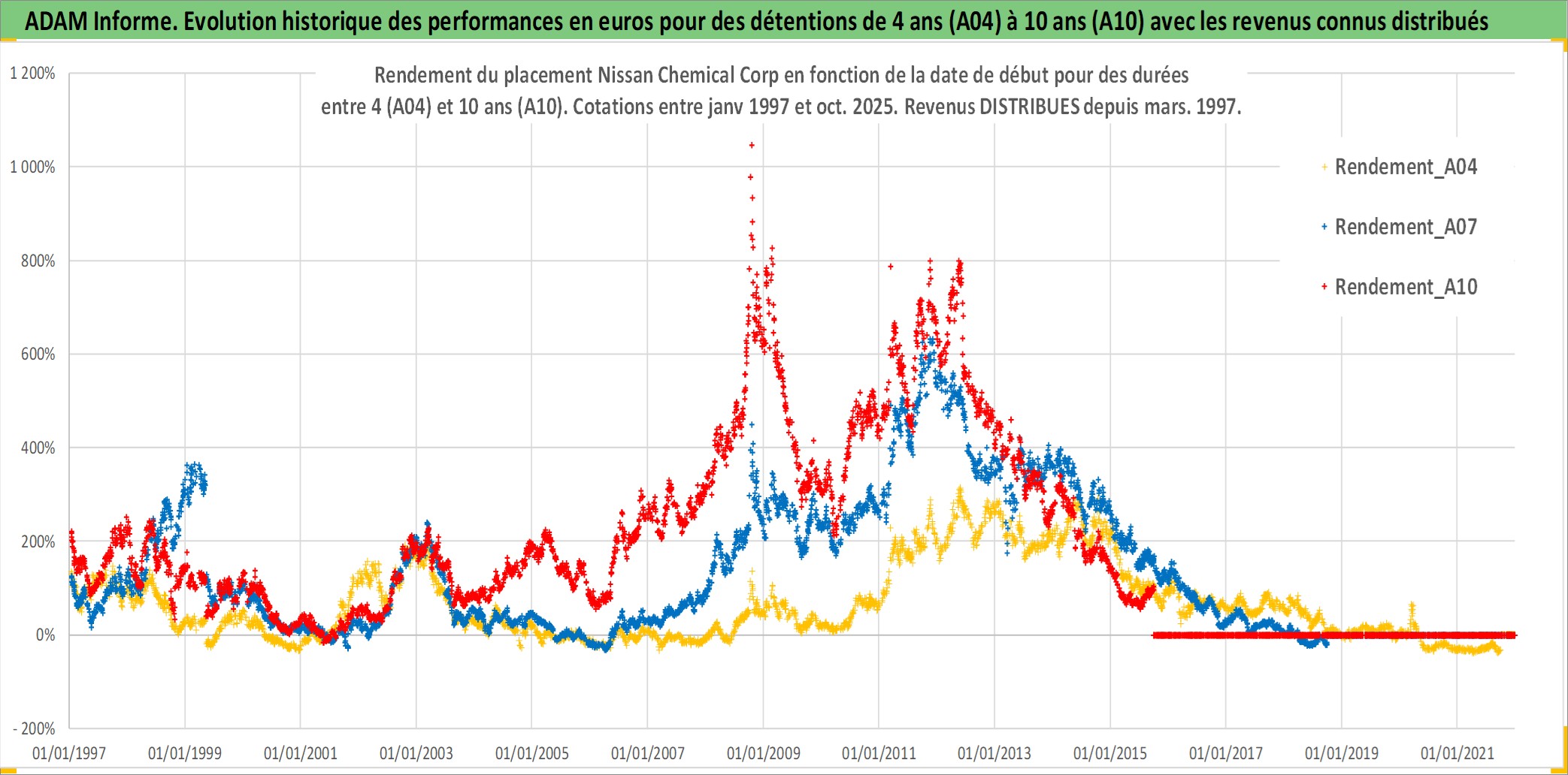 Site dédié aux investisseursPage dédiée sur site financeAnalyse des valorisations hebdomadaires de l'action Nissan Chemical Corp. Cet actif est cote en JPY. Les valorisations sont en contrevaleur EURO et couvrent les semaines 1997W01 a 2025W40. Les revenus de cet actif financier sont pris en compte depuis la semaine 1997W13. La note ESG de cet actif n'est pas connue.