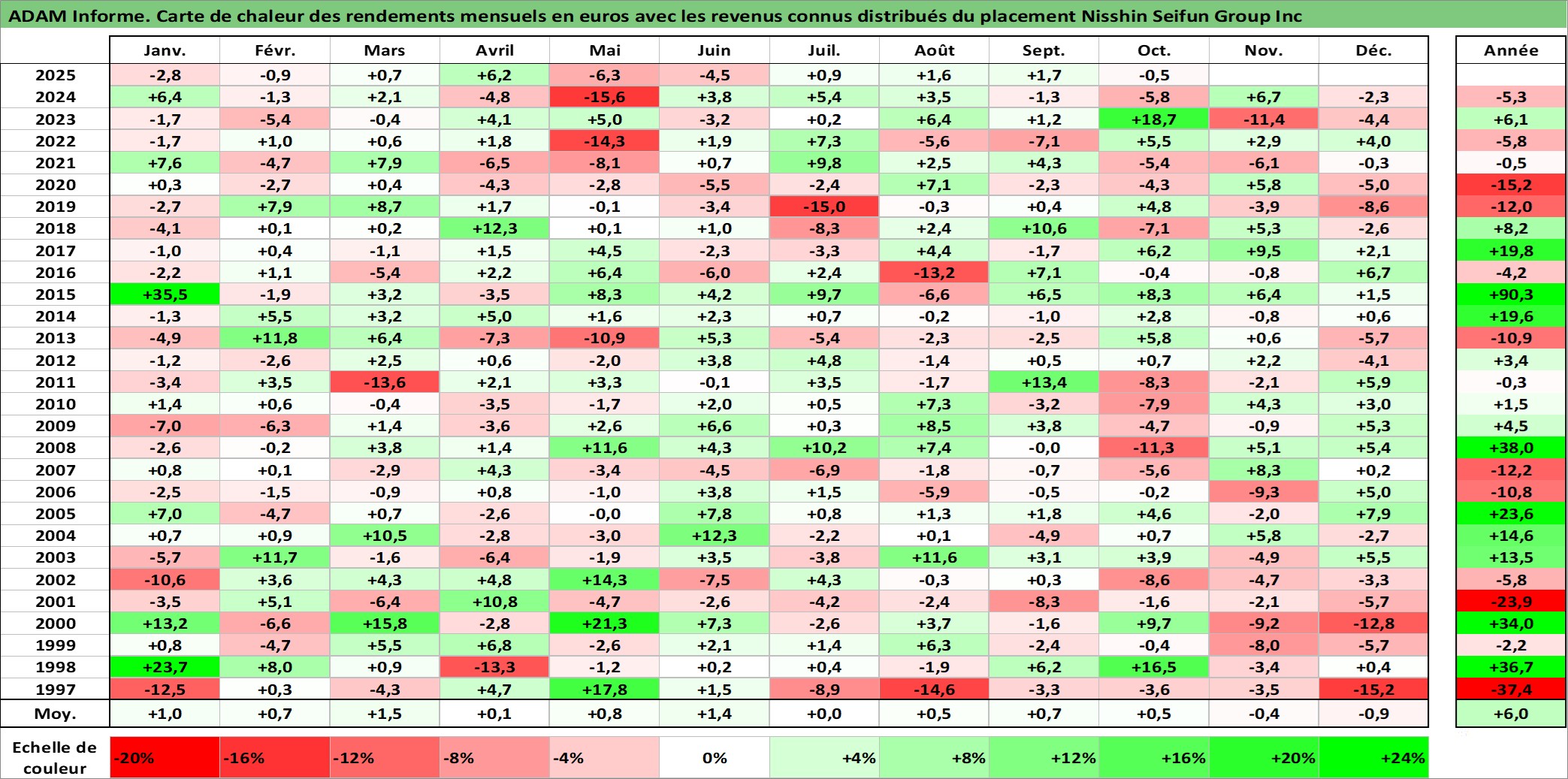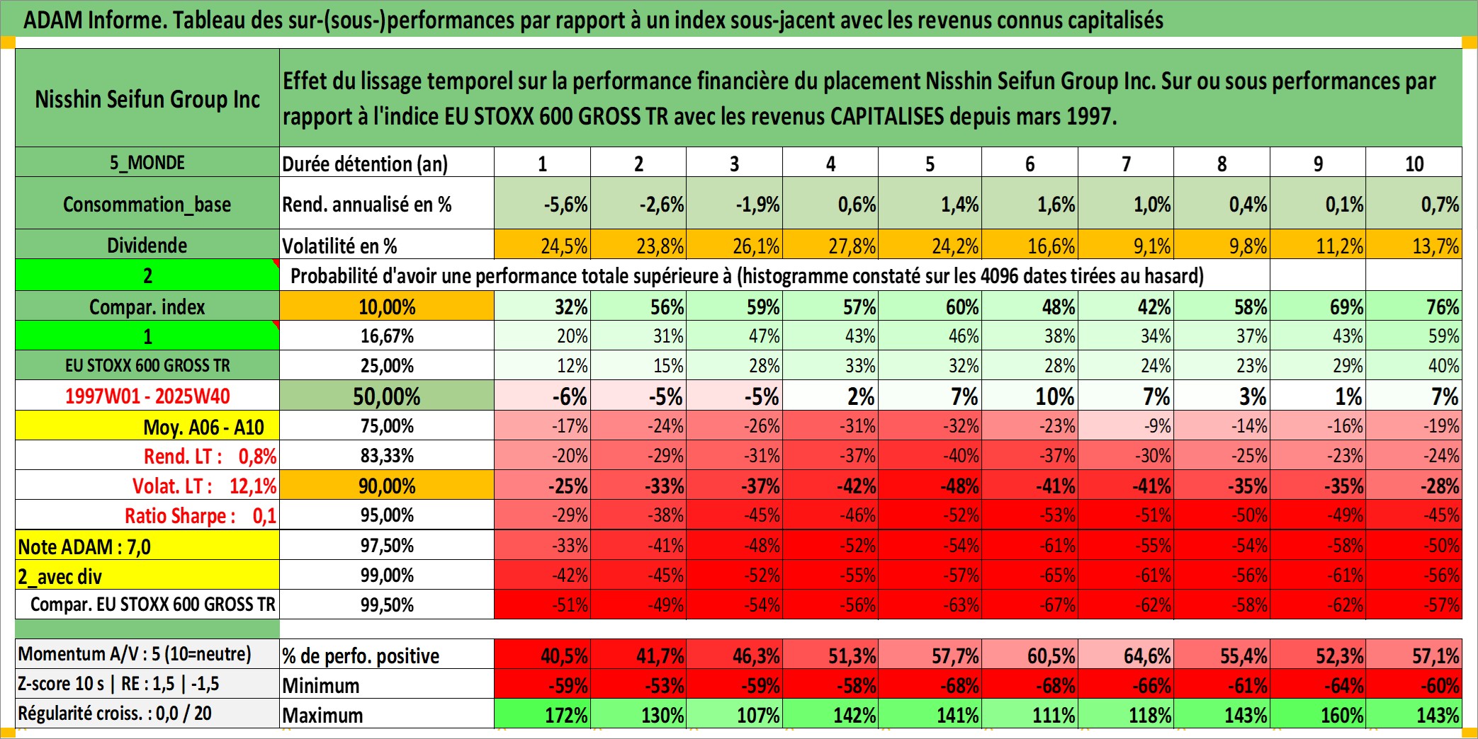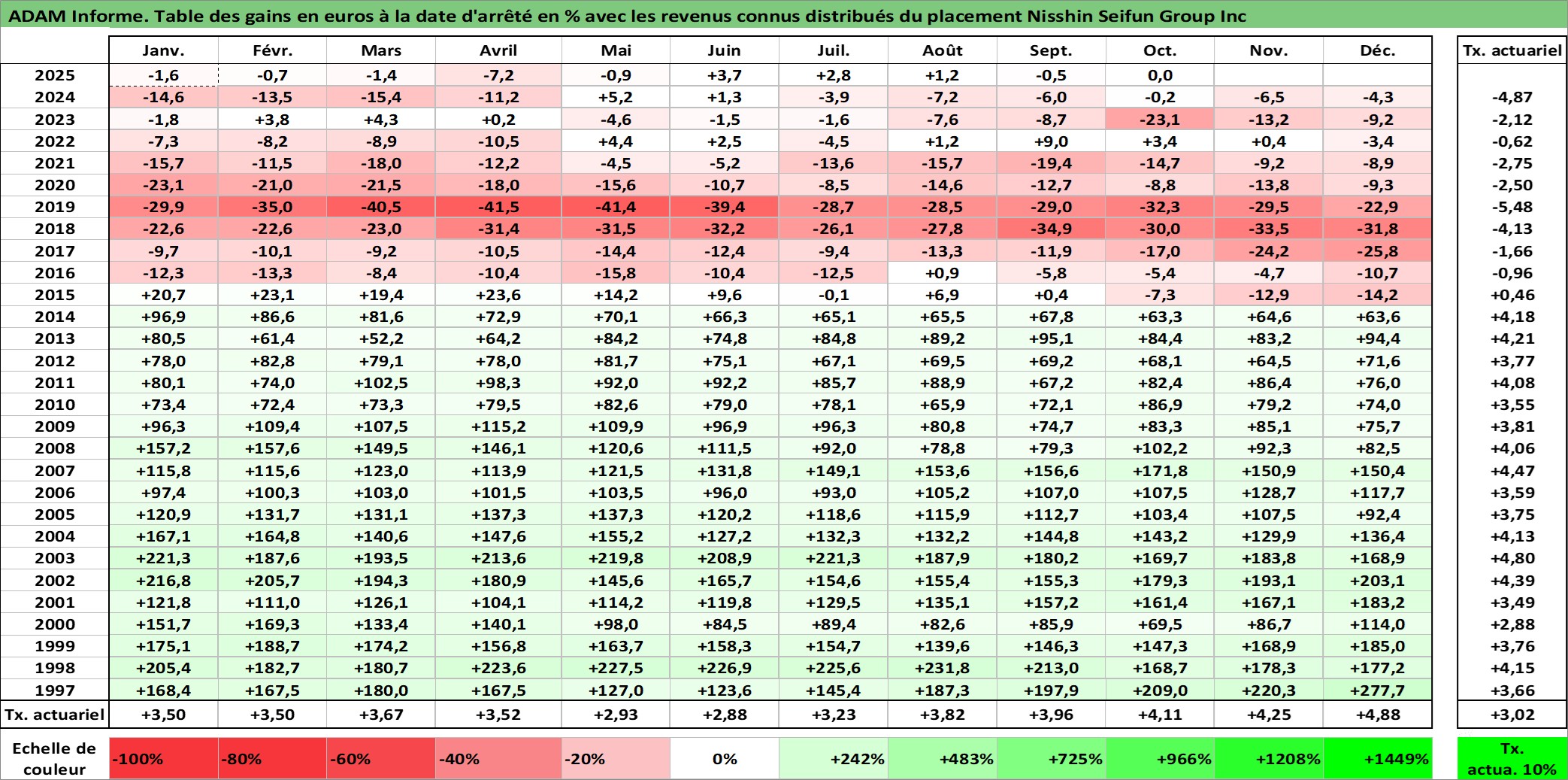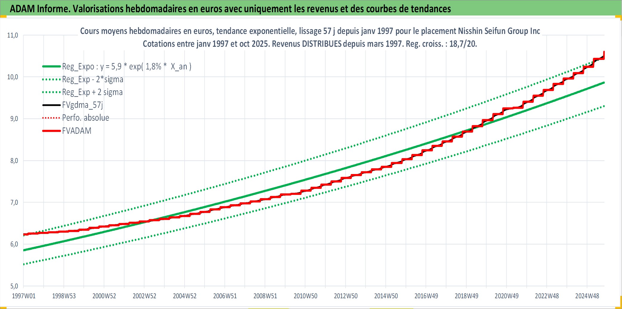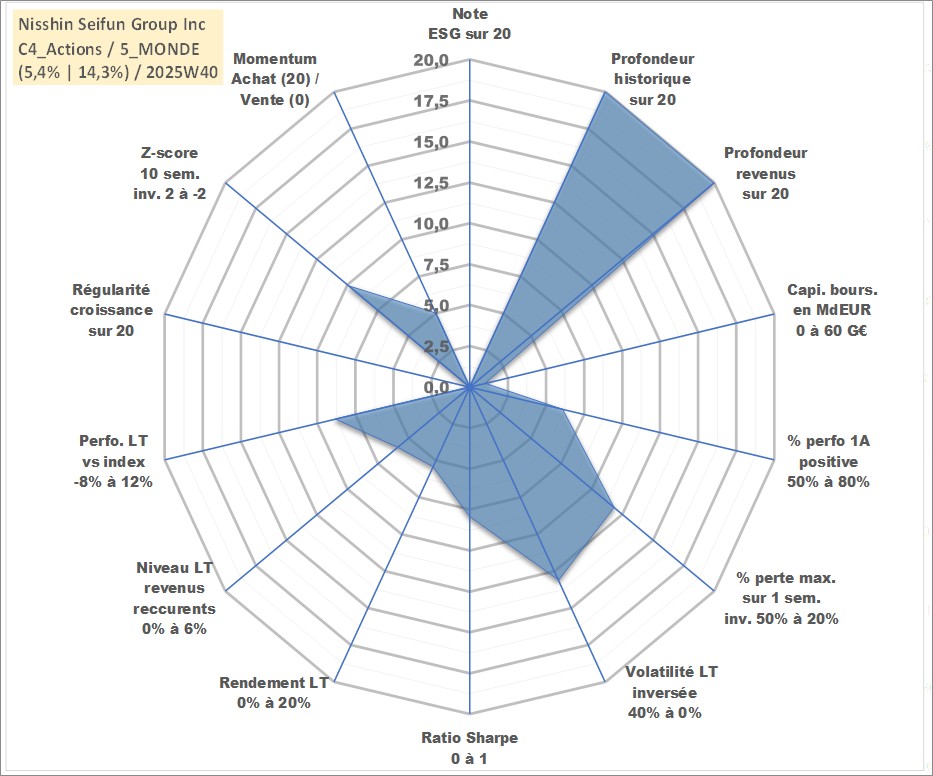 Site dédié aux investisseursPage dédiée sur site financeAnalyse des valorisations hebdomadaires de l'action Nisshin Seifun Group Inc. Cet actif est cote en JPY. Les valorisations sont en contrevaleur EURO et couvrent les semaines 1997W01 a 2025W40. Les revenus de cet actif financier sont pris en compte depuis la semaine 1997W13. La note ESG de cet actif n'est pas connue.
