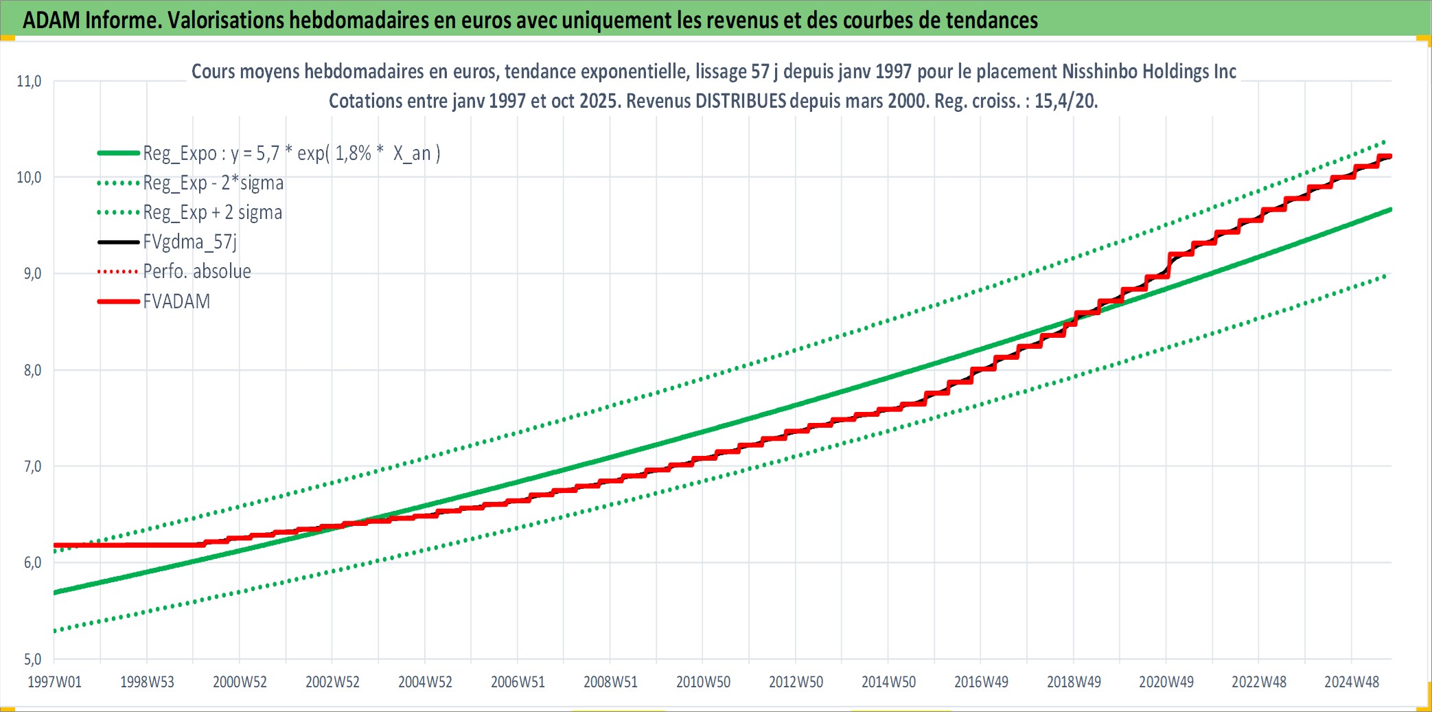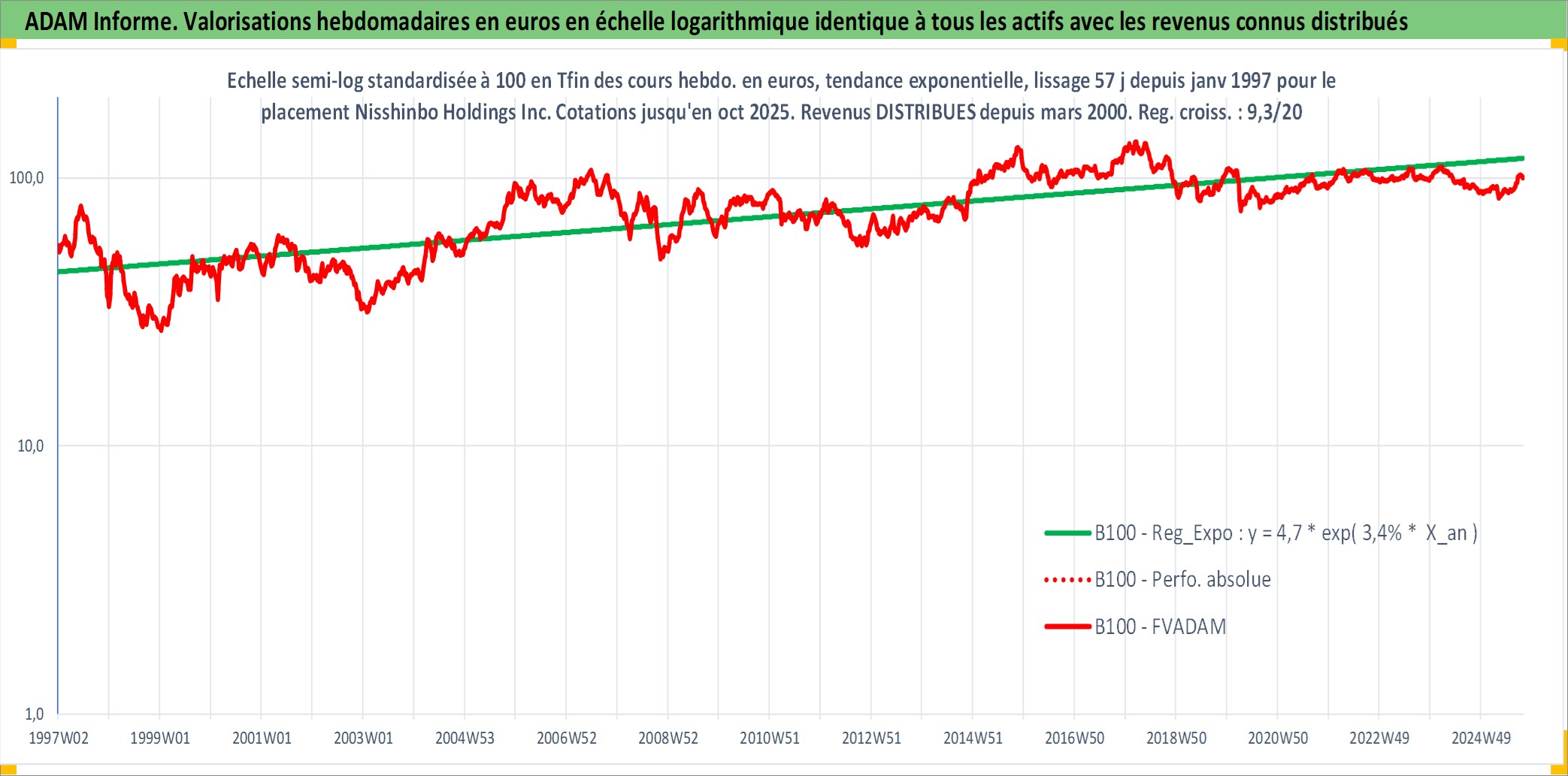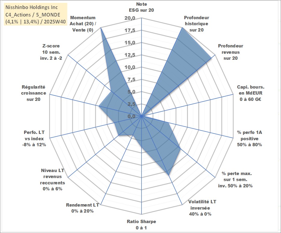 Site dédié aux investisseursPage dédiée sur site financeAnalyse des valorisations hebdomadaires de l'action Nisshinbo Holdings Inc. Cet actif est cote en JPY. Les valorisations sont en contrevaleur EURO et couvrent les semaines 1997W01 a 2025W40. Les revenus de cet actif financier sont pris en compte depuis la semaine 2000W13. La note ESG de cet actif n'est pas connue.
