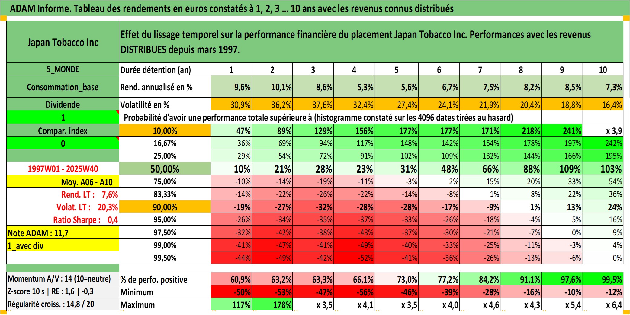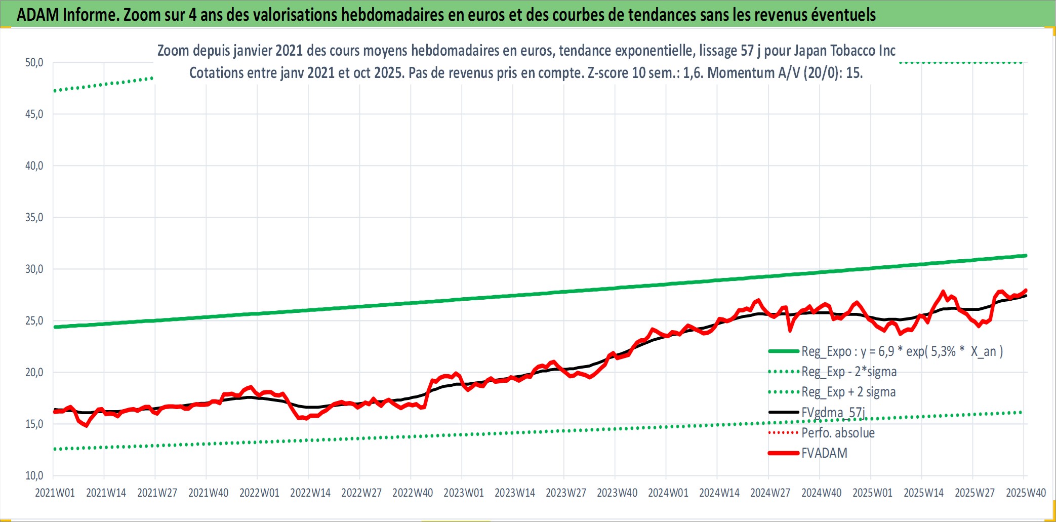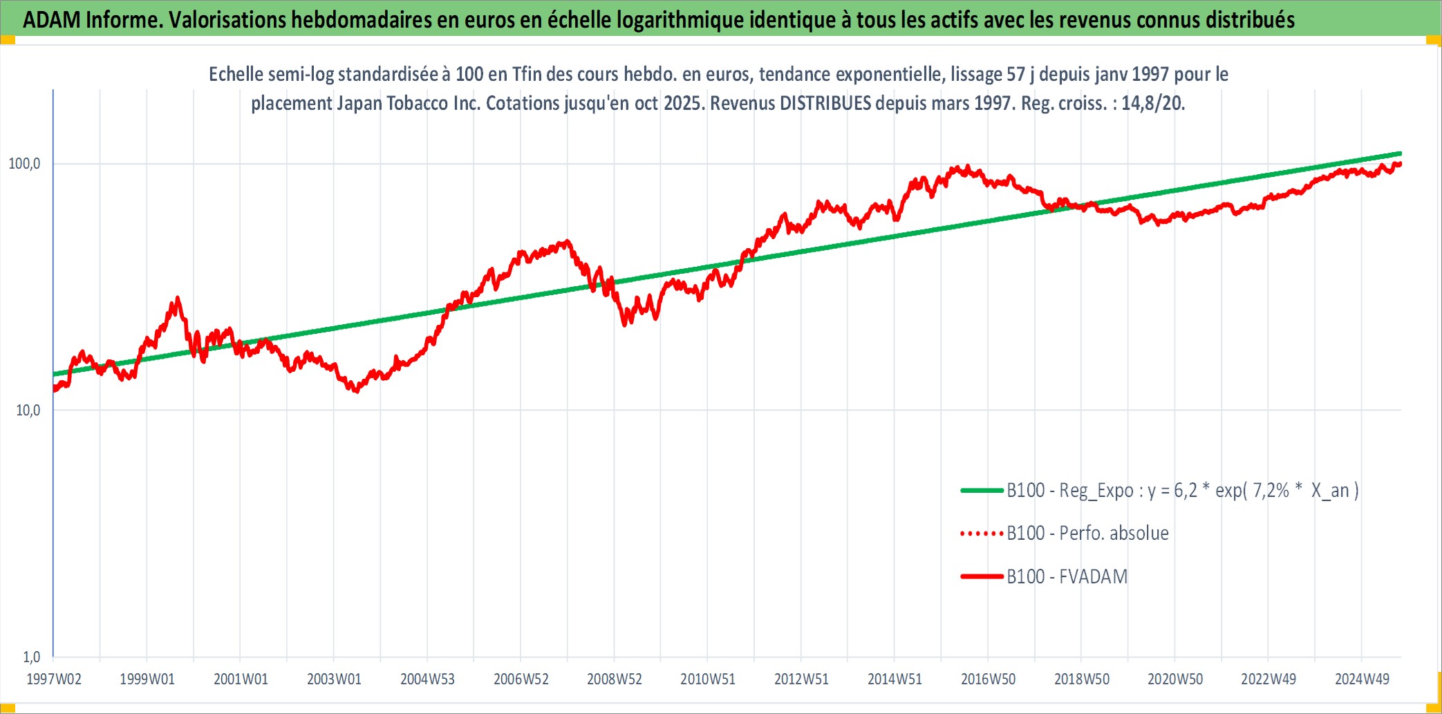 Site dédié aux investisseursPage dédiée sur site financeAnalyse des valorisations hebdomadaires de l'action Japan Tobacco Inc. Cet actif est cote en JPY. Les valorisations sont en contrevaleur EURO et couvrent les semaines 1997W01 a 2025W40. Les revenus de cet actif financier sont pris en compte depuis la semaine 1997W13. La note globale ESG de cet actif est estimee a 7.0 (apres rebasage entre 0 et 20).
