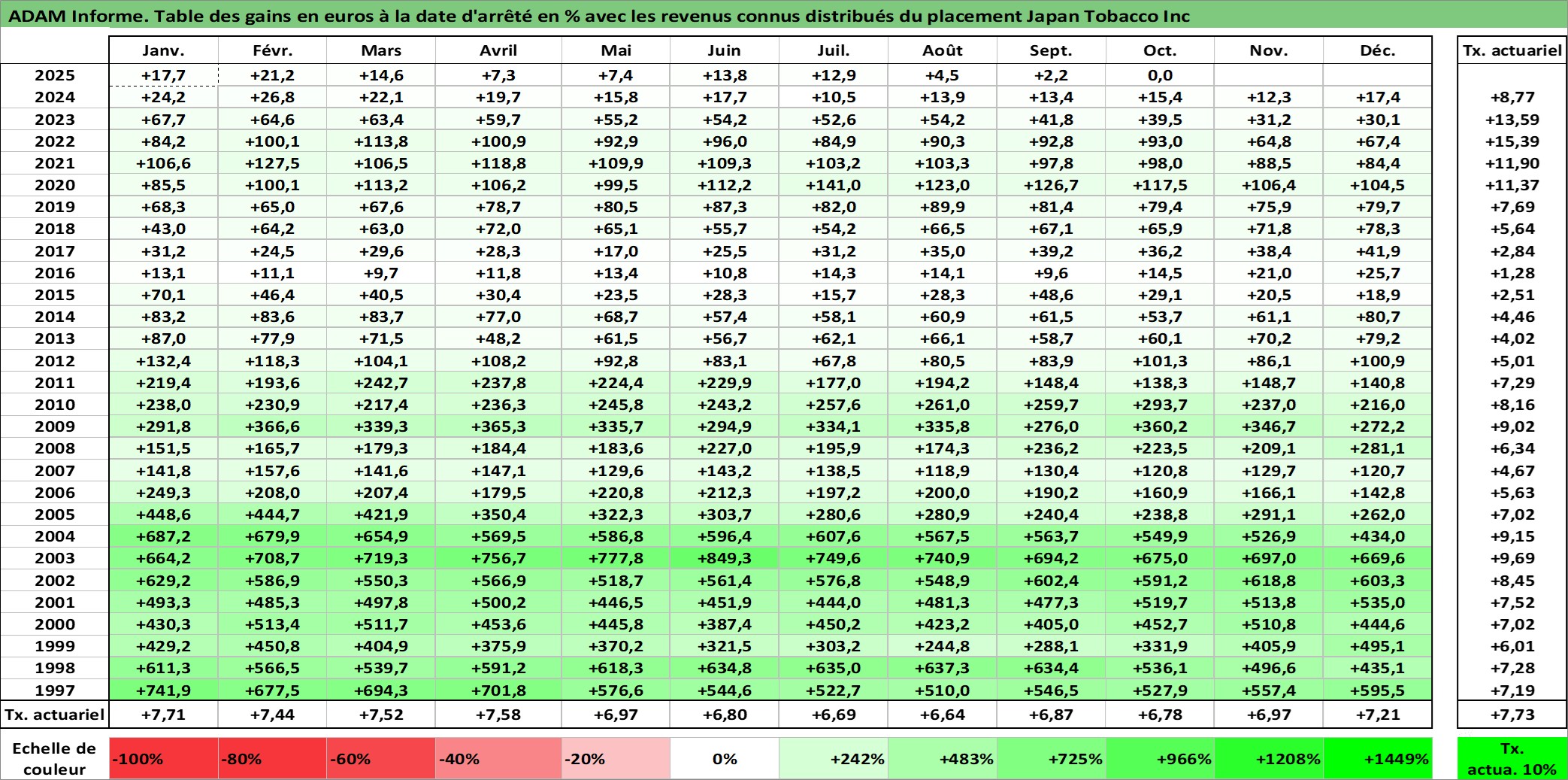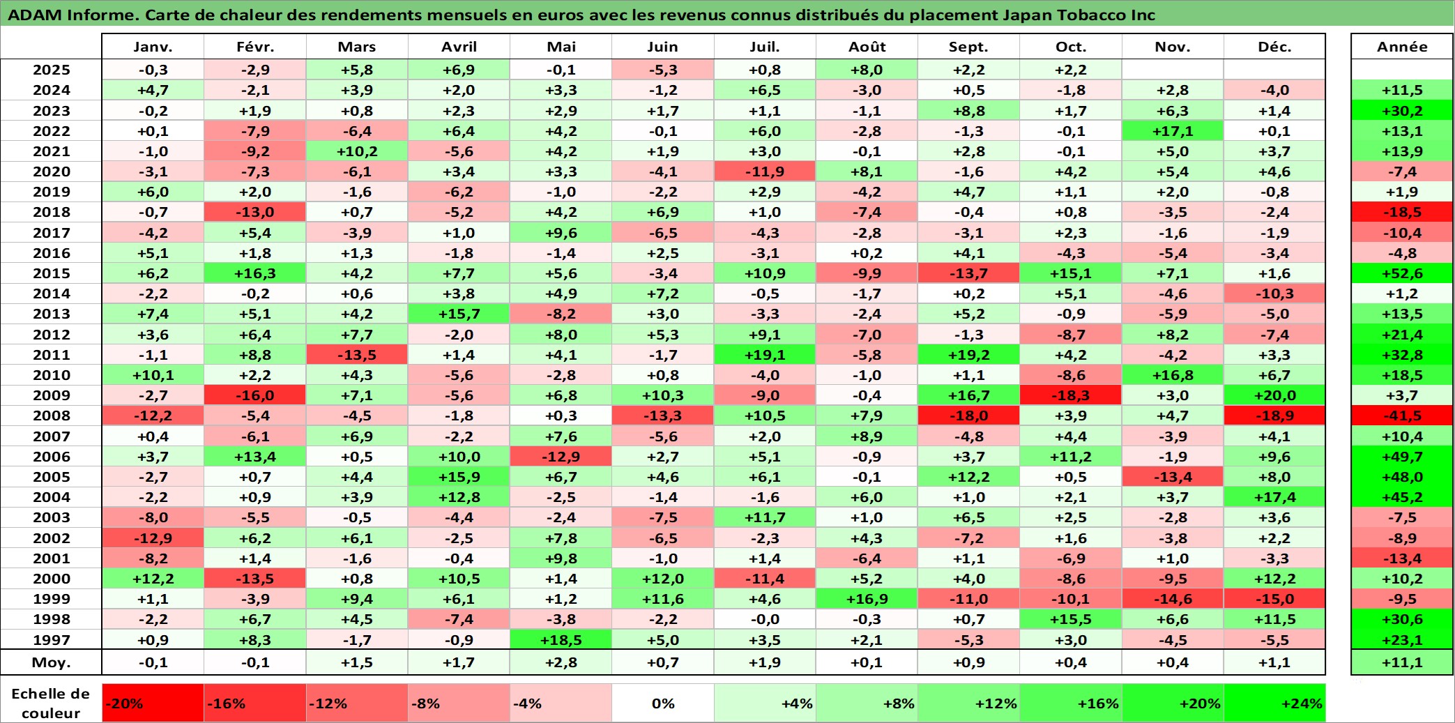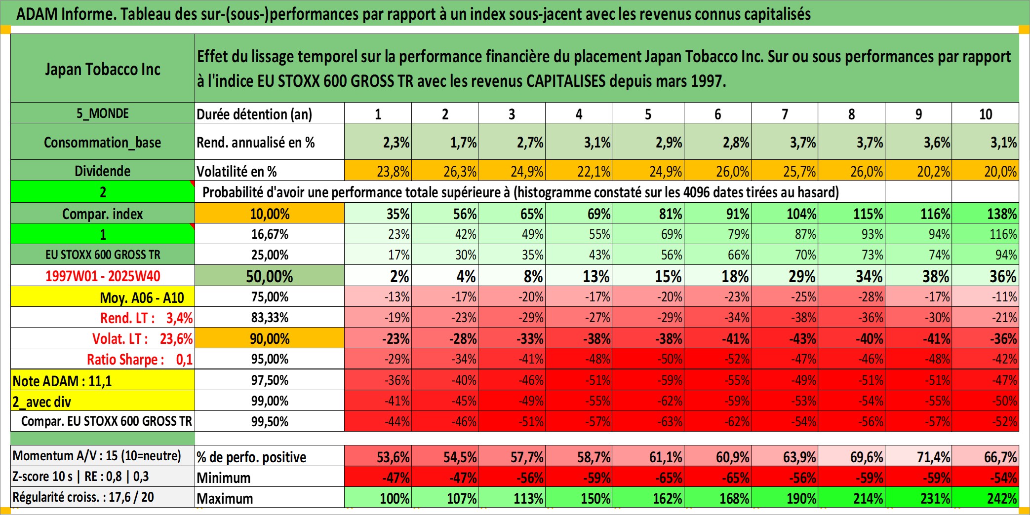 Site dédié aux investisseursPage dédiée sur site financeAnalyse des valorisations hebdomadaires de l'action Japan Tobacco Inc. Cet actif est cote en JPY. Les valorisations sont en contrevaleur EURO et couvrent les semaines 1997W01 a 2025W40. Les revenus de cet actif financier sont pris en compte depuis la semaine 1997W13. La note globale ESG de cet actif est estimee a 7.0 (apres rebasage entre 0 et 20).