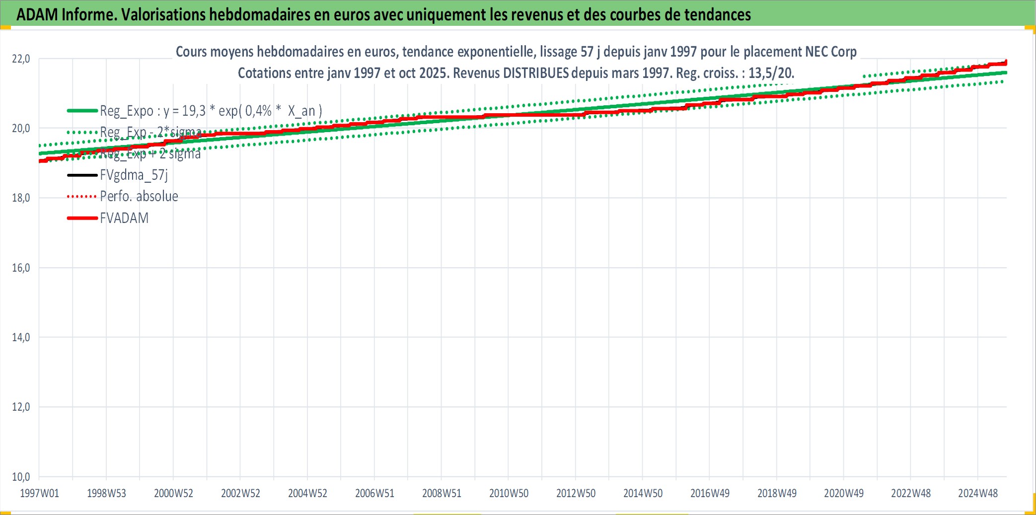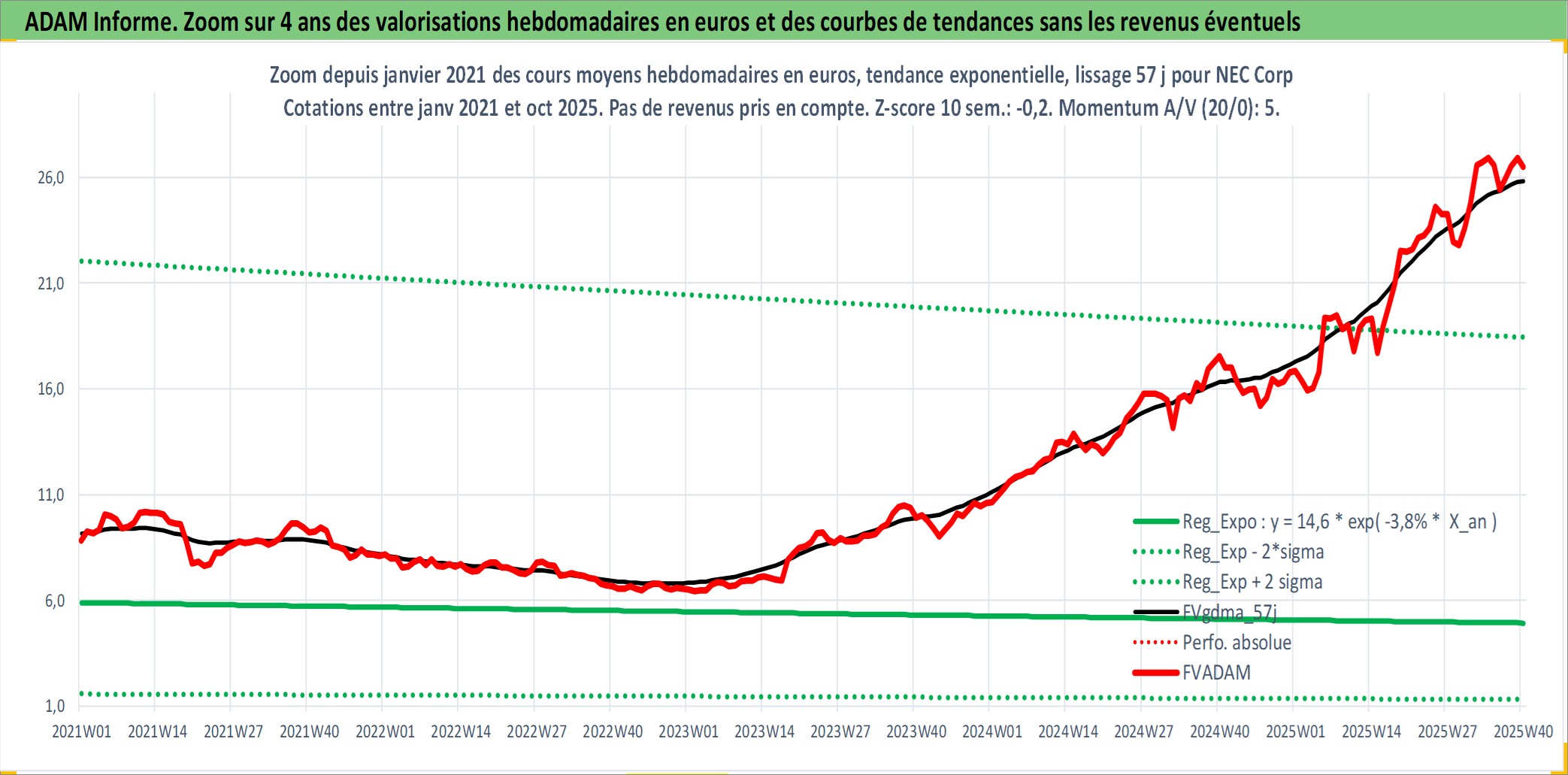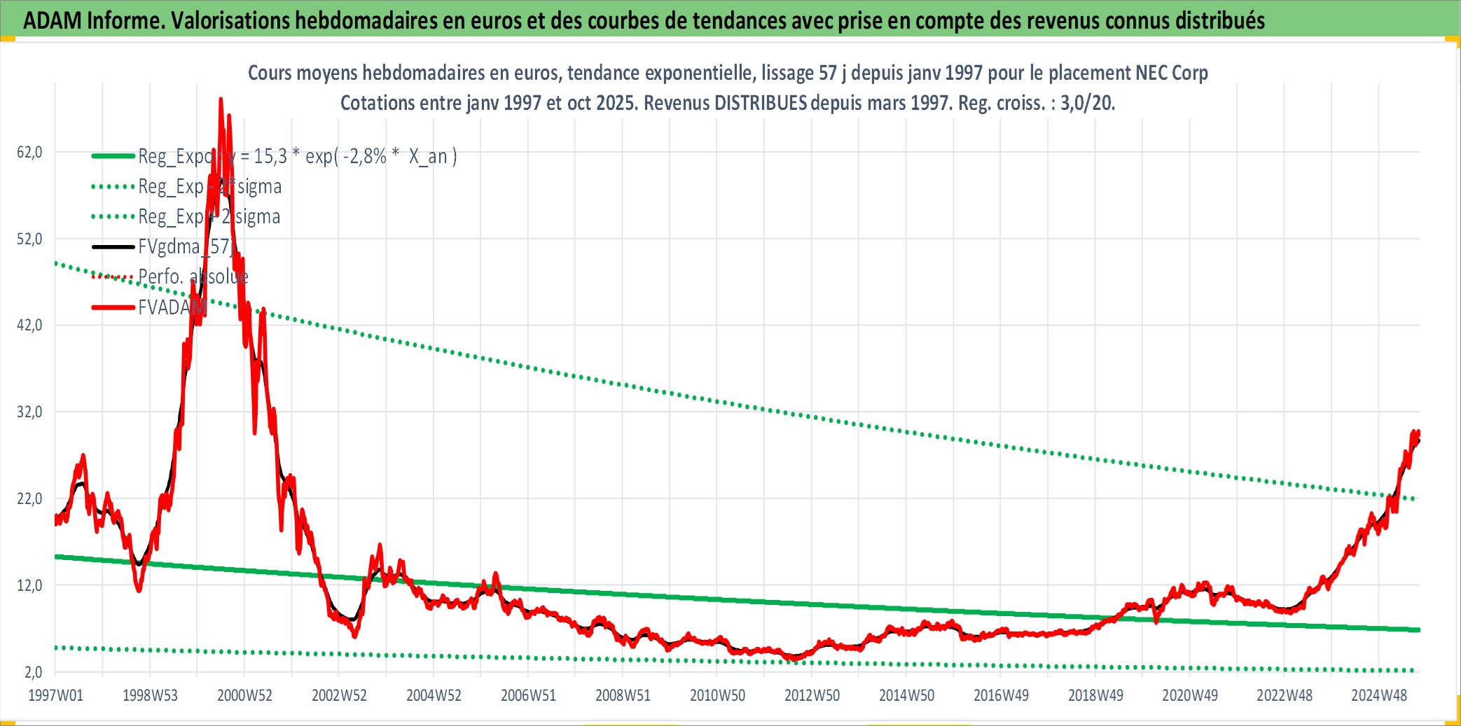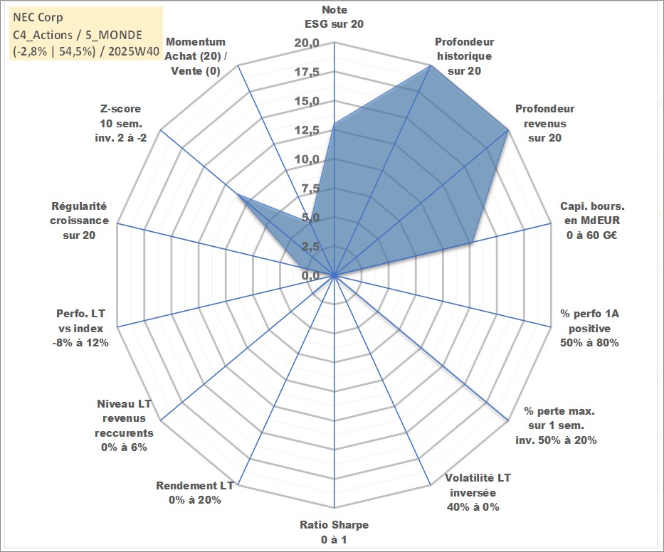Site dédié aux investisseursPage dédiée sur site financeAnalyse des valorisations hebdomadaires de l'action NEC Corp. Cet actif est cote en JPY. Les valorisations sont en contrevaleur EURO et couvrent les semaines 1997W01 a 2025W40. Les revenus de cet actif financier sont pris en compte depuis la semaine 1997W13. La note globale ESG de cet actif est estimee a 13.0 (apres rebasage entre 0 et 20).