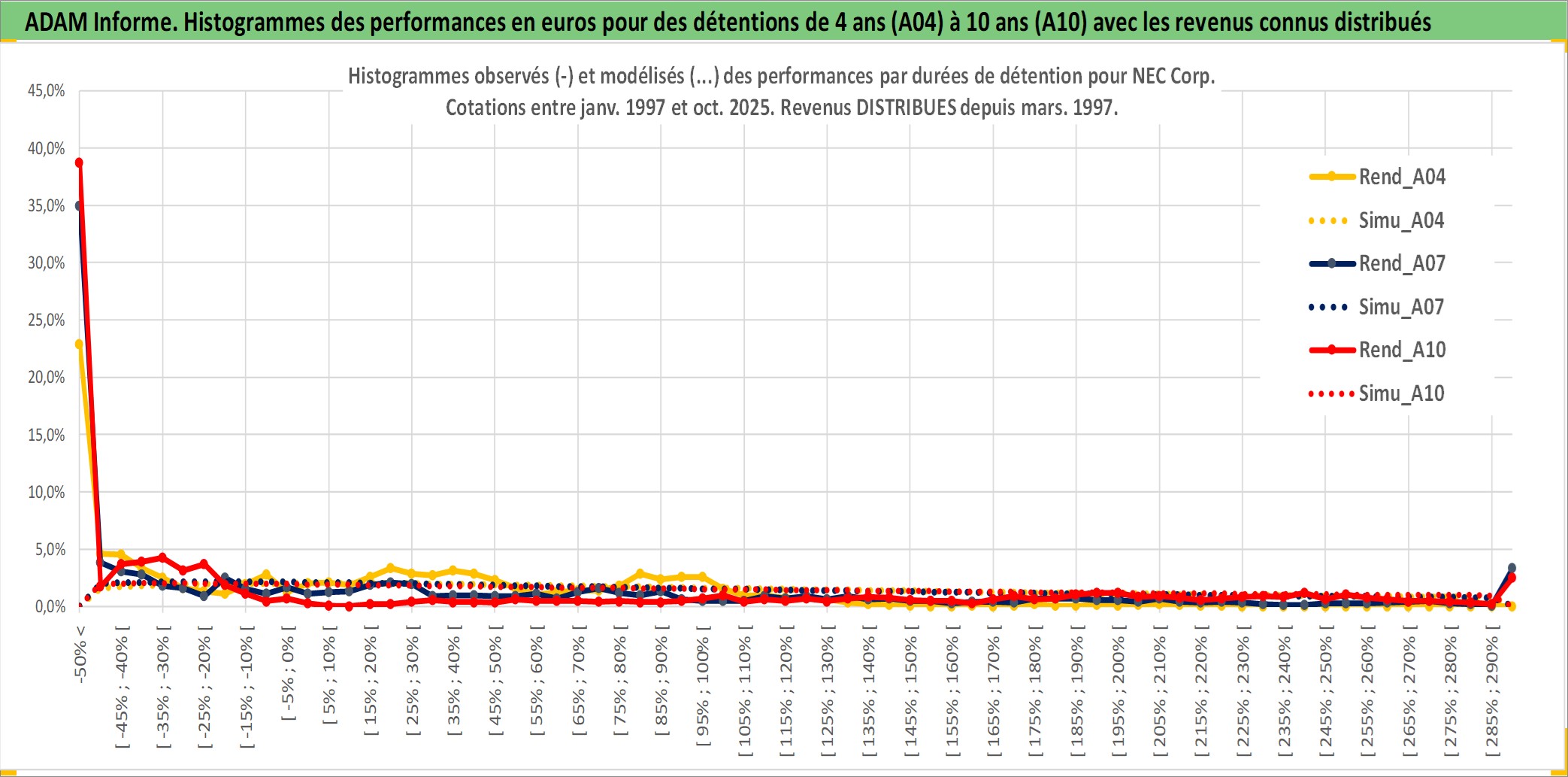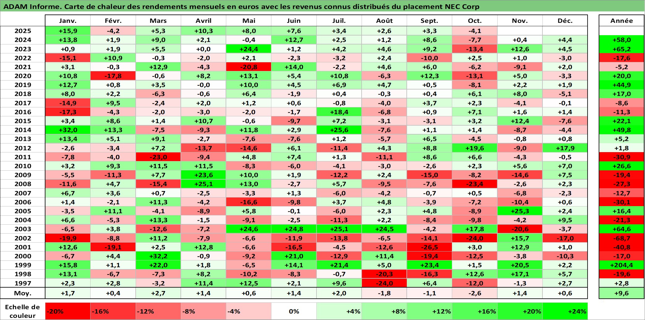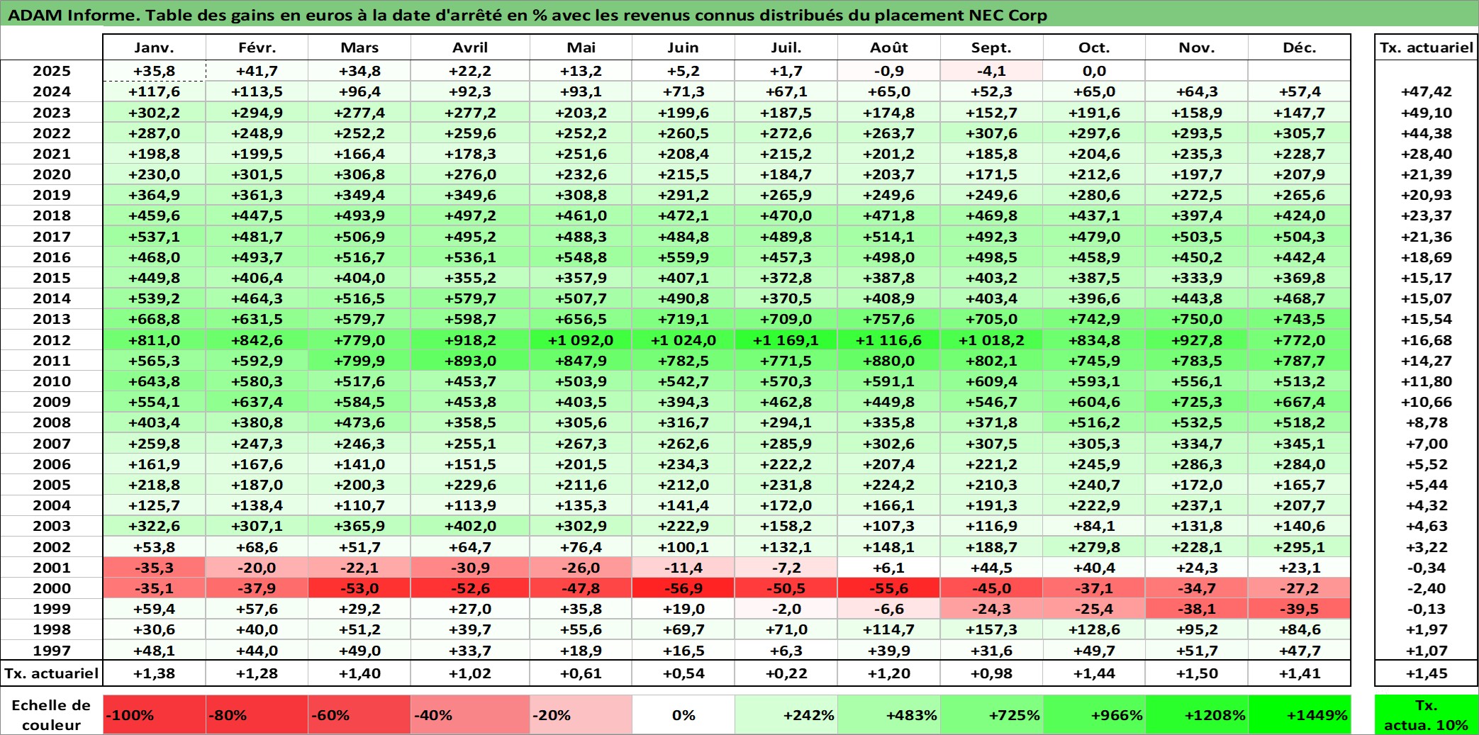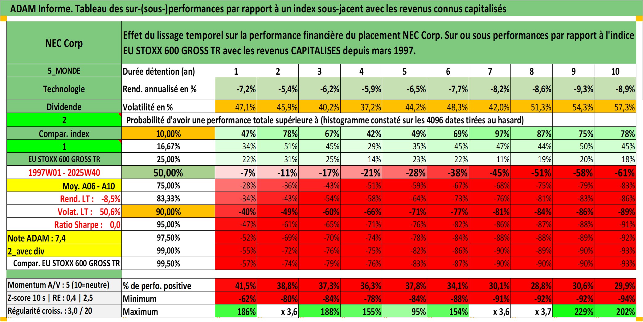 Site dédié aux investisseursPage dédiée sur site financeAnalyse des valorisations hebdomadaires de l'action NEC Corp. Cet actif est cote en JPY. Les valorisations sont en contrevaleur EURO et couvrent les semaines 1997W01 a 2025W40. Les revenus de cet actif financier sont pris en compte depuis la semaine 1997W13. La note globale ESG de cet actif est estimee a 13.0 (apres rebasage entre 0 et 20).
