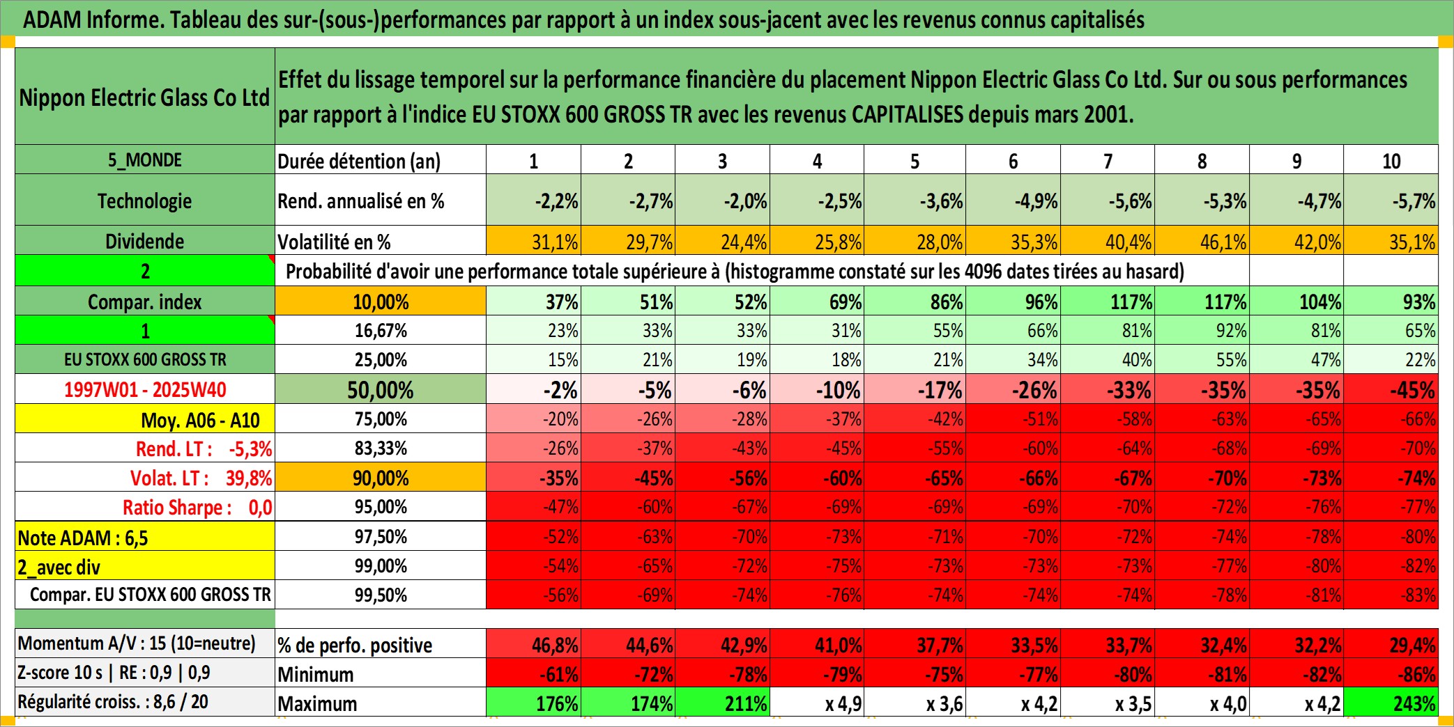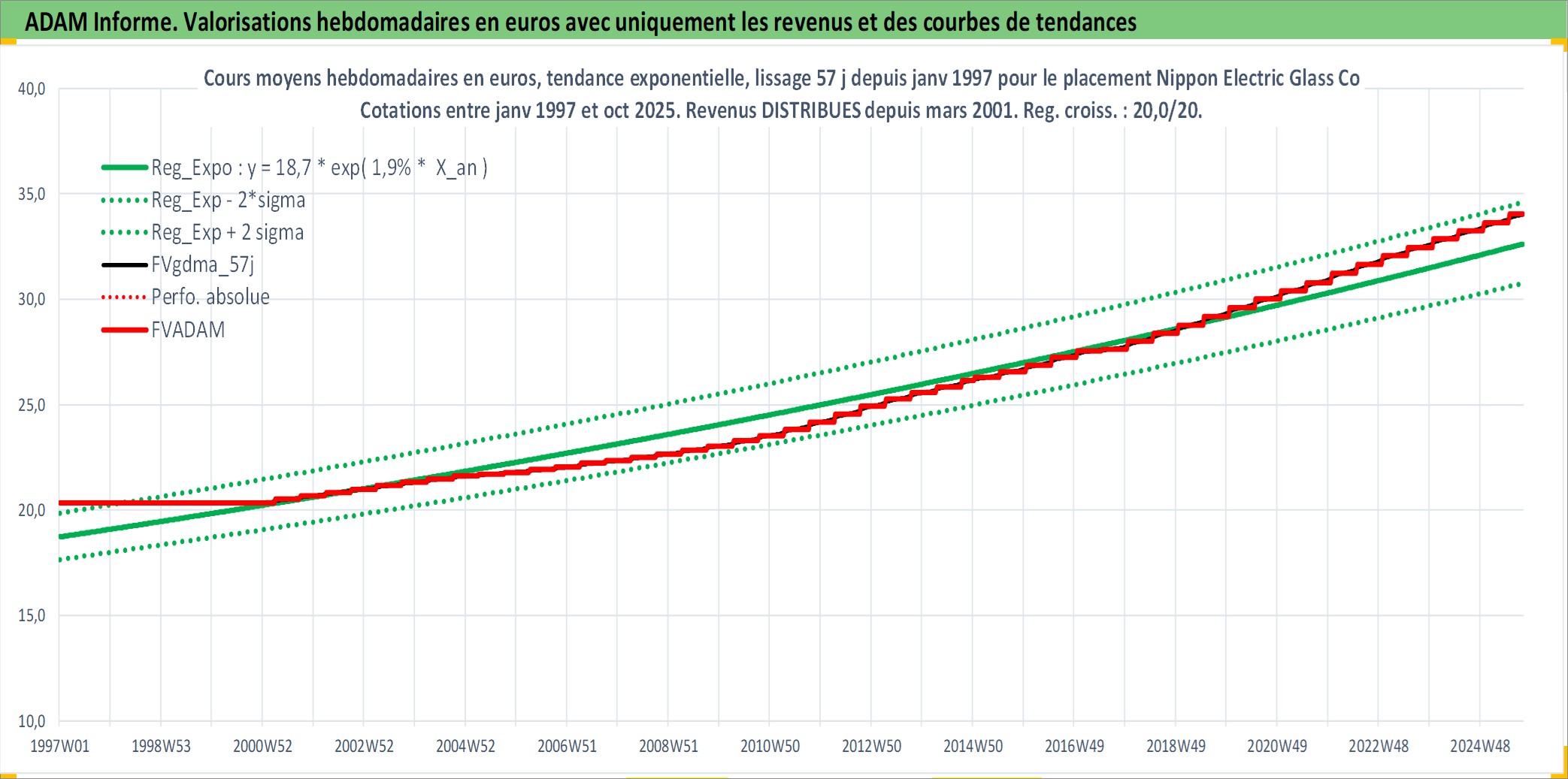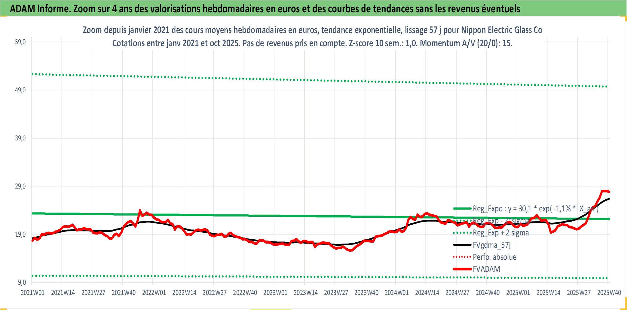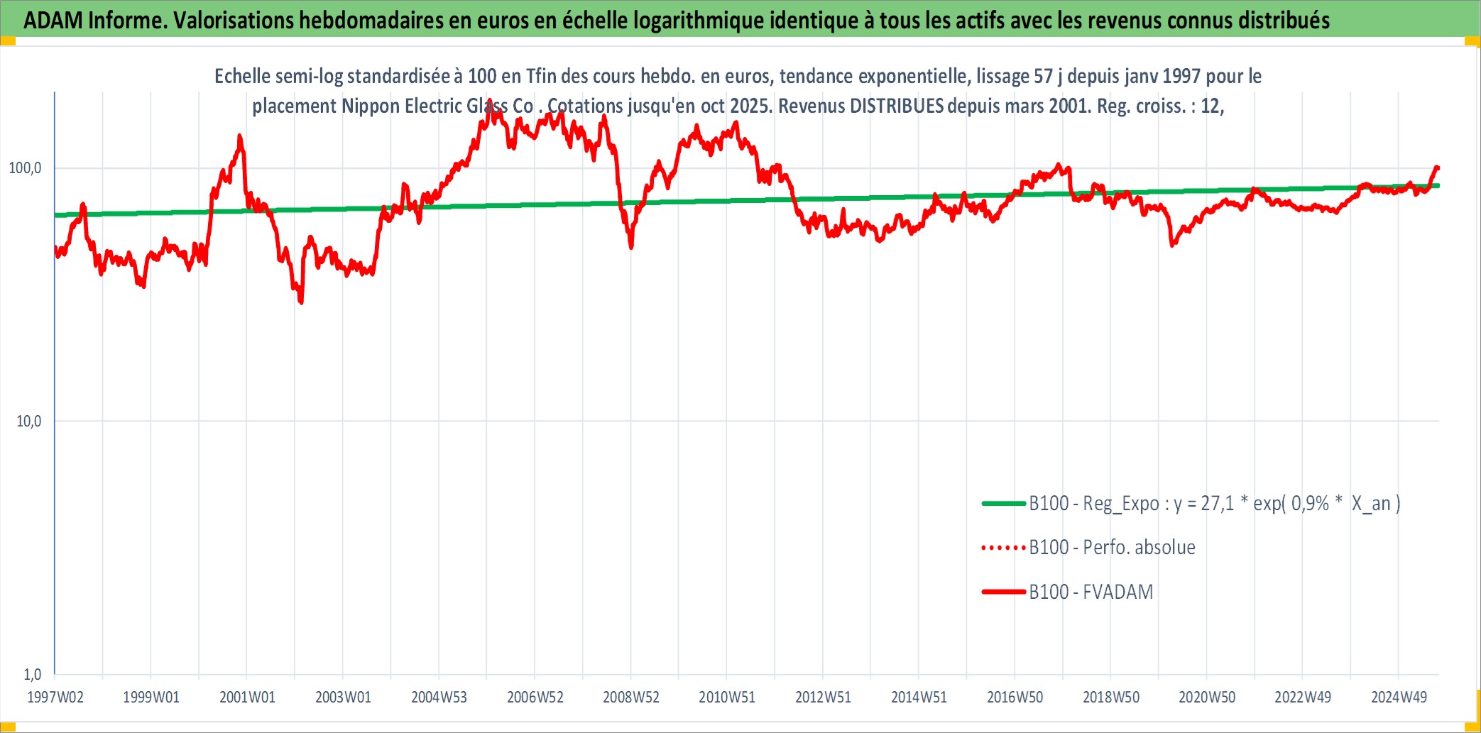 Site dédié aux investisseursPage dédiée sur site financeAnalyse des valorisations hebdomadaires de l'action Nippon Electric Glass Co Ltd. Cet actif est cote en JPY. Les valorisations sont en contrevaleur EURO et couvrent les semaines 1997W01 a 2025W40. Les revenus de cet actif financier sont pris en compte depuis la semaine 2001W13. La note ESG de cet actif n'est pas connue.