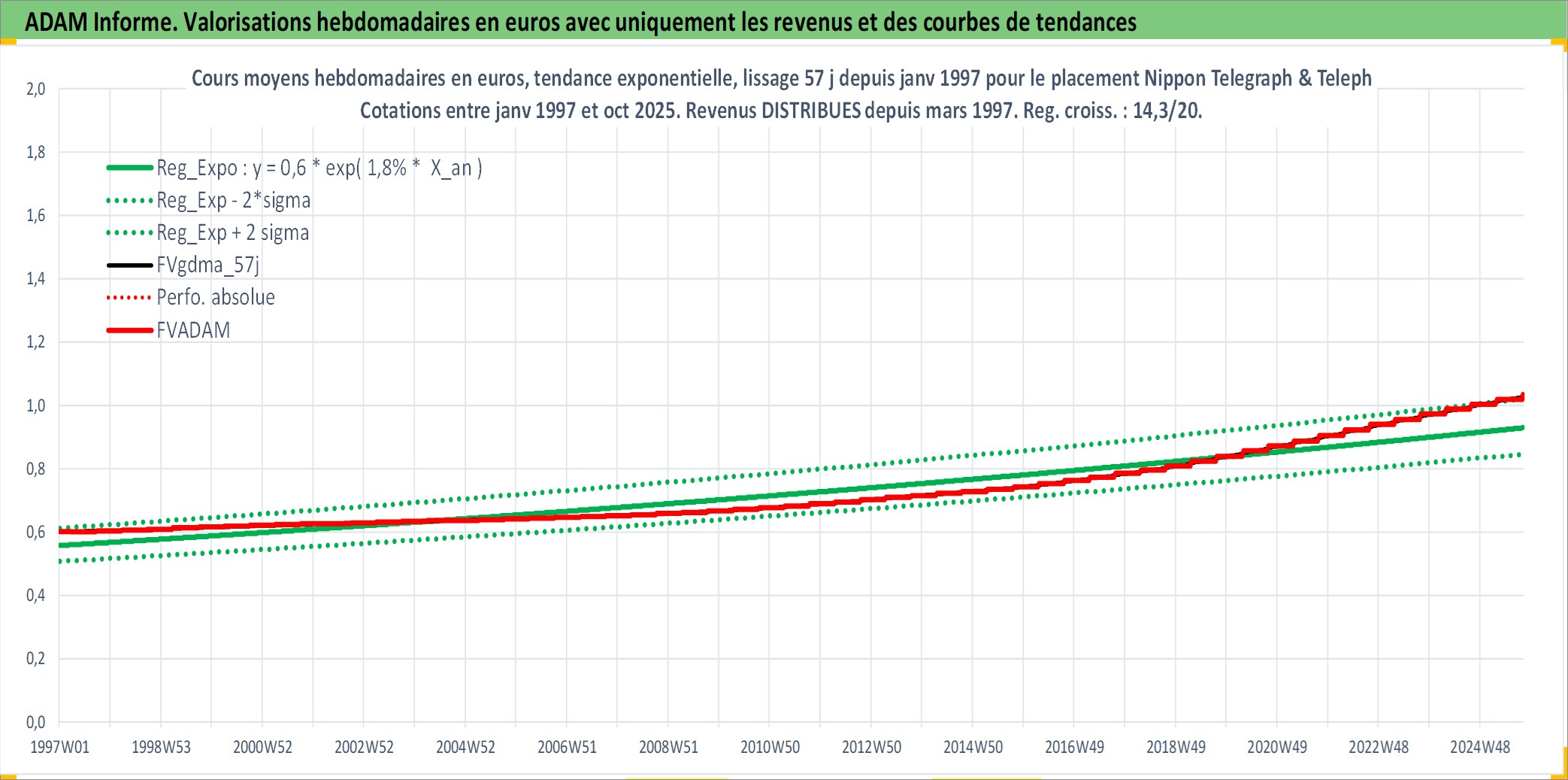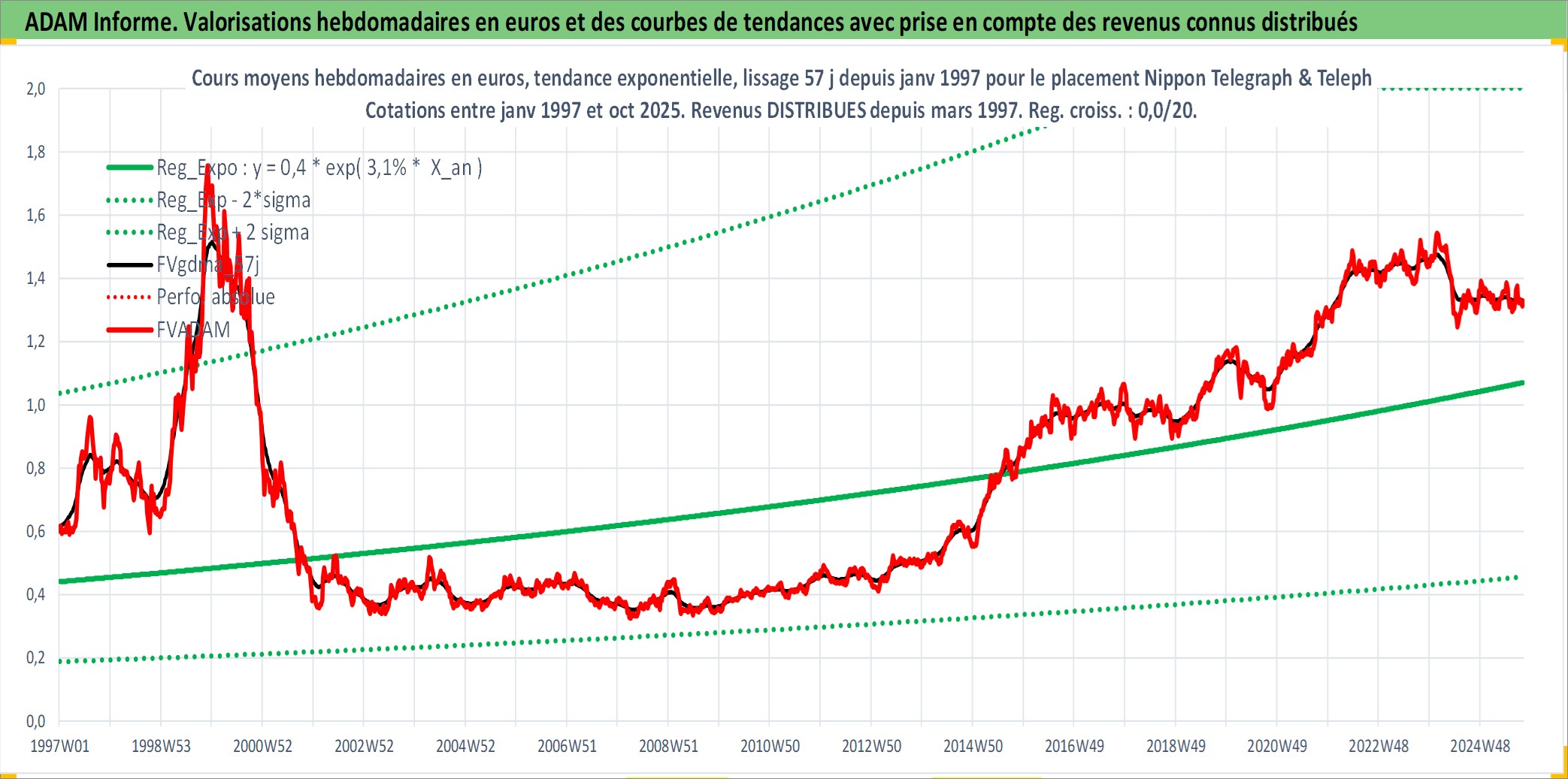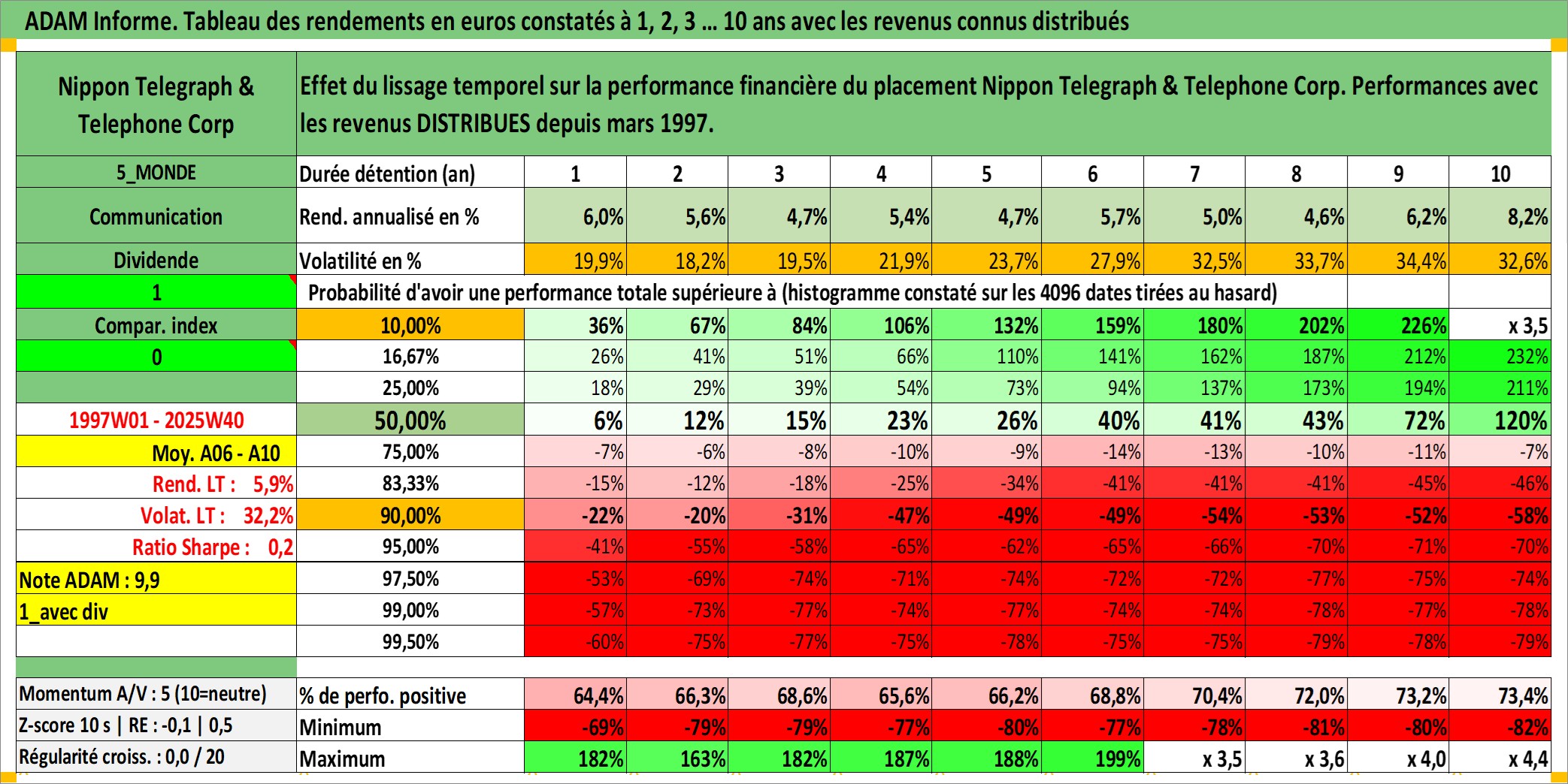 Site dédié aux investisseursPage dédiée sur site financeAnalyse des valorisations hebdomadaires de l'action Nippon Telegraph & Telephone Corp. Cet actif est cote en JPY. Les valorisations sont en contrevaleur EURO et couvrent les semaines 1997W01 a 2025W40. Les revenus de cet actif financier sont pris en compte depuis la semaine 1997W13. La note globale ESG de cet actif est estimee a 9.0 (apres rebasage entre 0 et 20).