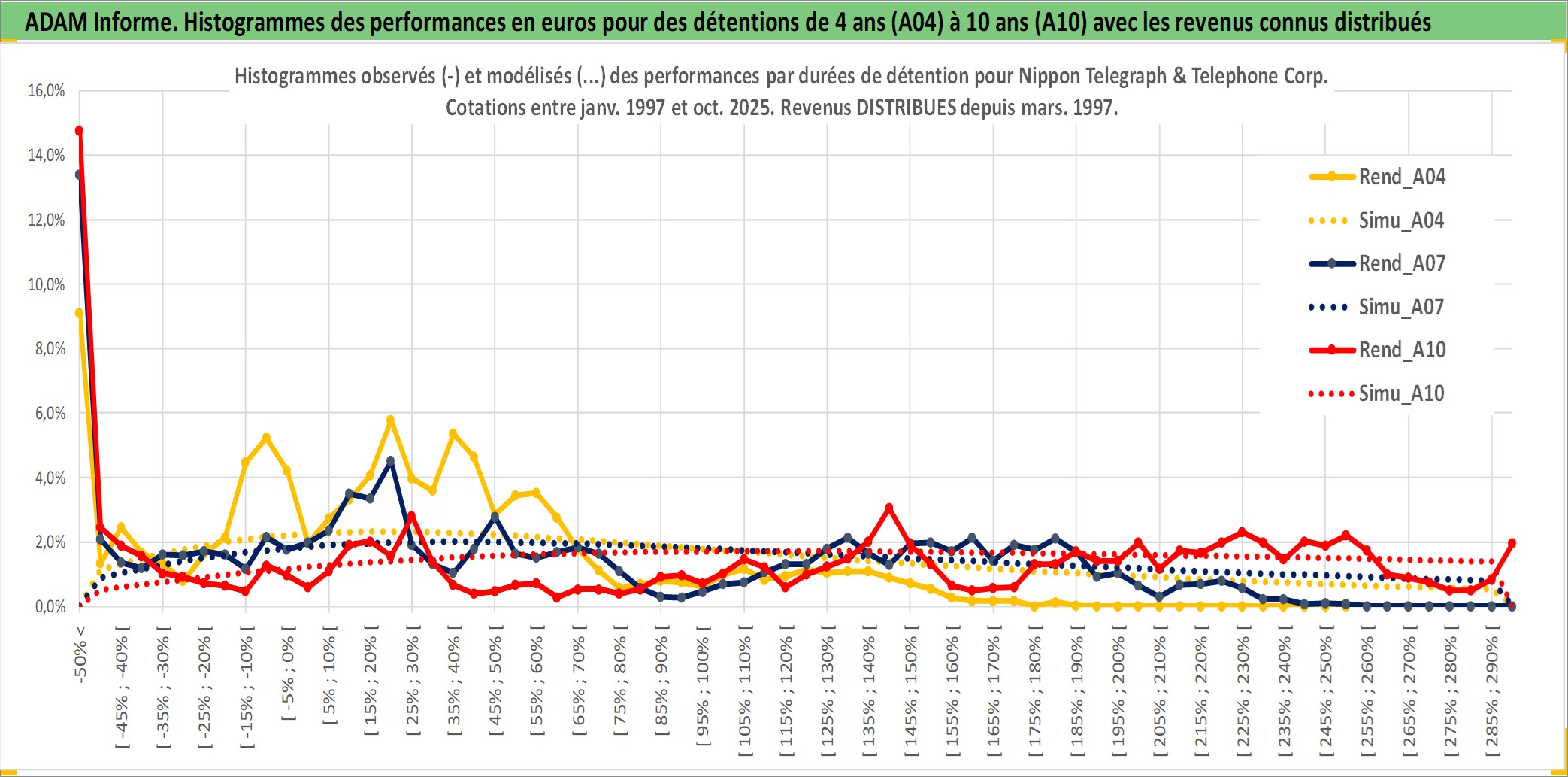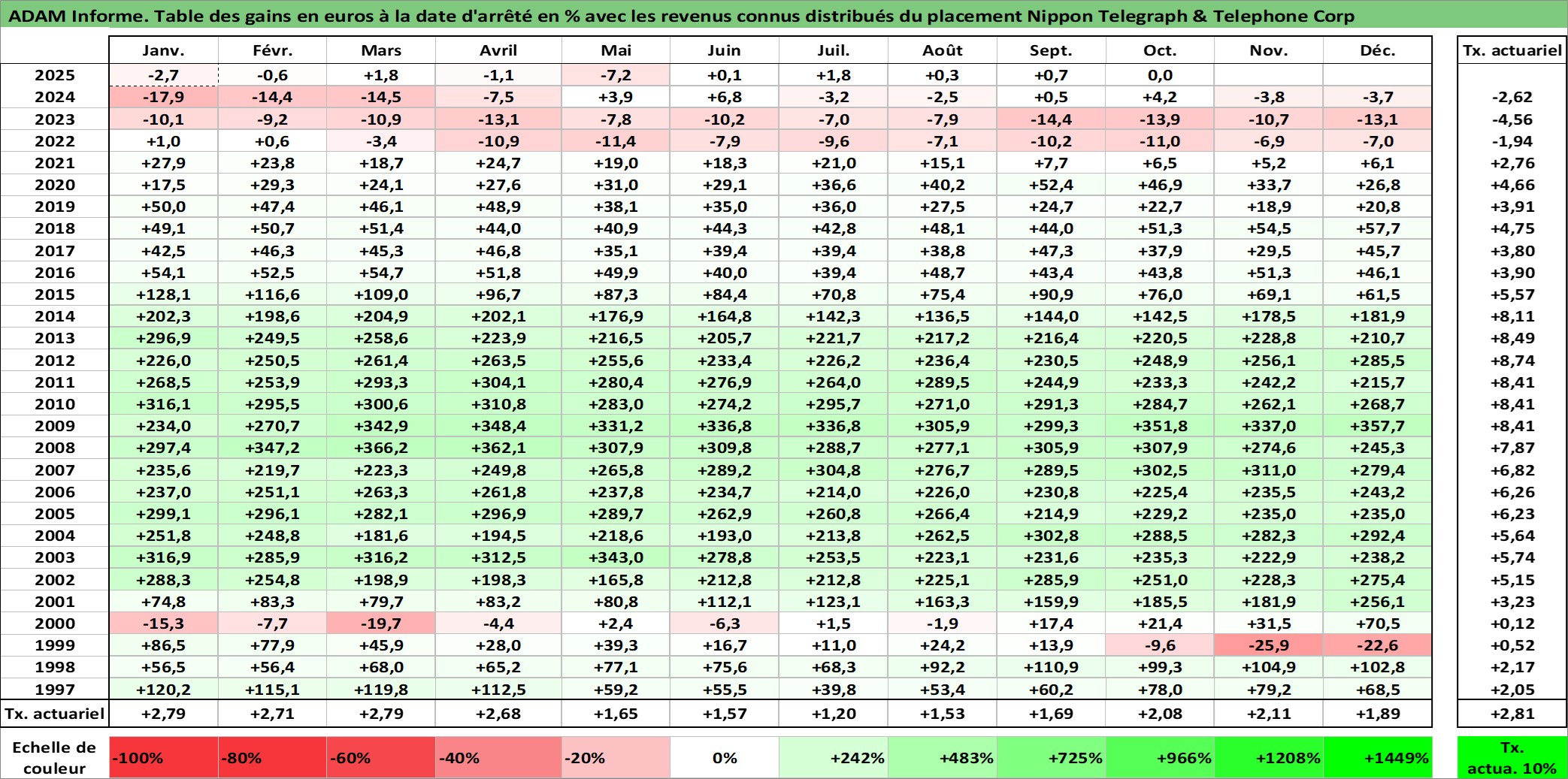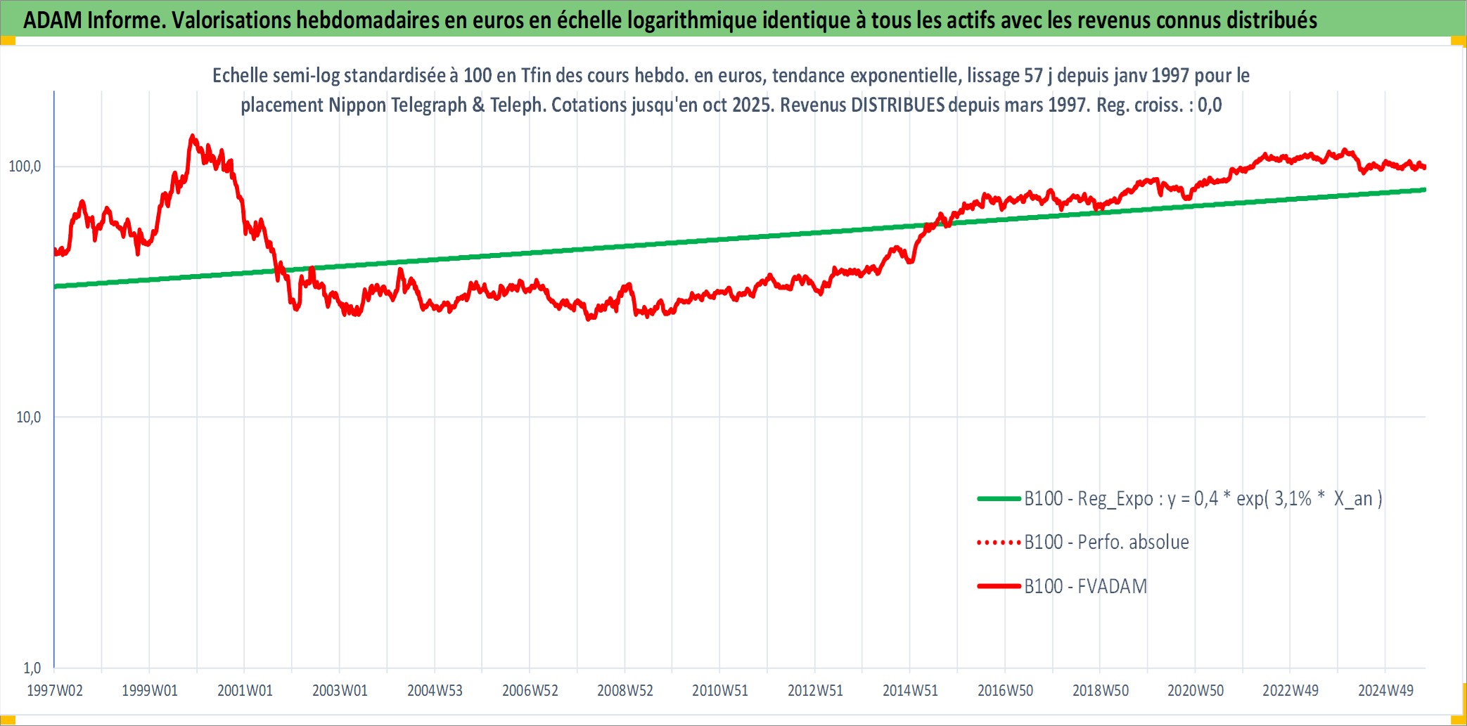 Site dédié aux investisseursPage dédiée sur site financeAnalyse des valorisations hebdomadaires de l'action Nippon Telegraph & Telephone Corp. Cet actif est cote en JPY. Les valorisations sont en contrevaleur EURO et couvrent les semaines 1997W01 a 2025W40. Les revenus de cet actif financier sont pris en compte depuis la semaine 1997W13. La note globale ESG de cet actif est estimee a 9.0 (apres rebasage entre 0 et 20).