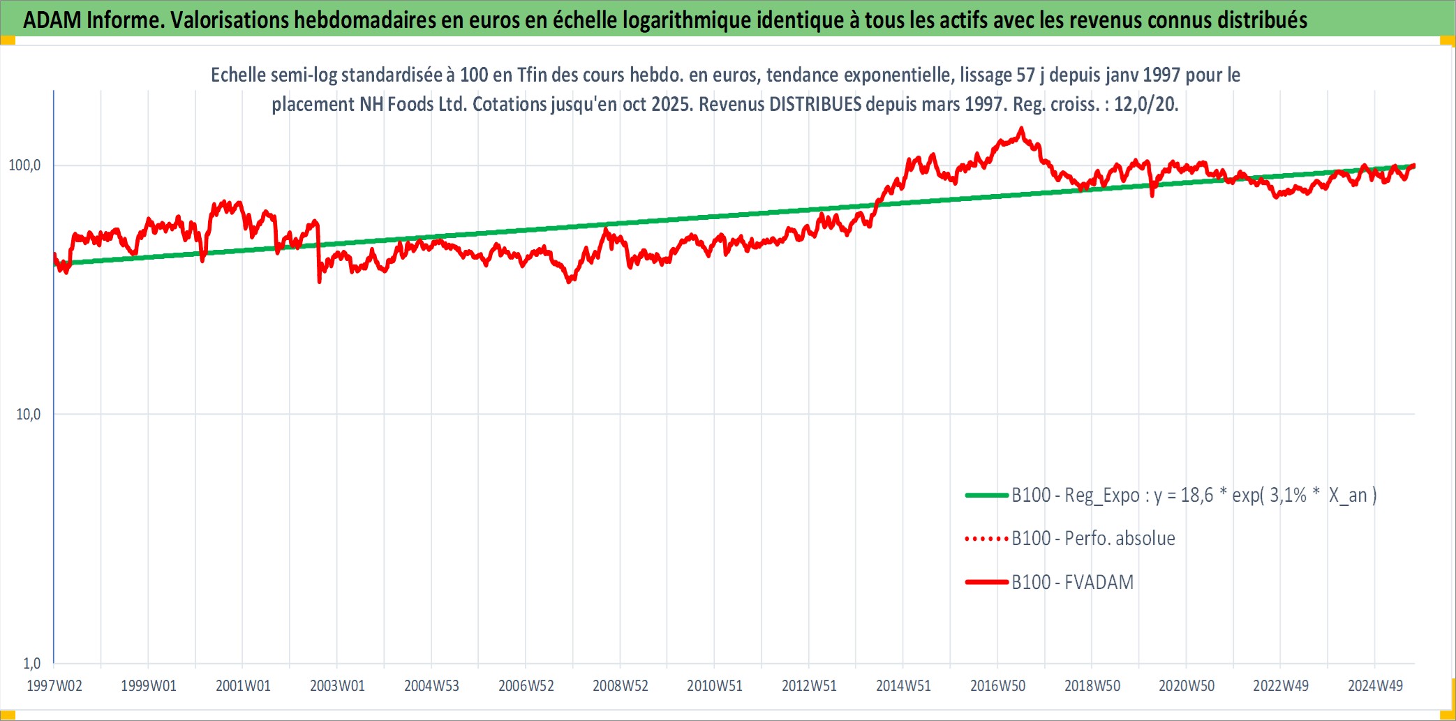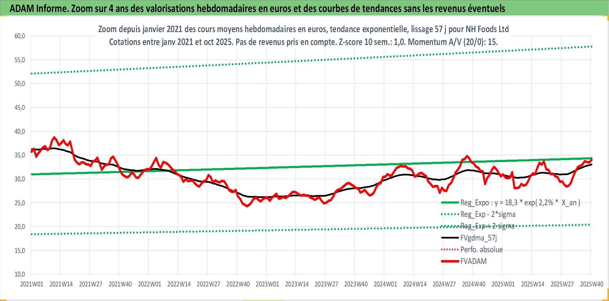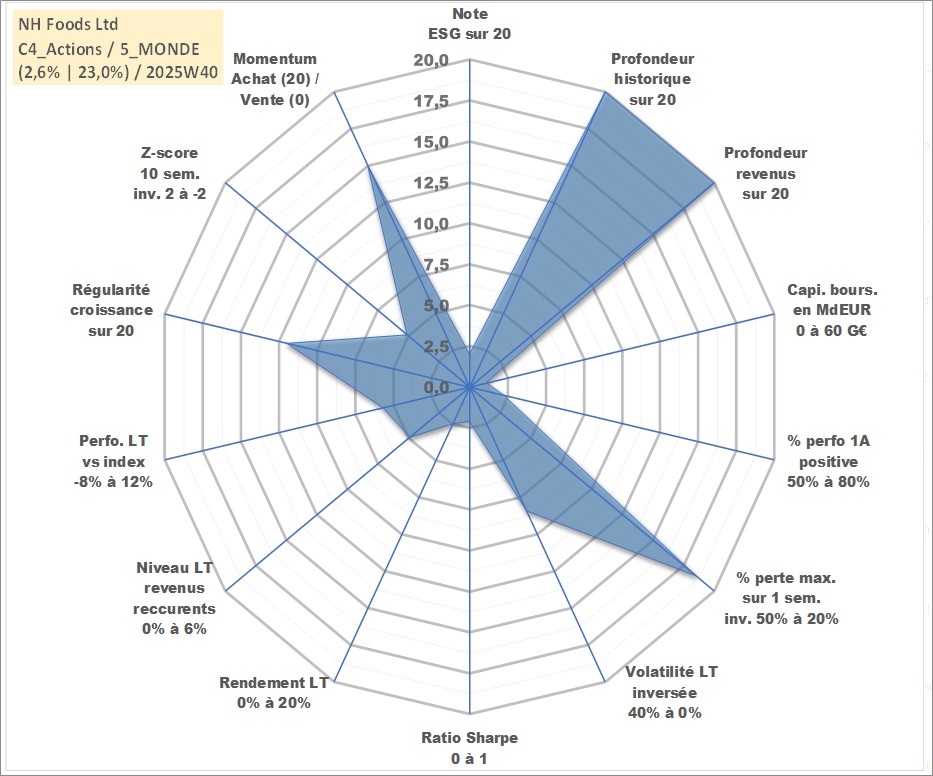 Site dédié aux investisseursPage dédiée sur site financeAnalyse des valorisations hebdomadaires de l'action NH Foods Ltd. Cet actif est cote en JPY. Les valorisations sont en contrevaleur EURO et couvrent les semaines 1997W01 a 2025W40. Les revenus de cet actif financier sont pris en compte depuis la semaine 1997W13. La note globale ESG de cet actif est estimee a 2.0 (apres rebasage entre 0 et 20).