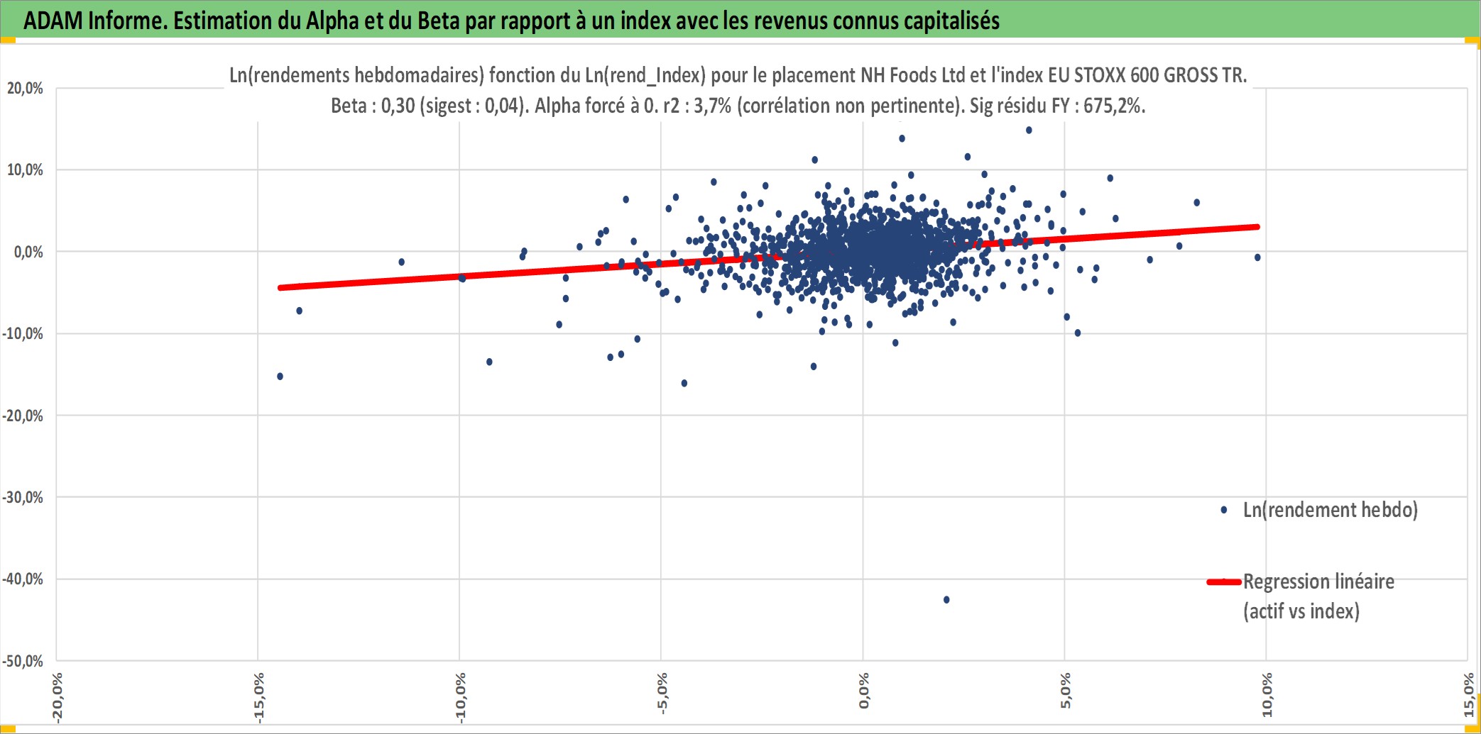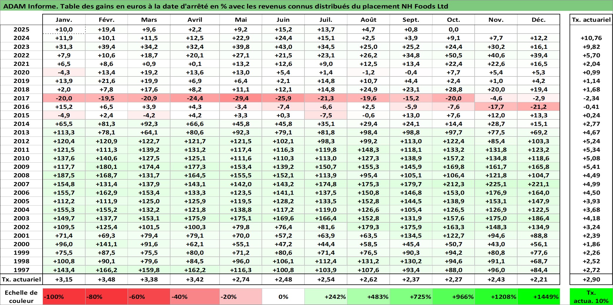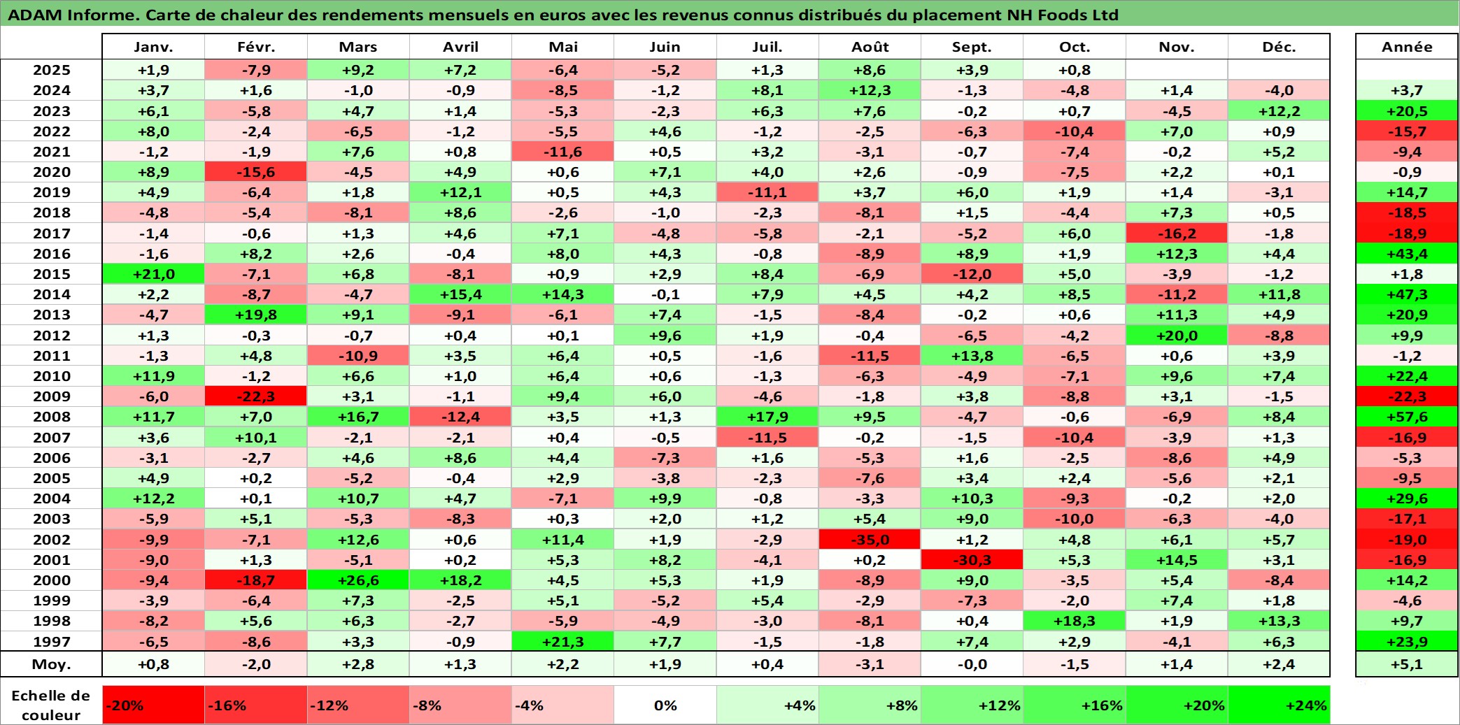 Site dédié aux investisseursPage dédiée sur site financeAnalyse des valorisations hebdomadaires de l'action NH Foods Ltd. Cet actif est cote en JPY. Les valorisations sont en contrevaleur EURO et couvrent les semaines 1997W01 a 2025W40. Les revenus de cet actif financier sont pris en compte depuis la semaine 1997W13. La note globale ESG de cet actif est estimee a 2.0 (apres rebasage entre 0 et 20).