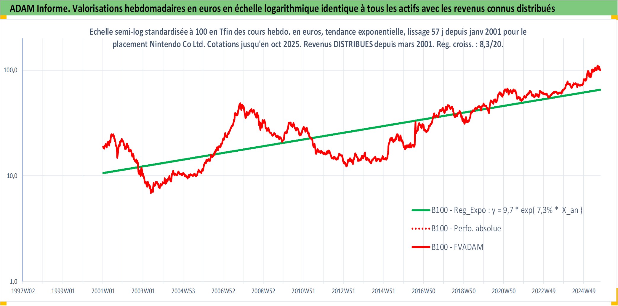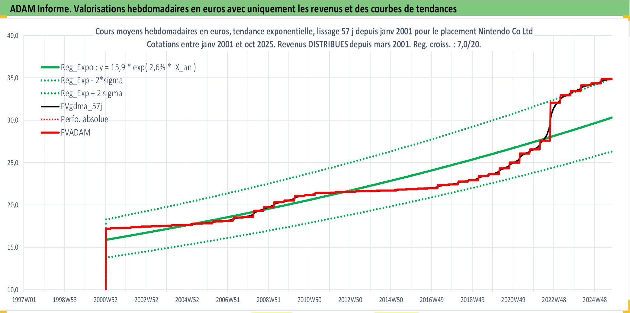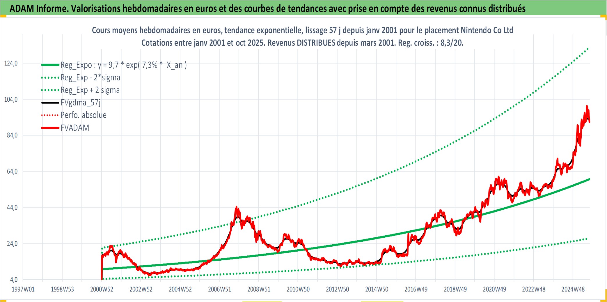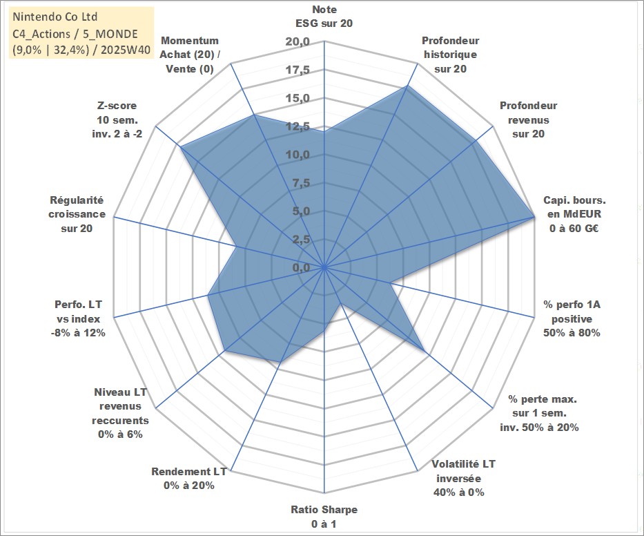 Site dédié aux investisseursPage dédiée sur site financeAnalyse des valorisations hebdomadaires de l'action Nintendo Co Ltd. Cet actif est cote en JPY. Les valorisations sont en contrevaleur EURO et couvrent les semaines 2001W01 a 2025W40. Les revenus de cet actif financier sont pris en compte depuis la semaine 2001W13. La note globale ESG de cet actif est estimee a 12.0 (apres rebasage entre 0 et 20).