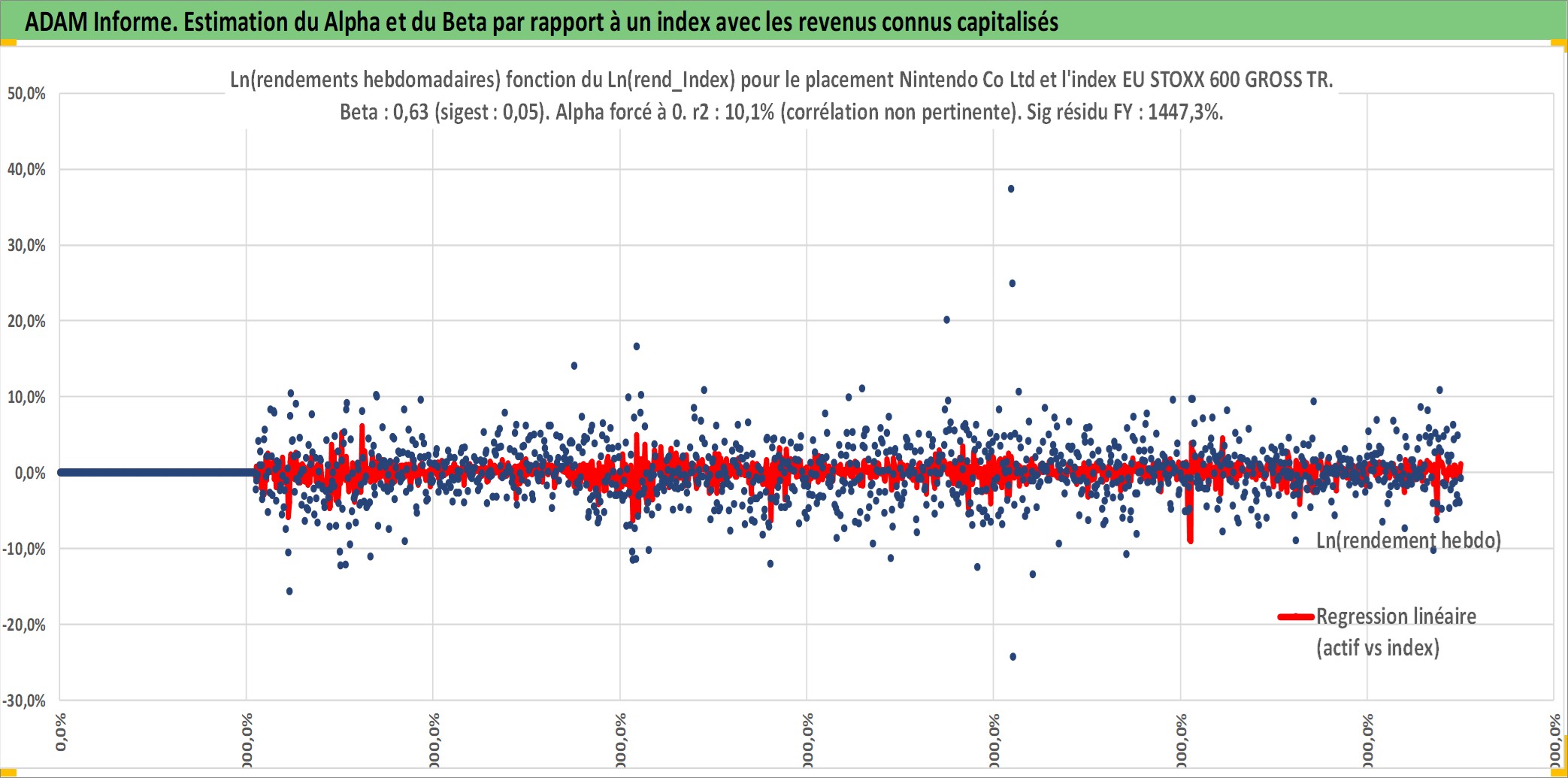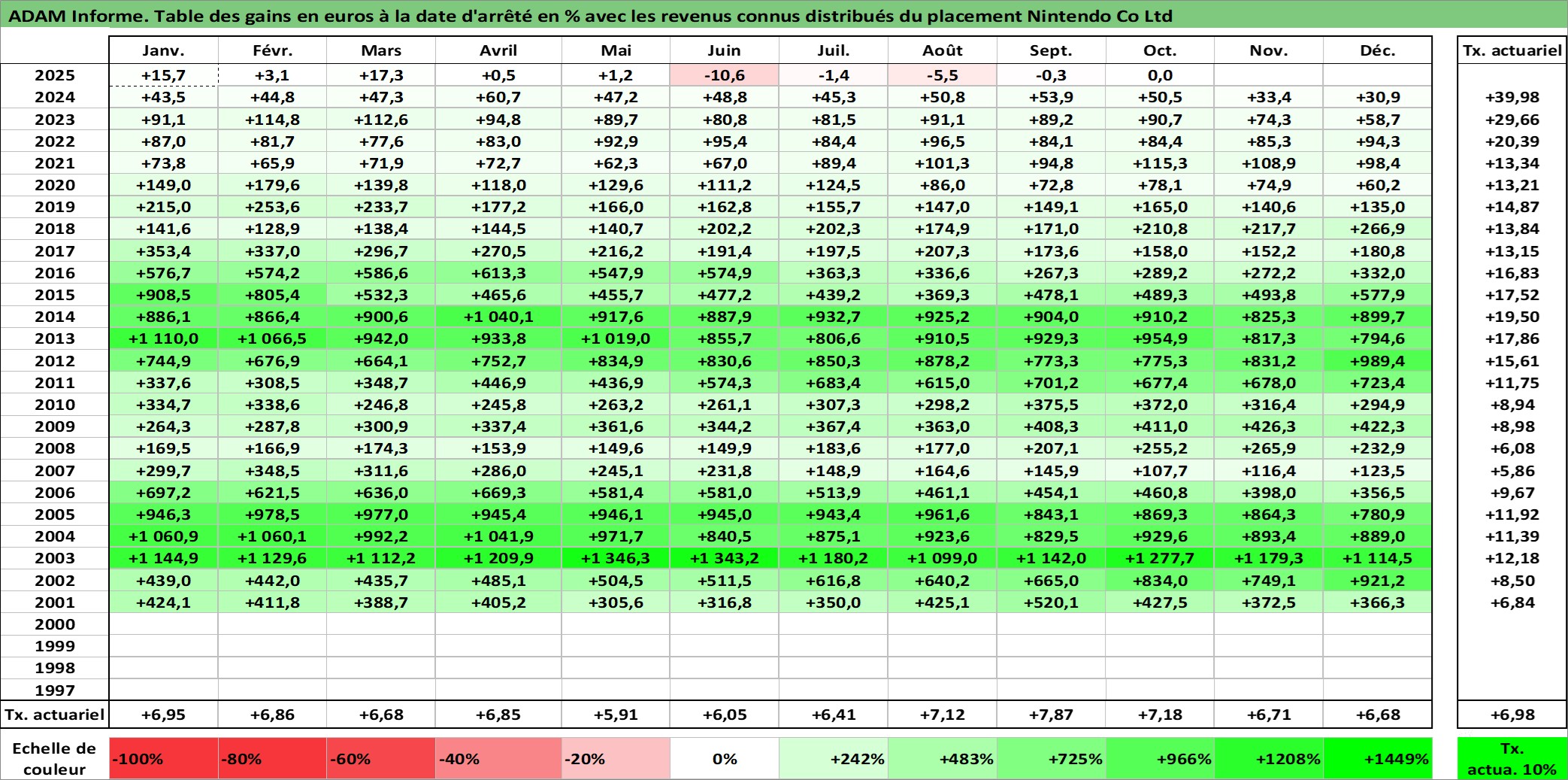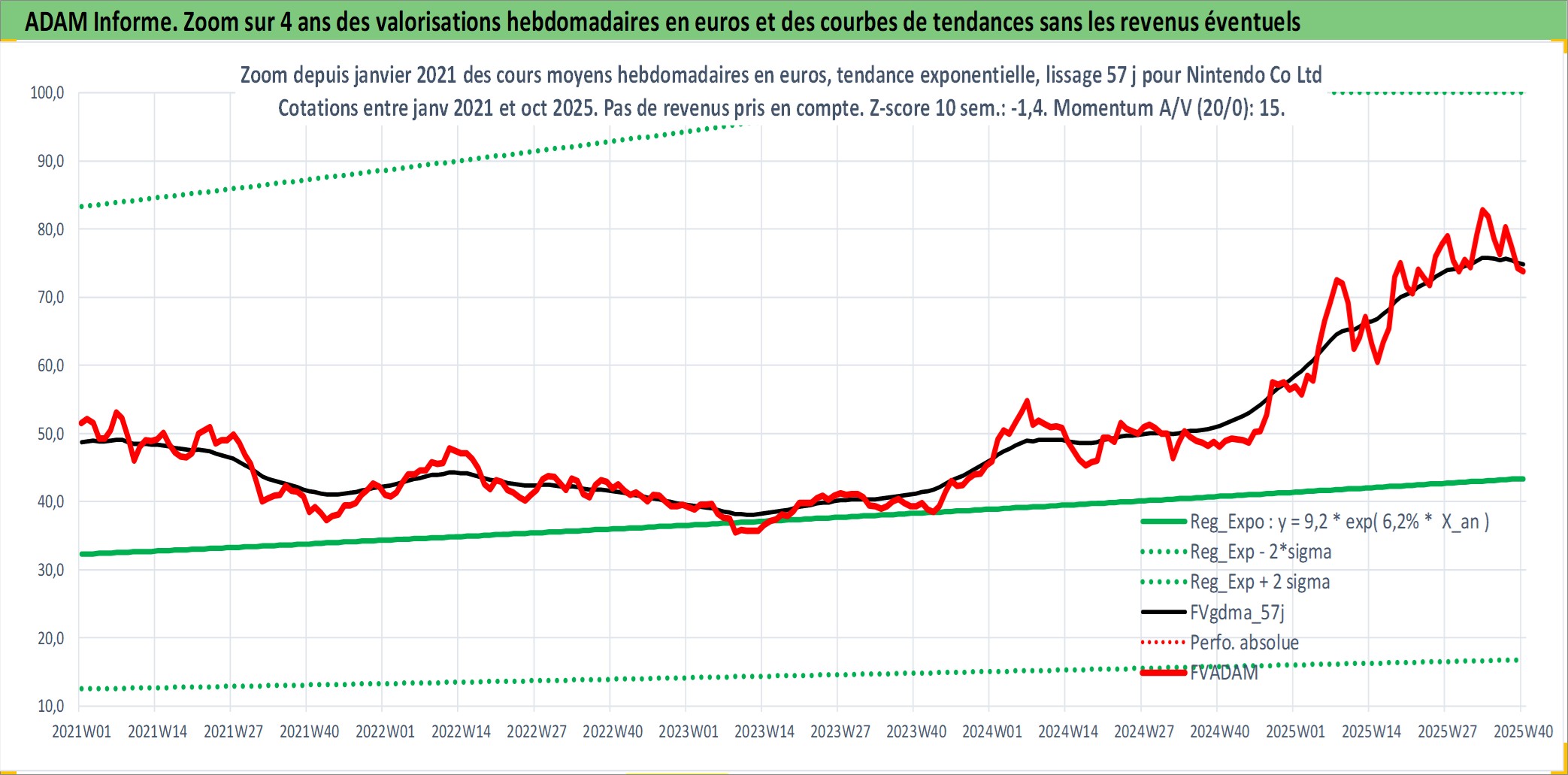 Site dédié aux investisseursPage dédiée sur site financeAnalyse des valorisations hebdomadaires de l'action Nintendo Co Ltd. Cet actif est cote en JPY. Les valorisations sont en contrevaleur EURO et couvrent les semaines 2001W01 a 2025W40. Les revenus de cet actif financier sont pris en compte depuis la semaine 2001W13. La note globale ESG de cet actif est estimee a 12.0 (apres rebasage entre 0 et 20).