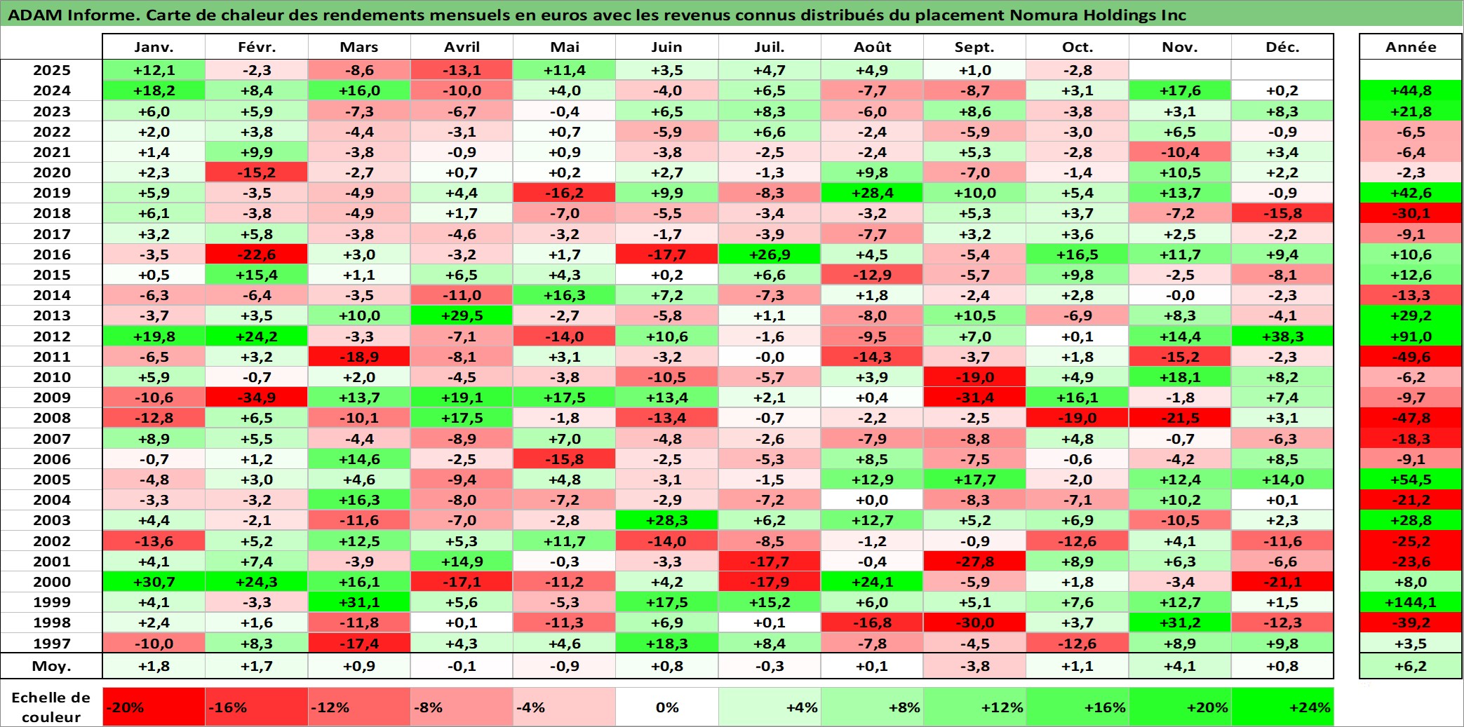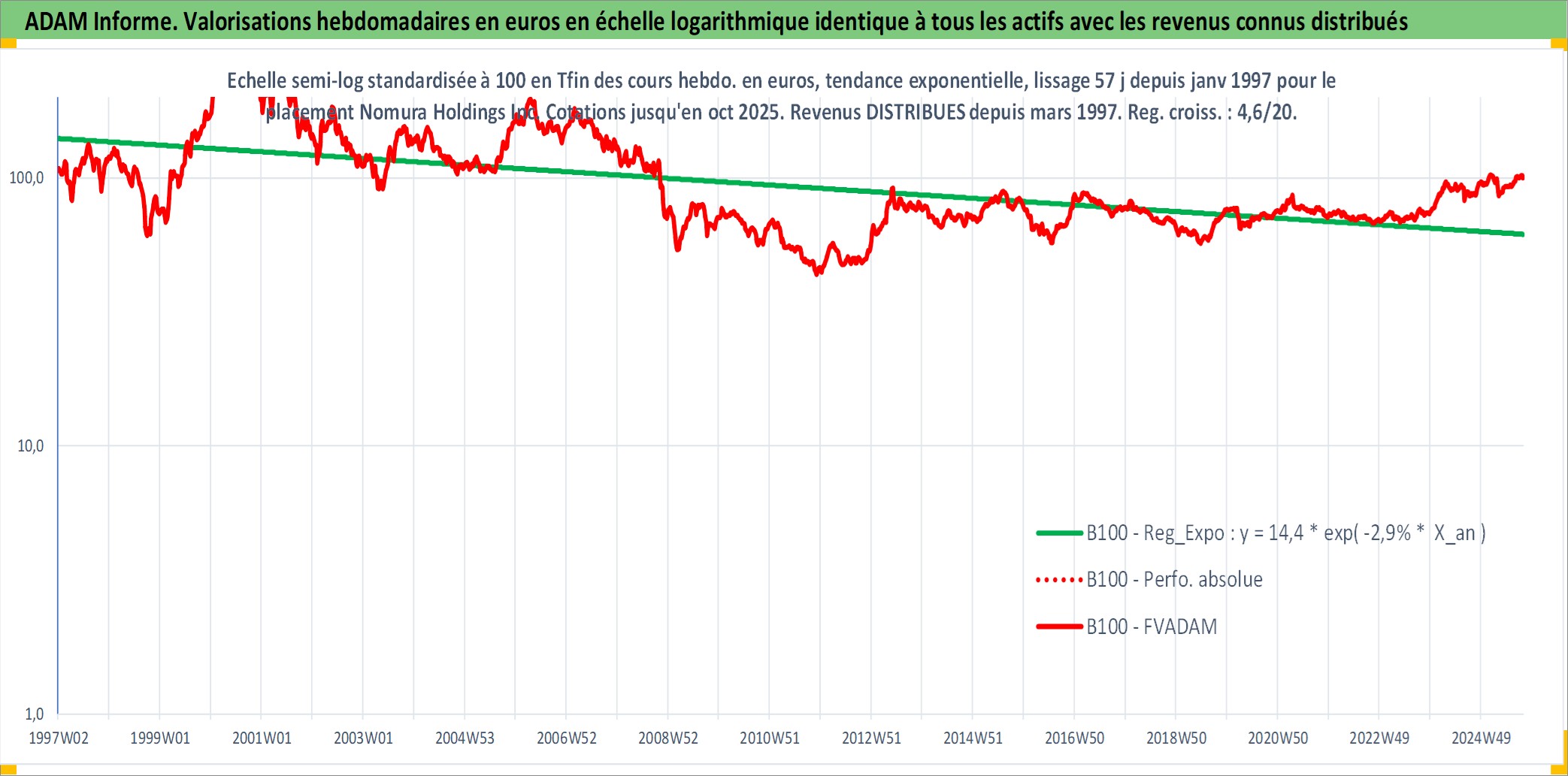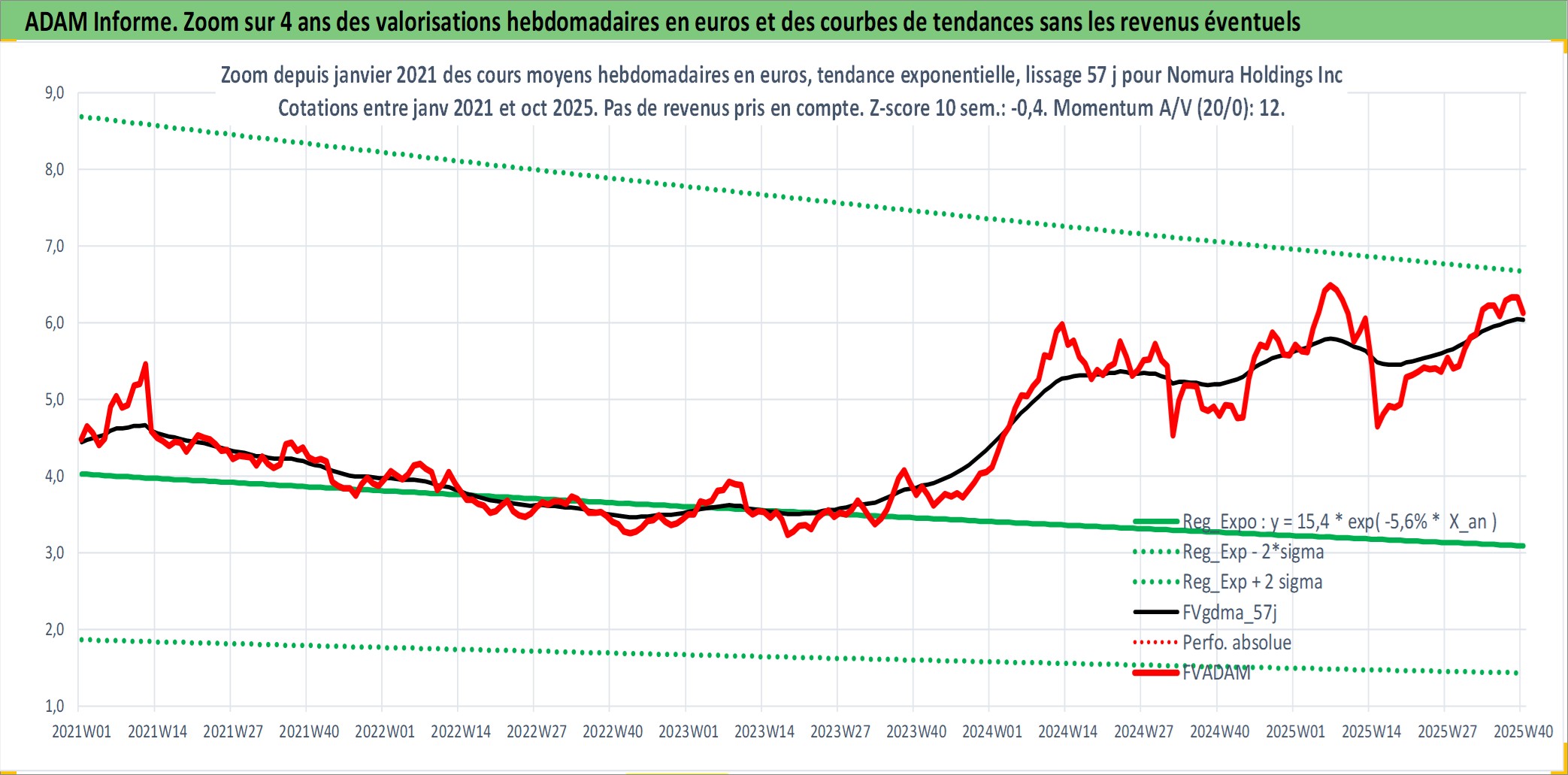 Site dédié aux investisseursPage dédiée sur site financeAnalyse des valorisations hebdomadaires de l'action Nomura Holdings Inc. Cet actif est cote en JPY. Les valorisations sont en contrevaleur EURO et couvrent les semaines 1997W01 a 2025W40. Les revenus de cet actif financier sont pris en compte depuis la semaine 1997W13. La note globale ESG de cet actif est estimee a 10.0 (apres rebasage entre 0 et 20).