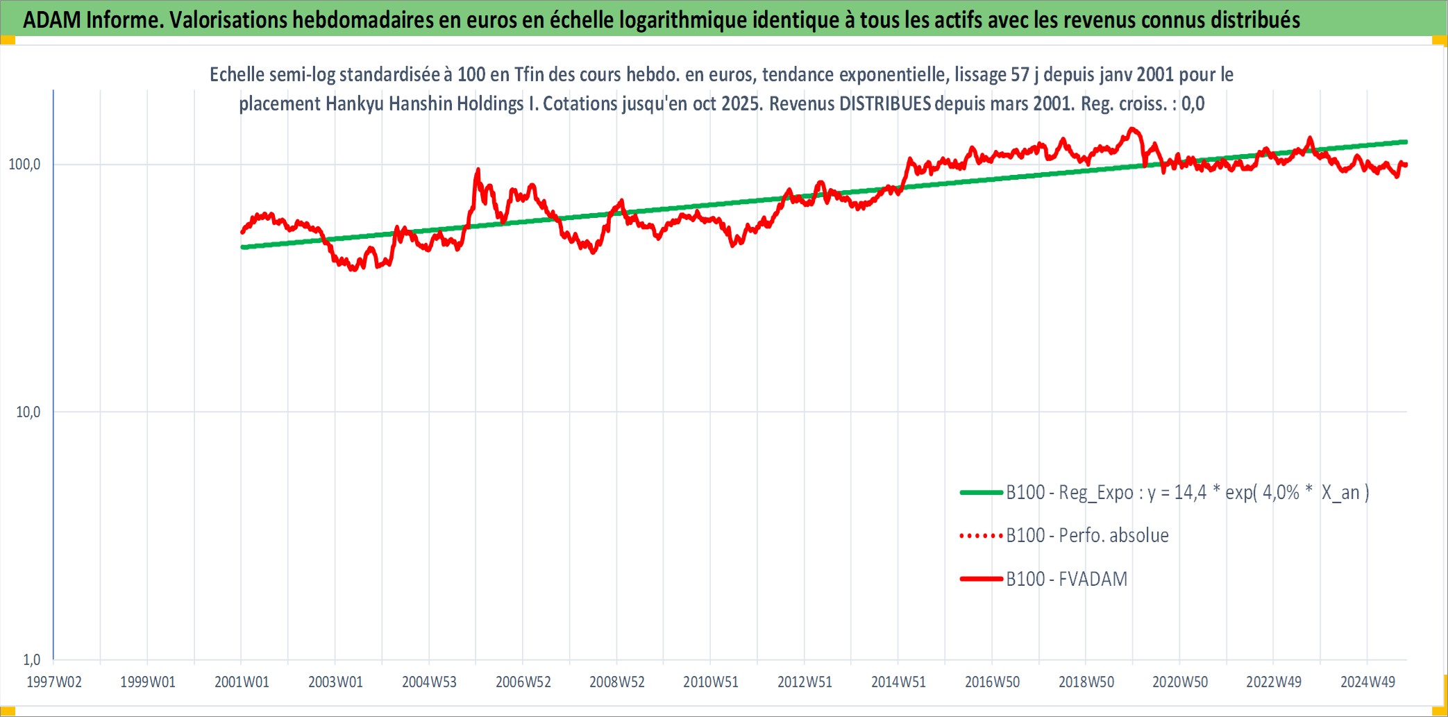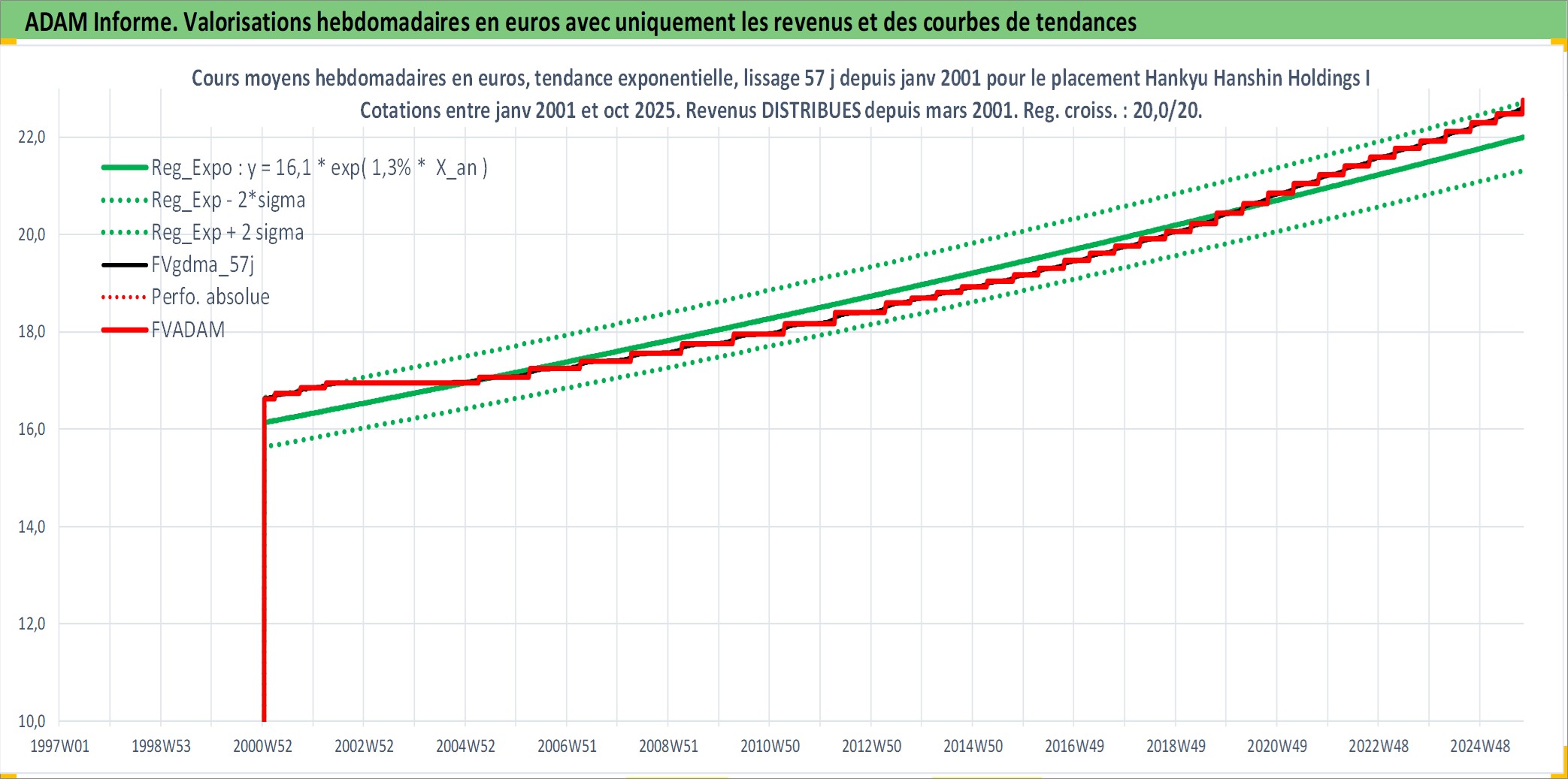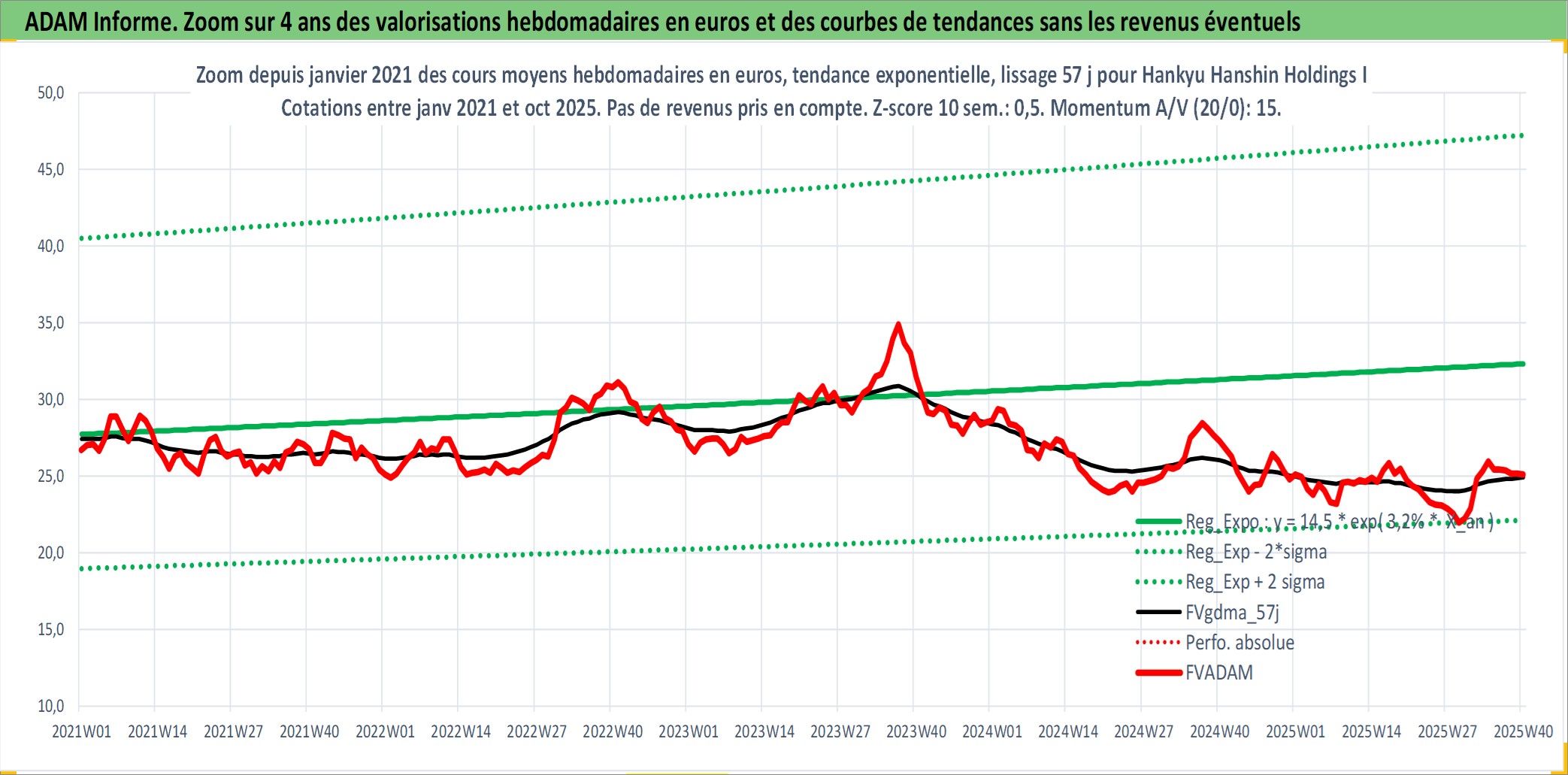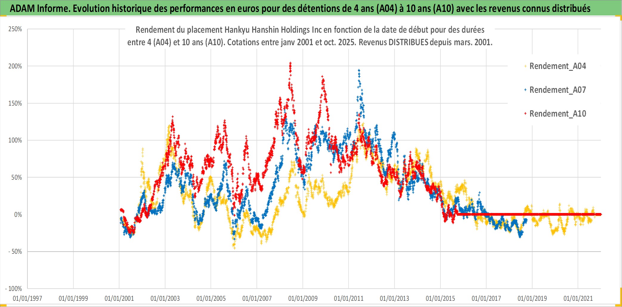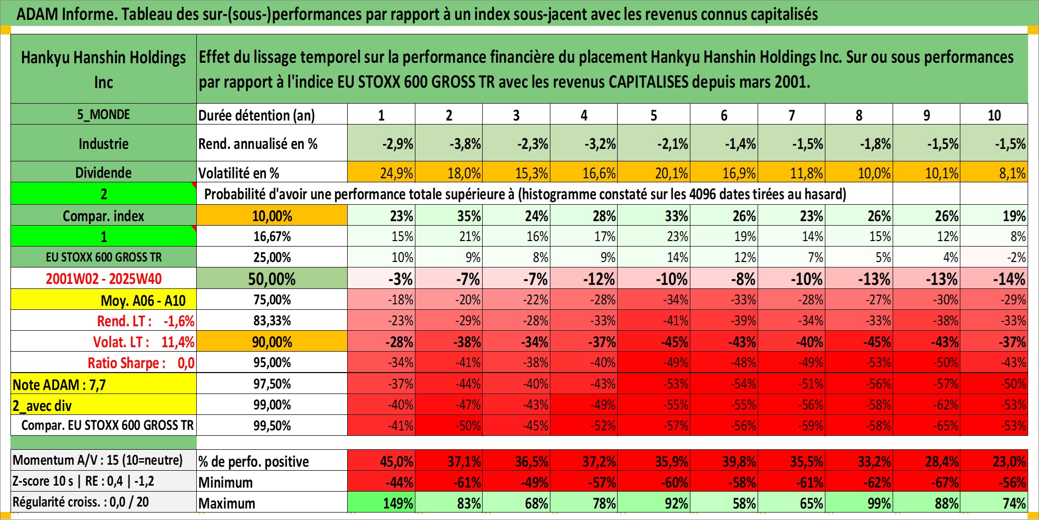 Site dédié aux investisseursPage dédiée sur site financeAnalyse des valorisations hebdomadaires de l'action Hankyu Hanshin Holdings Inc. Cet actif est cote en JPY. Les valorisations sont en contrevaleur EURO et couvrent les semaines 2001W02 a 2025W40. Les revenus de cet actif financier sont pris en compte depuis la semaine 2001W13. La note globale ESG de cet actif est estimee a 6.0 (apres rebasage entre 0 et 20).