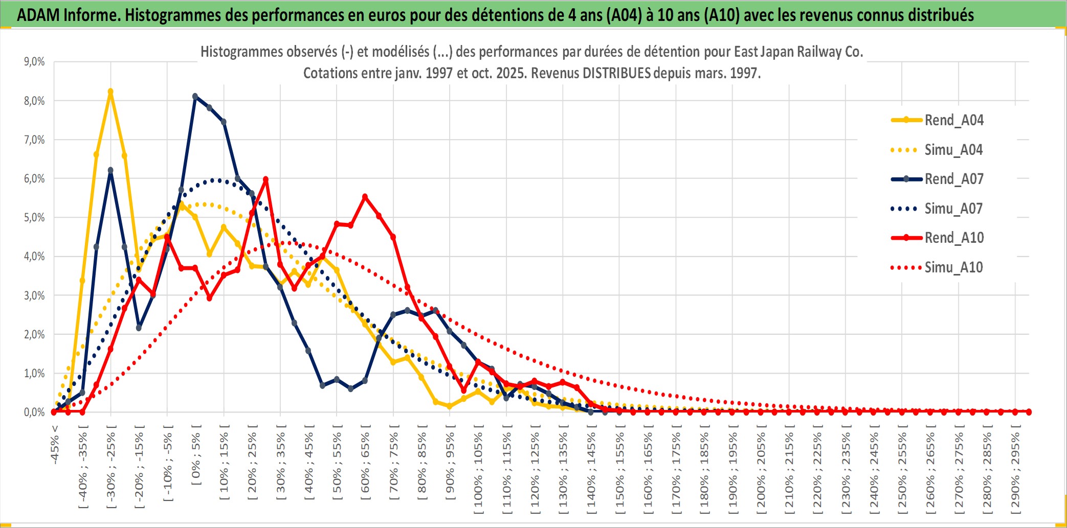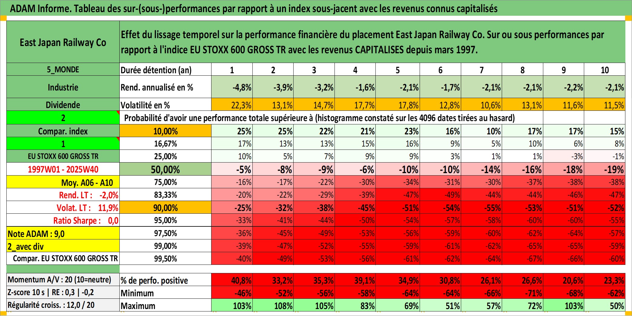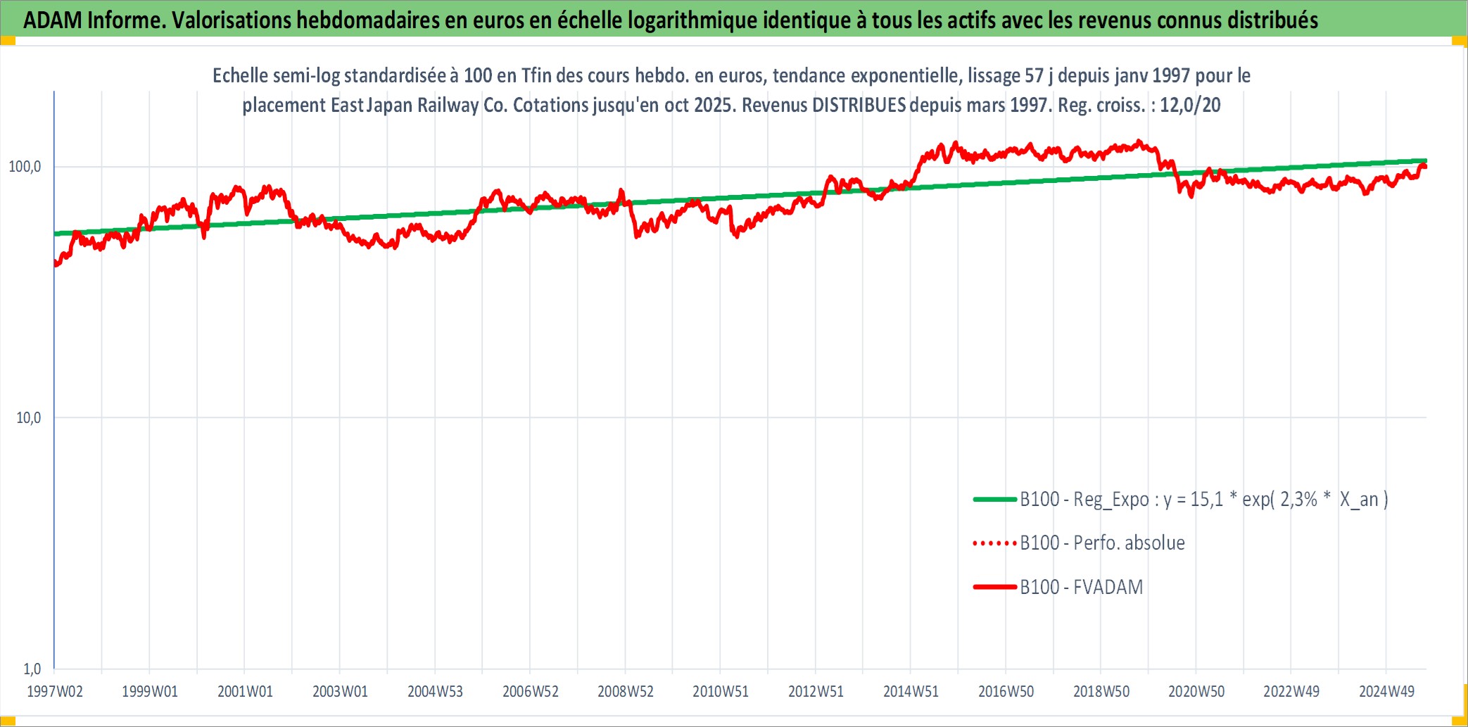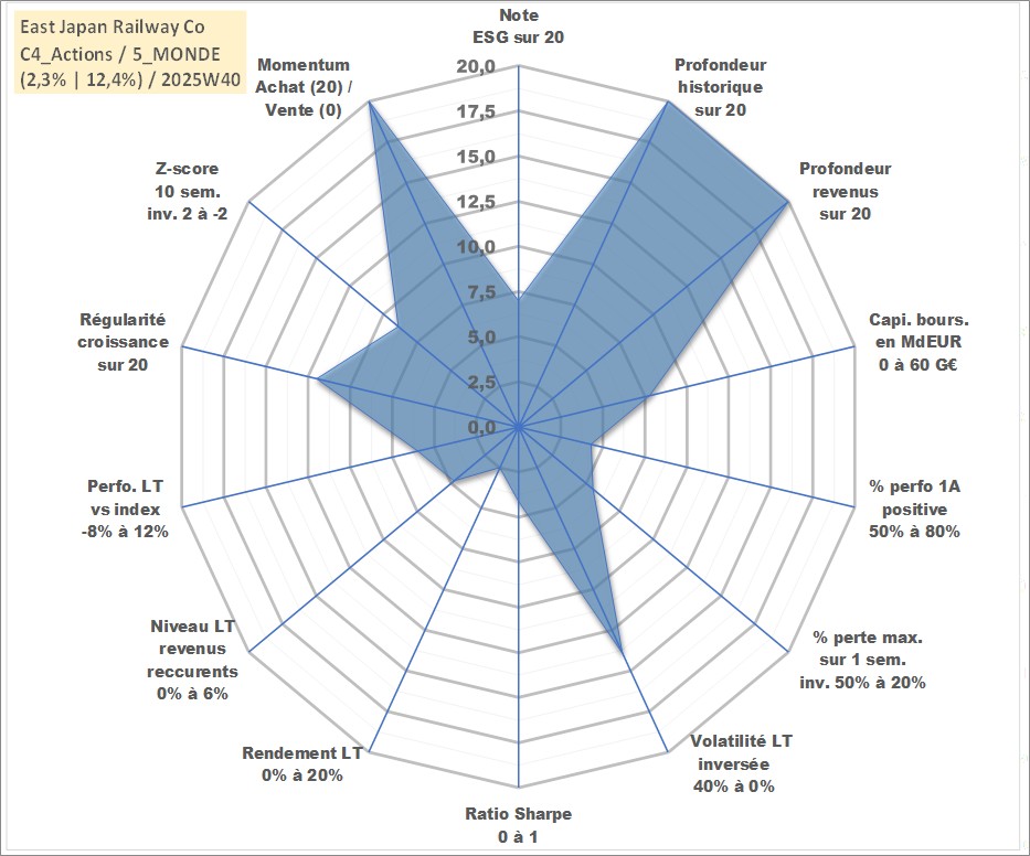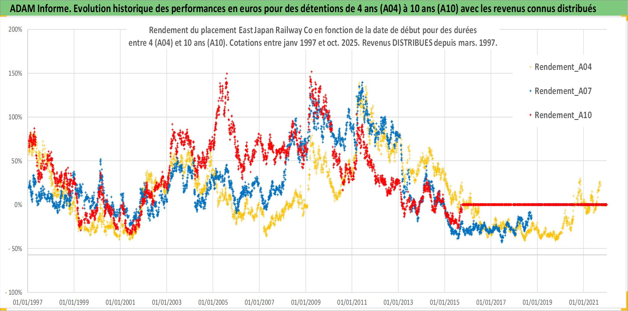 Site dédié aux investisseursPage dédiée sur site financeAnalyse des valorisations hebdomadaires de l'action East Japan Railway Co. Cet actif est cote en JPY. Les valorisations sont en contrevaleur EURO et couvrent les semaines 1997W01 a 2025W40. Les revenus de cet actif financier sont pris en compte depuis la semaine 1997W13. La note globale ESG de cet actif est estimee a 7.0 (apres rebasage entre 0 et 20).