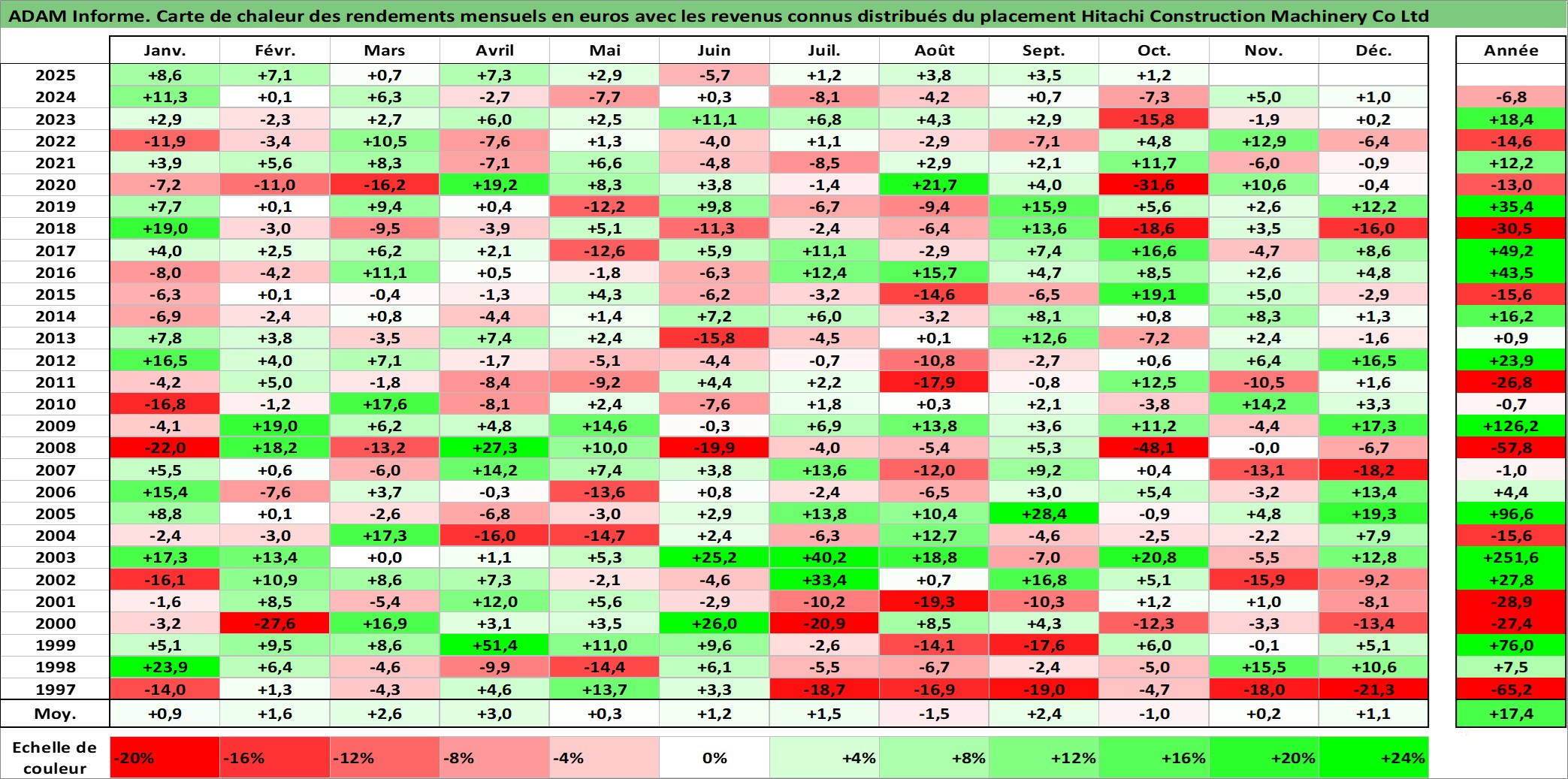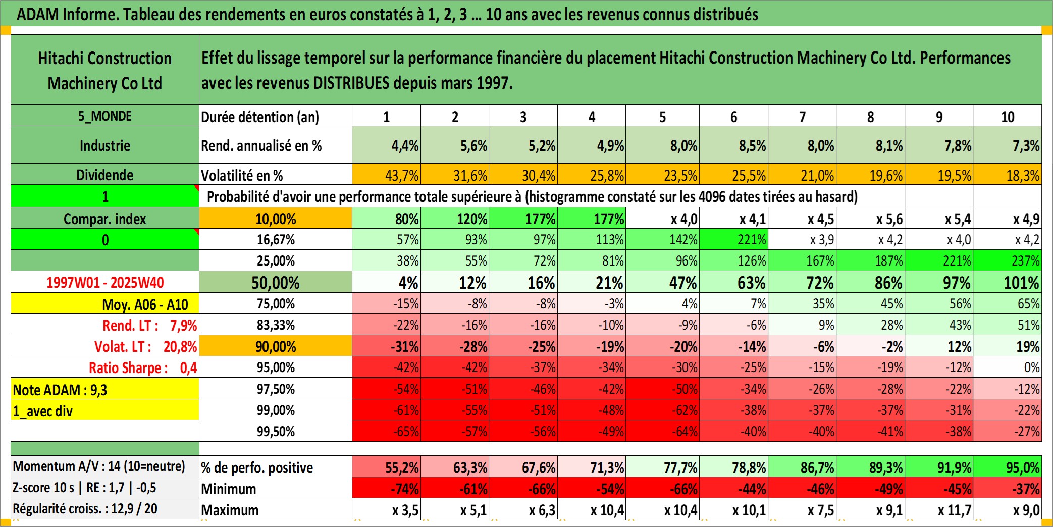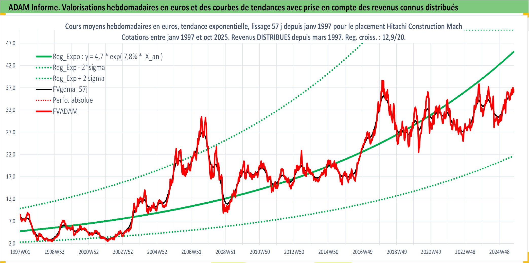 Site dédié aux investisseursPage dédiée sur site financeAnalyse des valorisations hebdomadaires de l'action Hitachi Construction Machinery Co Ltd. Cet actif est cote en JPY. Les valorisations sont en contrevaleur EURO et couvrent les semaines 1997W01 a 2025W40. Les revenus de cet actif financier sont pris en compte depuis la semaine 1997W13. La note ESG de cet actif n'est pas connue.