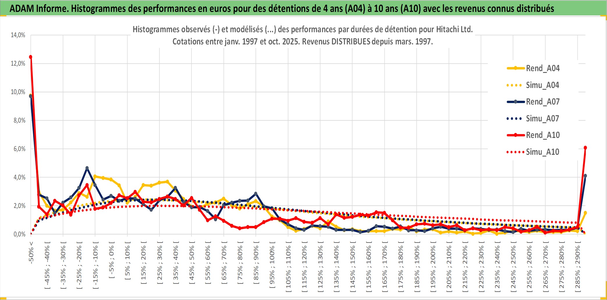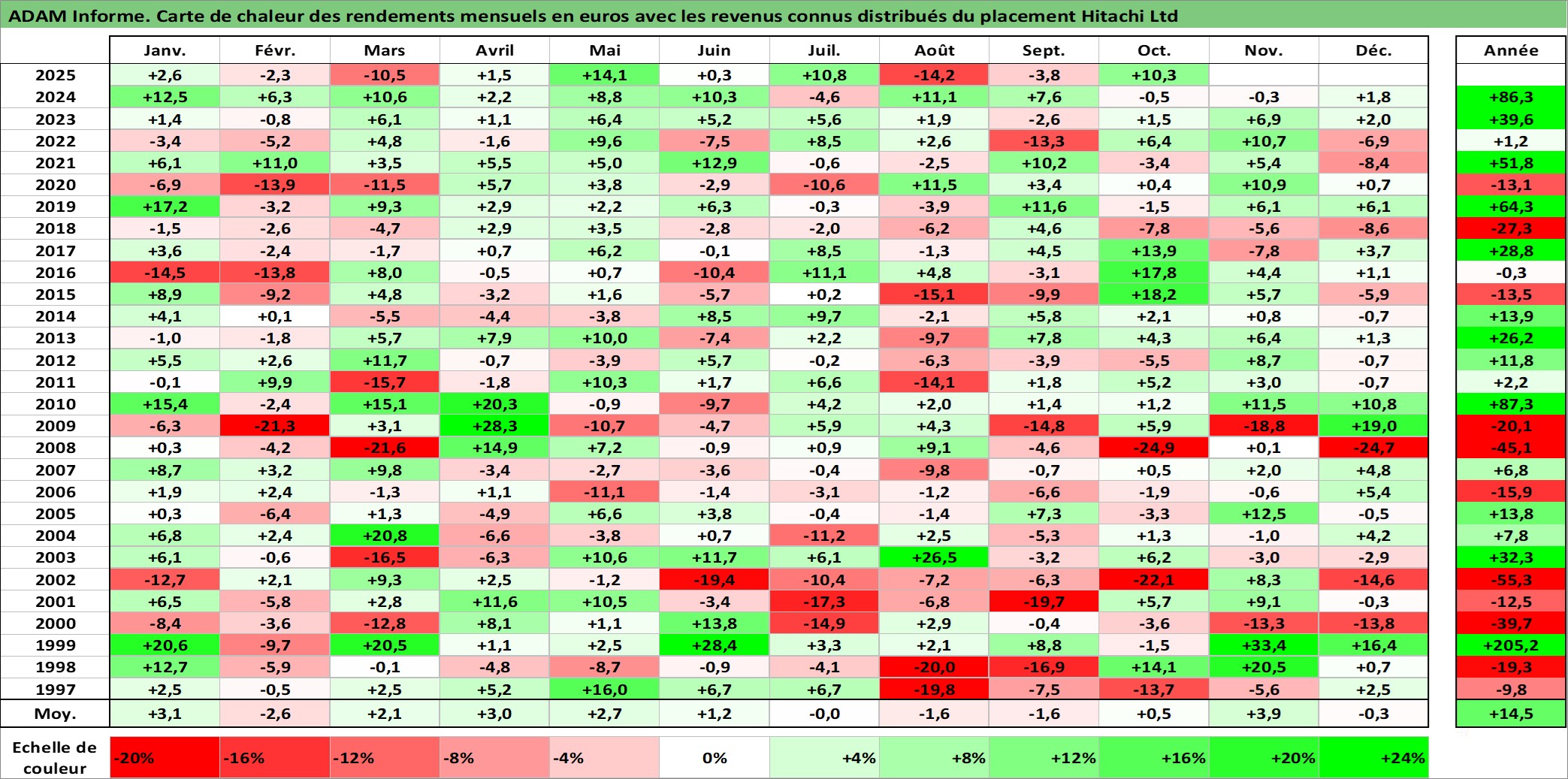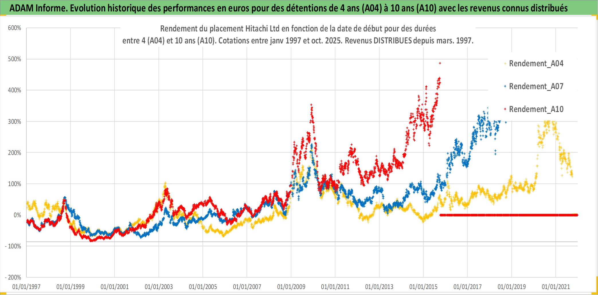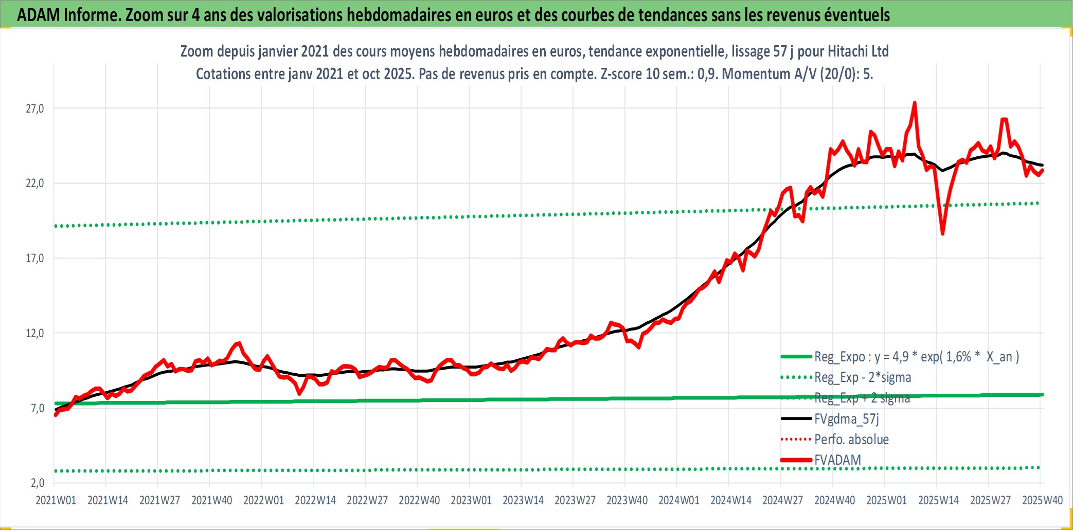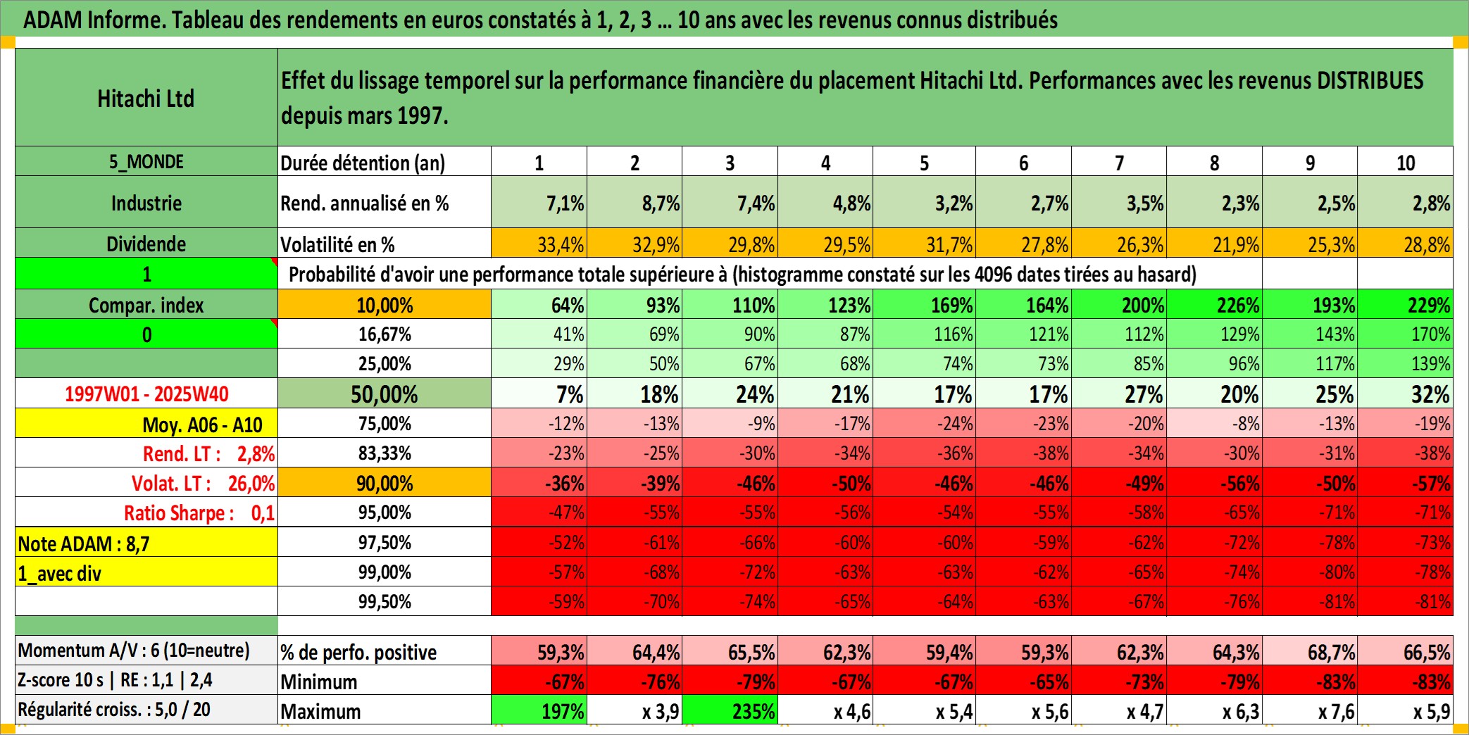 Site dédié aux investisseursPage dédiée sur site financeAnalyse des valorisations hebdomadaires de l'action Hitachi Ltd. Cet actif est cote en JPY. Les valorisations sont en contrevaleur EURO et couvrent les semaines 1997W01 a 2025W40. Les revenus de cet actif financier sont pris en compte depuis la semaine 1997W13. La note globale ESG de cet actif est estimee a 4.0 (apres rebasage entre 0 et 20).