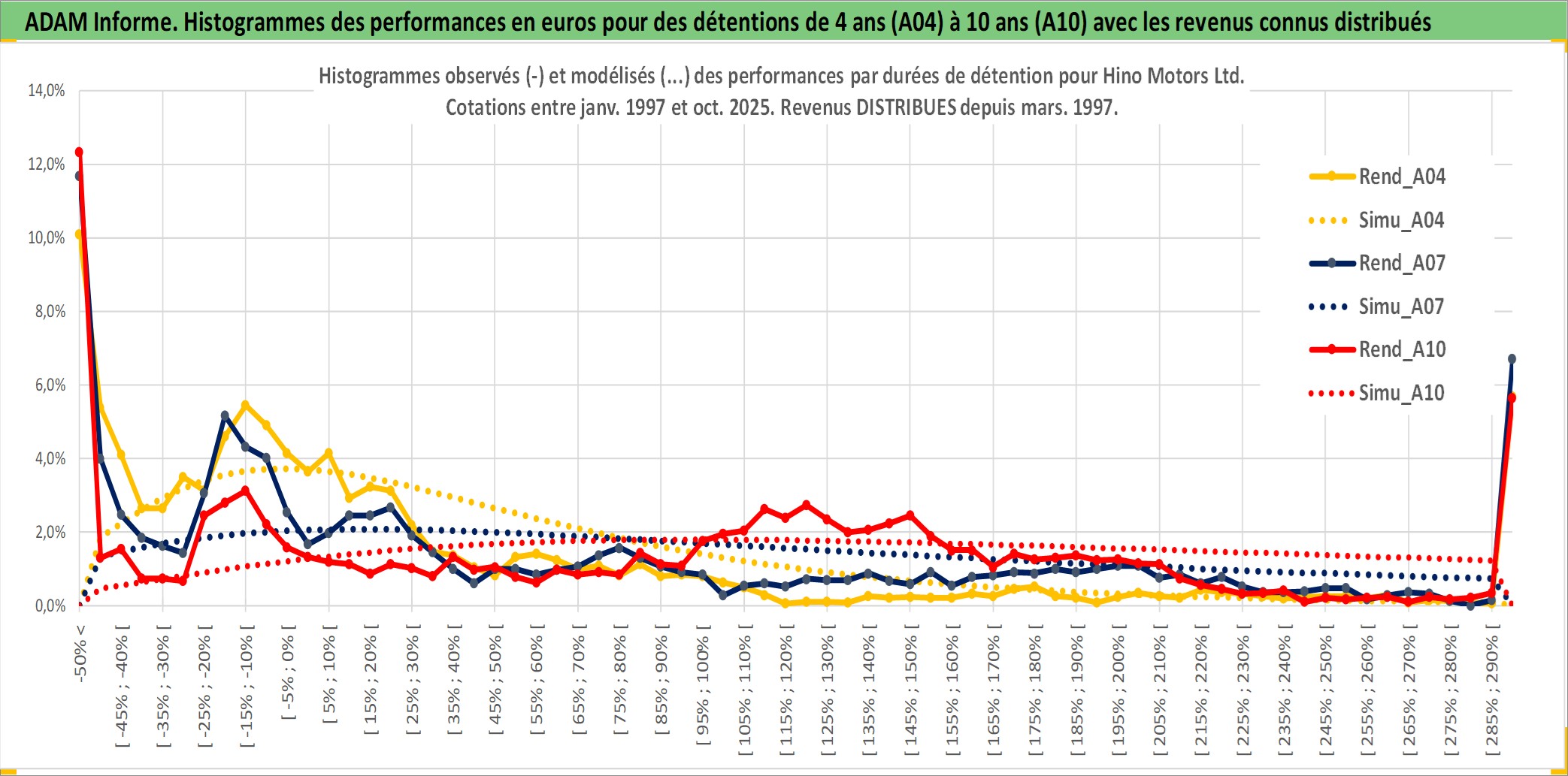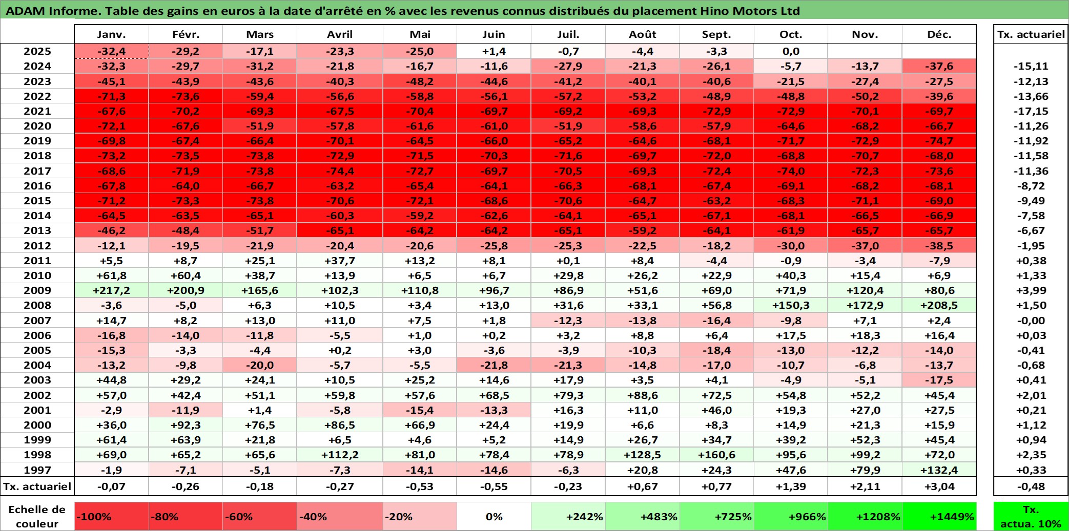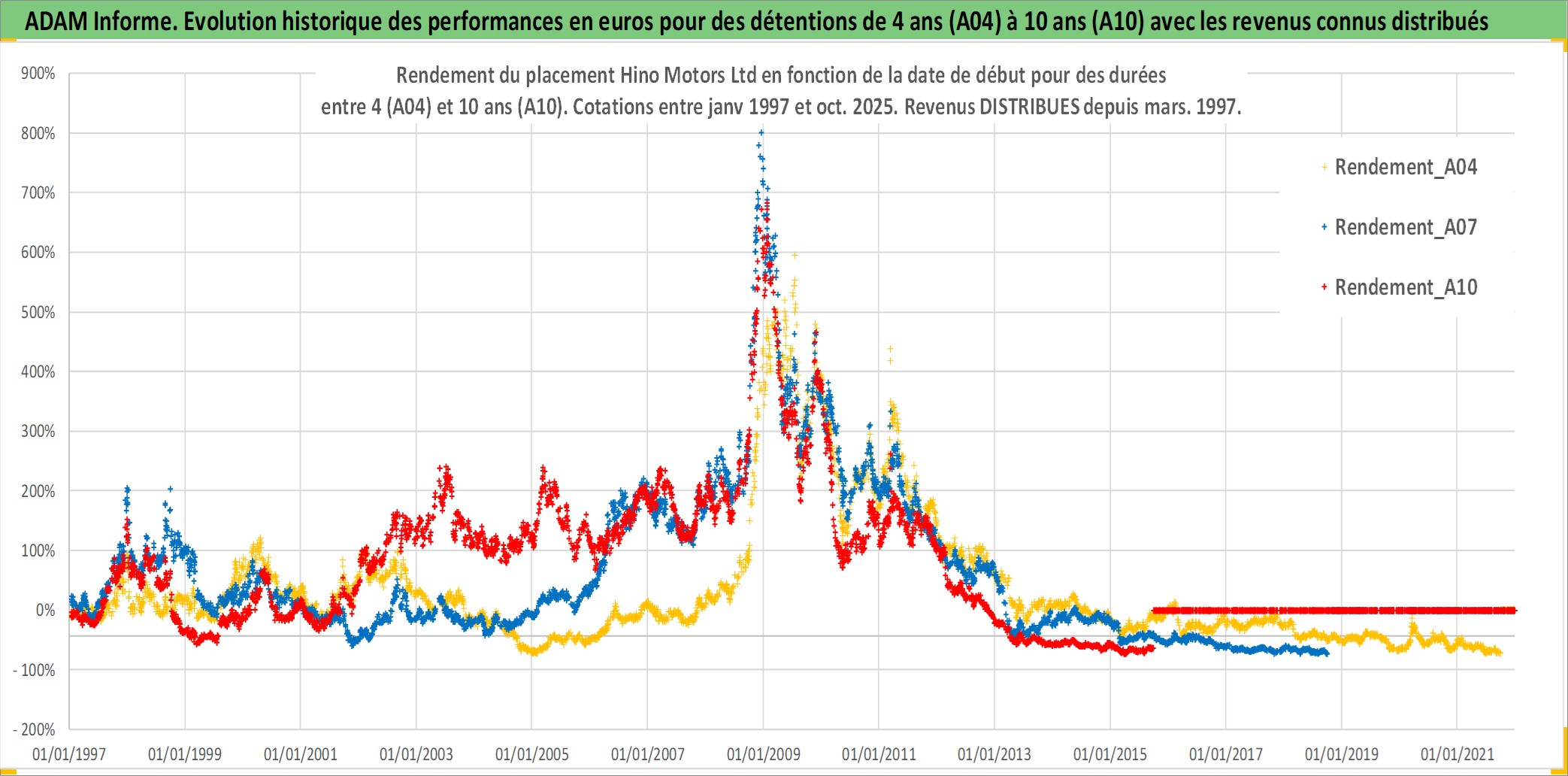 Site dédié aux investisseursPage dédiée sur site financeAnalyse des valorisations hebdomadaires de l'action Hino Motors Ltd. Cet actif est cote en JPY. Les valorisations sont en contrevaleur EURO et couvrent les semaines 1997W01 a 2025W40. Les revenus de cet actif financier sont pris en compte depuis la semaine 1997W13. La note globale ESG de cet actif est estimee a 4.0 (apres rebasage entre 0 et 20).