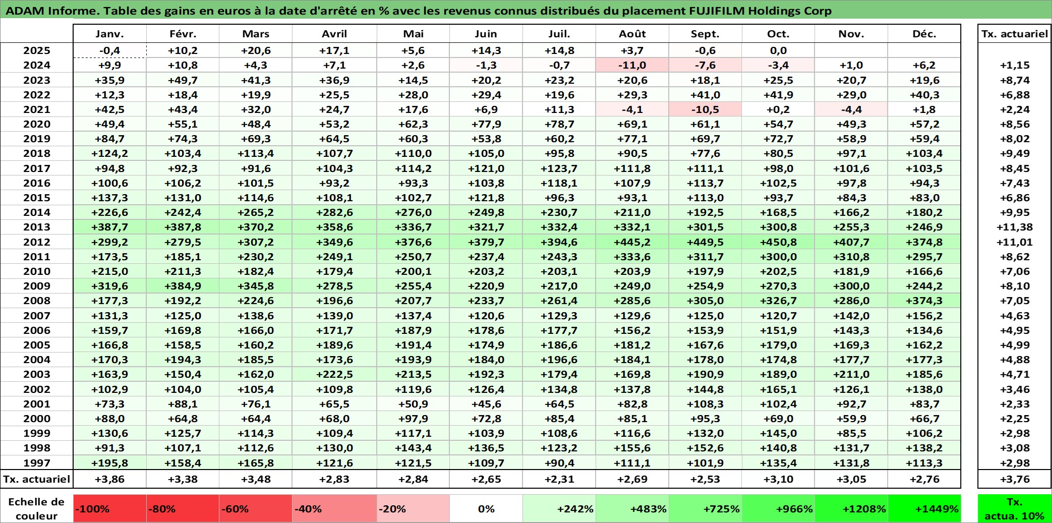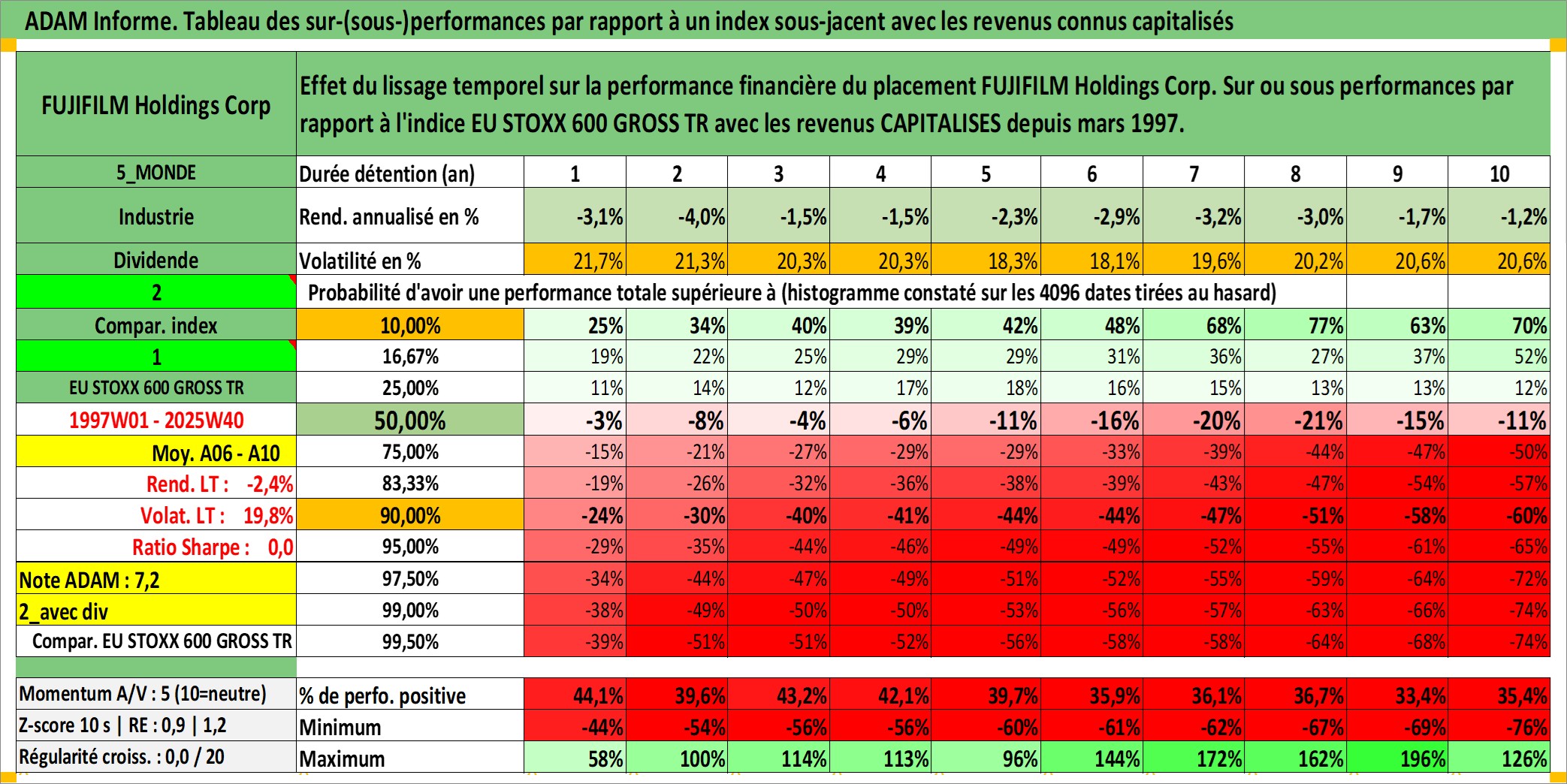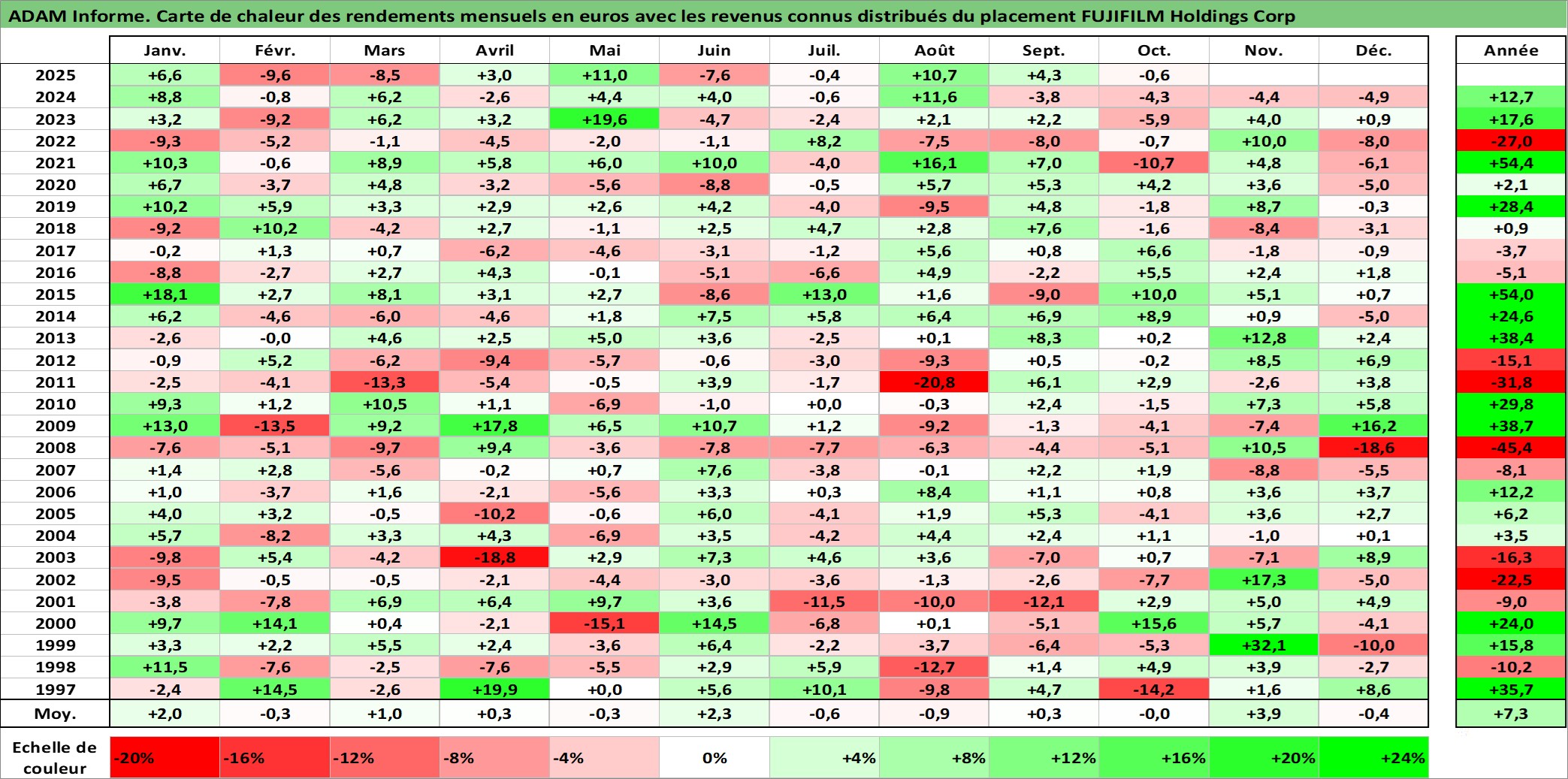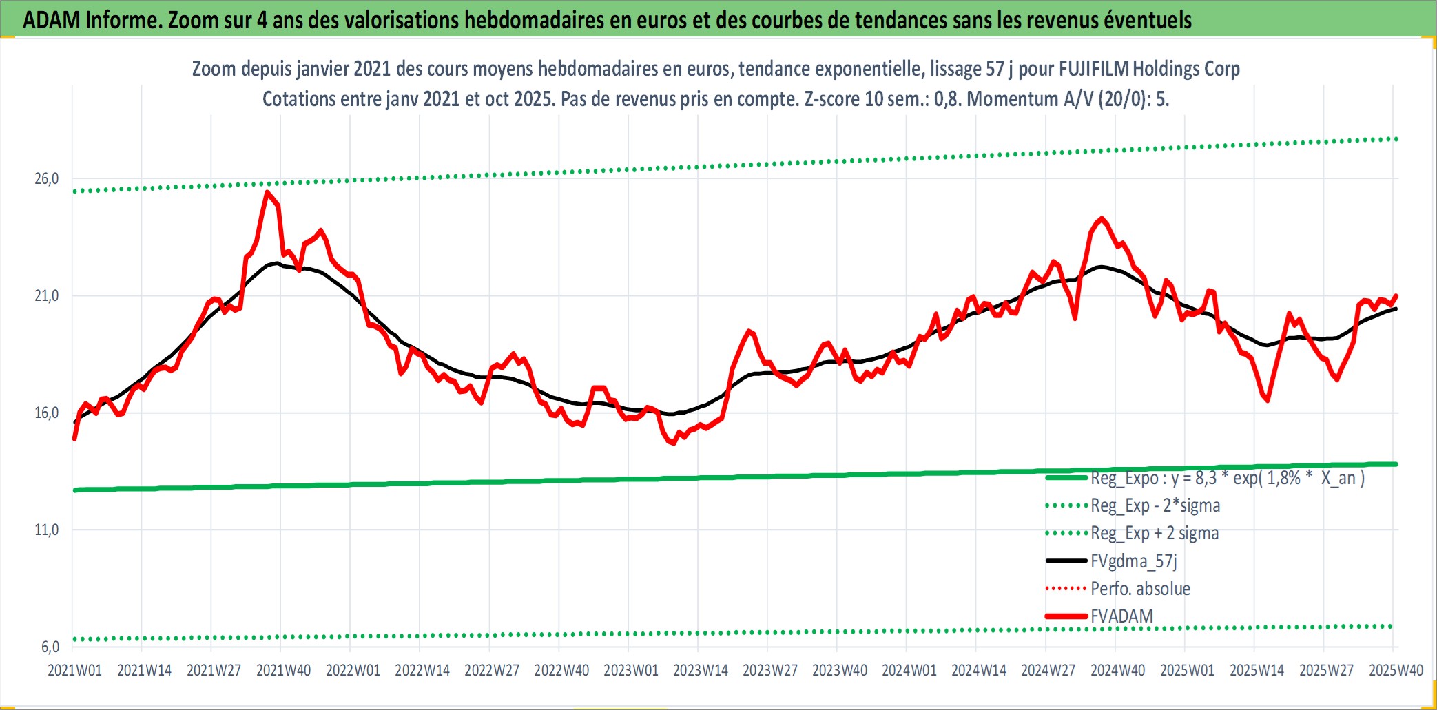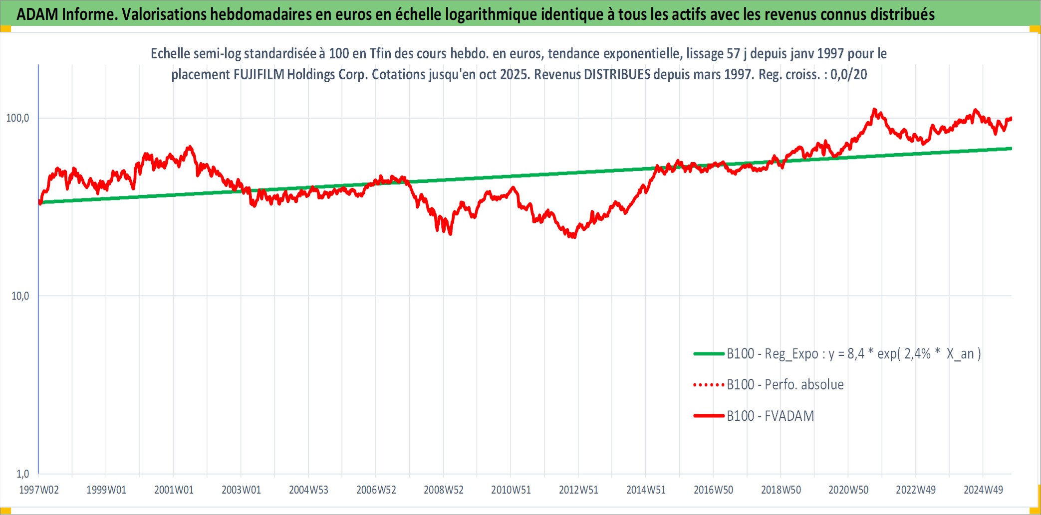 Site dédié aux investisseursPage dédiée sur site financeAnalyse des valorisations hebdomadaires de l'action FUJIFILM Holdings Corp. Cet actif est cote en JPY. Les valorisations sont en contrevaleur EURO et couvrent les semaines 1997W01 a 2025W40. Les revenus de cet actif financier sont pris en compte depuis la semaine 1997W13. La note globale ESG de cet actif est estimee a 12.0 (apres rebasage entre 0 et 20).