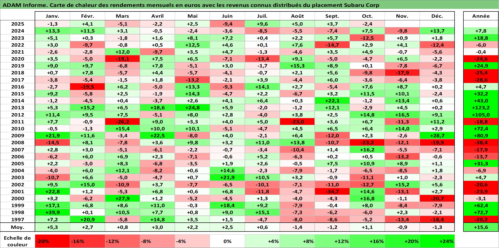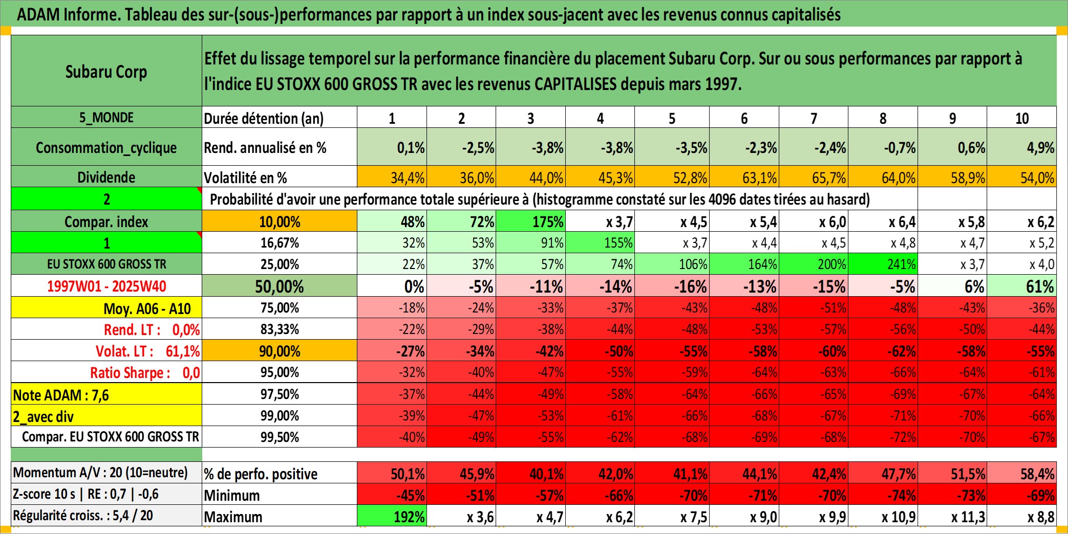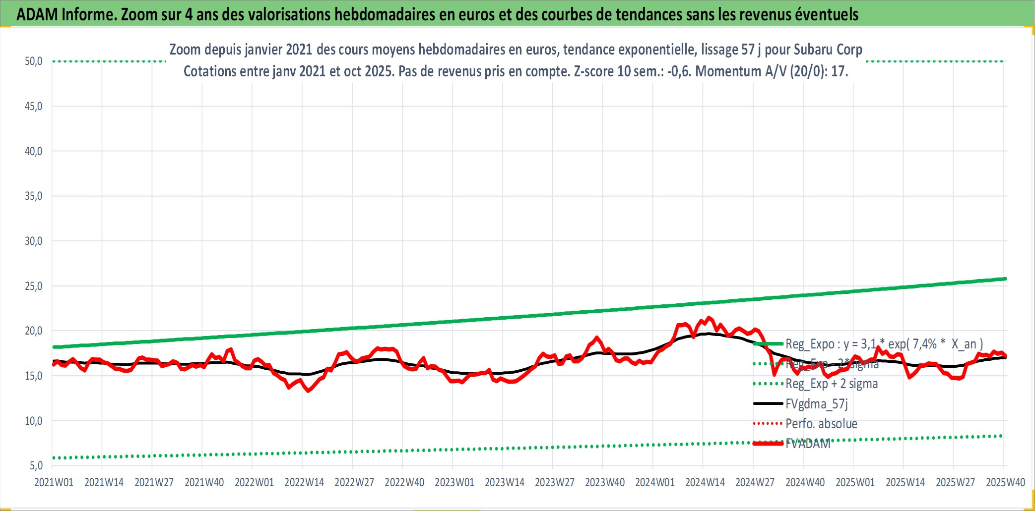 Site dédié aux investisseursPage dédiée sur site financeAnalyse des valorisations hebdomadaires de l'action Subaru Corp. Cet actif est cote en JPY. Les valorisations sont en contrevaleur EURO et couvrent les semaines 1997W01 a 2025W40. Les revenus de cet actif financier sont pris en compte depuis la semaine 1997W13. La note globale ESG de cet actif est estimee a 7.0 (apres rebasage entre 0 et 20).