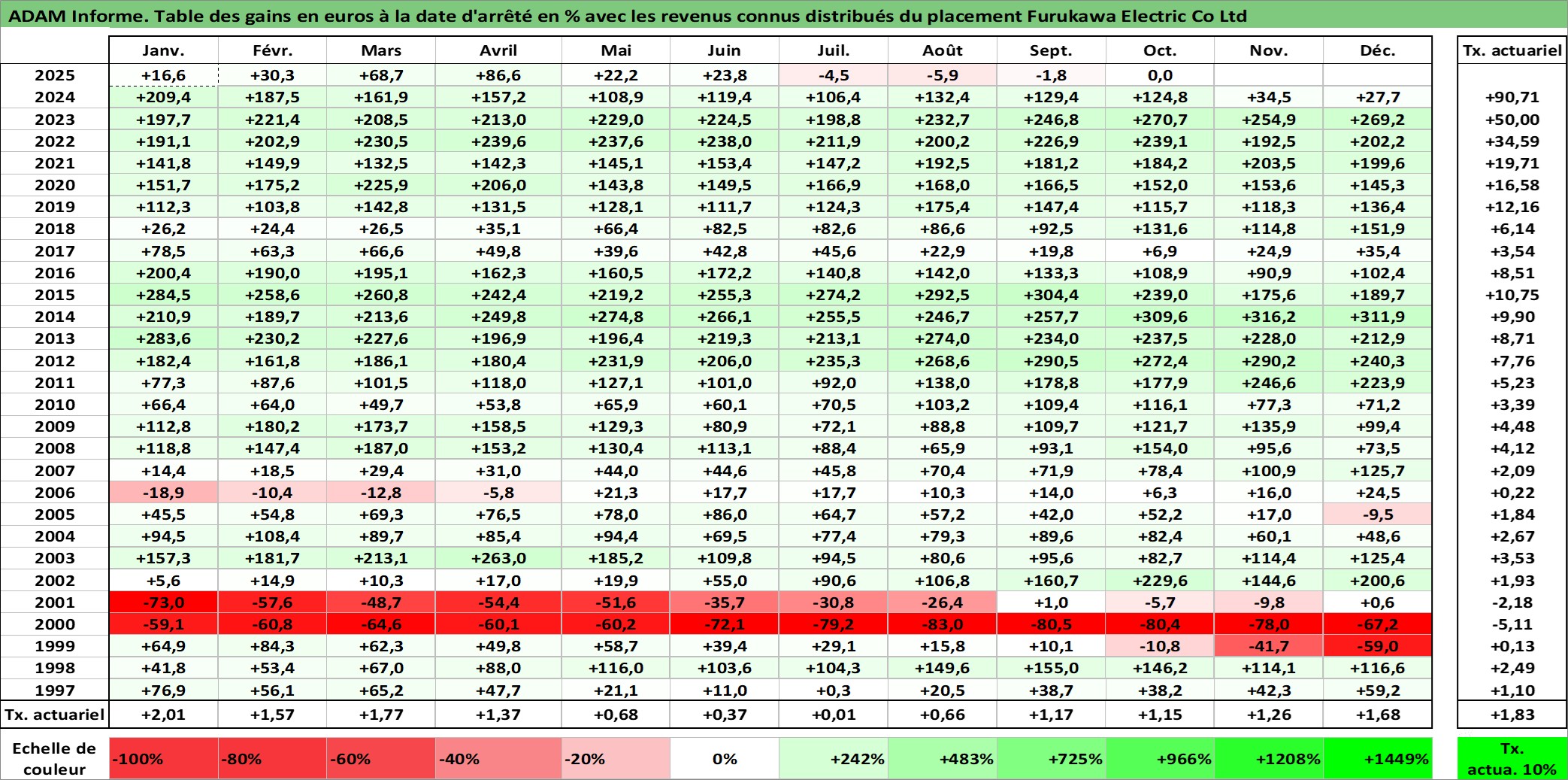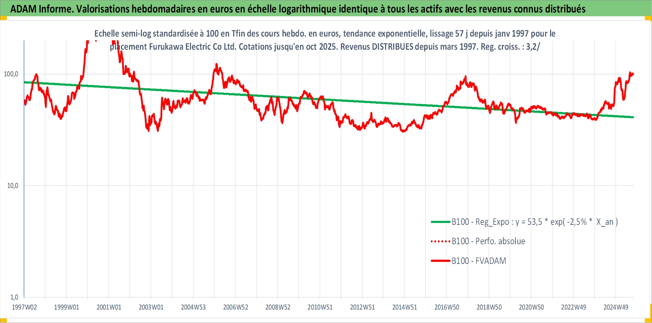 Site dédié aux investisseursPage dédiée sur site financeAnalyse des valorisations hebdomadaires de l'action Furukawa Electric Co Ltd. Cet actif est cote en JPY. Les valorisations sont en contrevaleur EURO et couvrent les semaines 1997W01 a 2025W40. Les revenus de cet actif financier sont pris en compte depuis la semaine 1997W13. La note ESG de cet actif n'est pas connue.